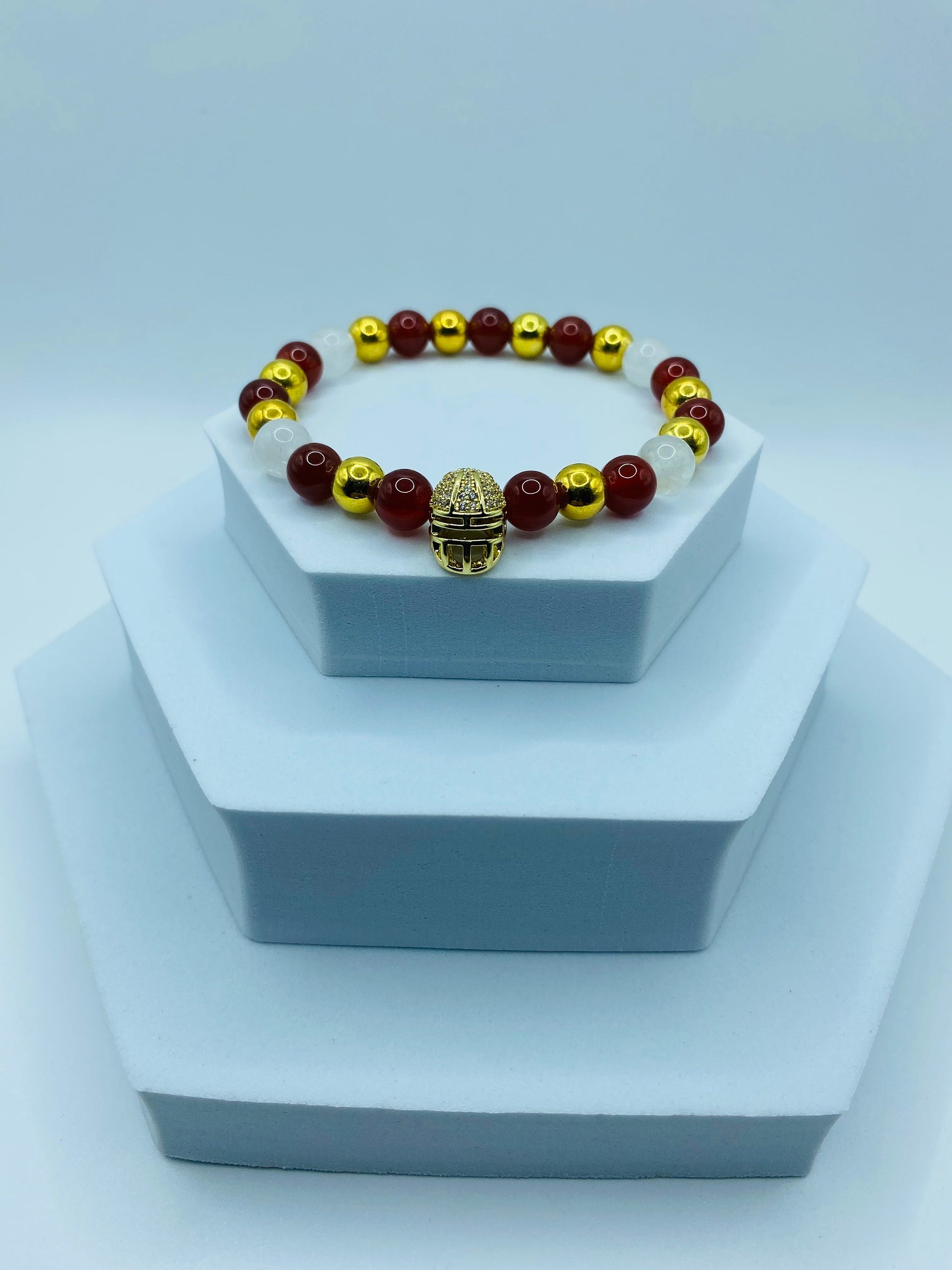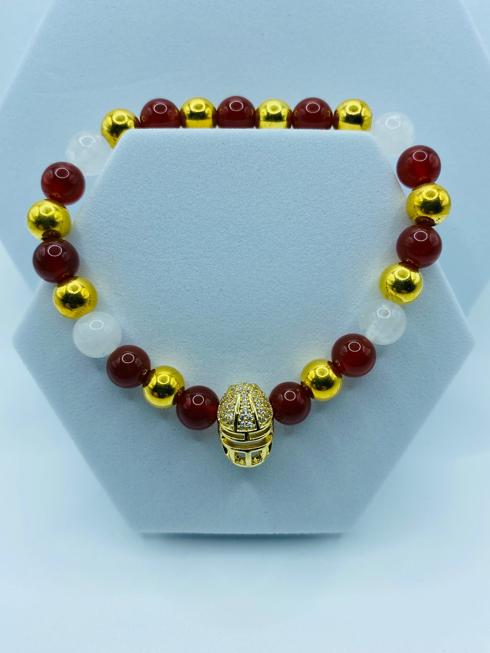 PRODUCT DETAILS - San Fransisco 49ers football team colors - 8mm 18k gold plated hematite gemstone beads - 8mm natural carnelian gemstone beads - 8mm natural white jade gemstone beads - Gold metallic plated football helmet charm with inlaid cubic zirconia crystals - Strong, stretchy cord - Handmade in a clean and safe environment