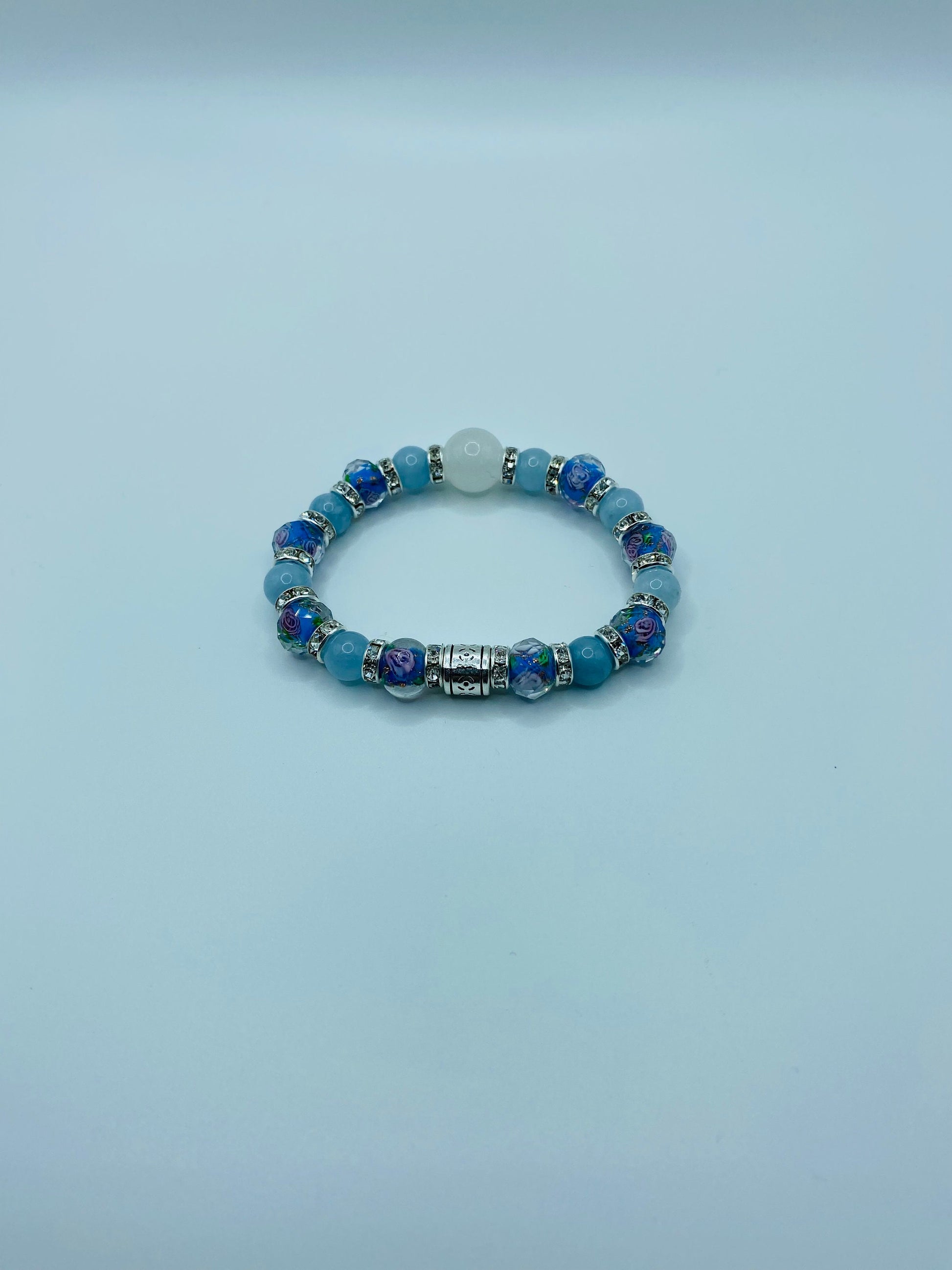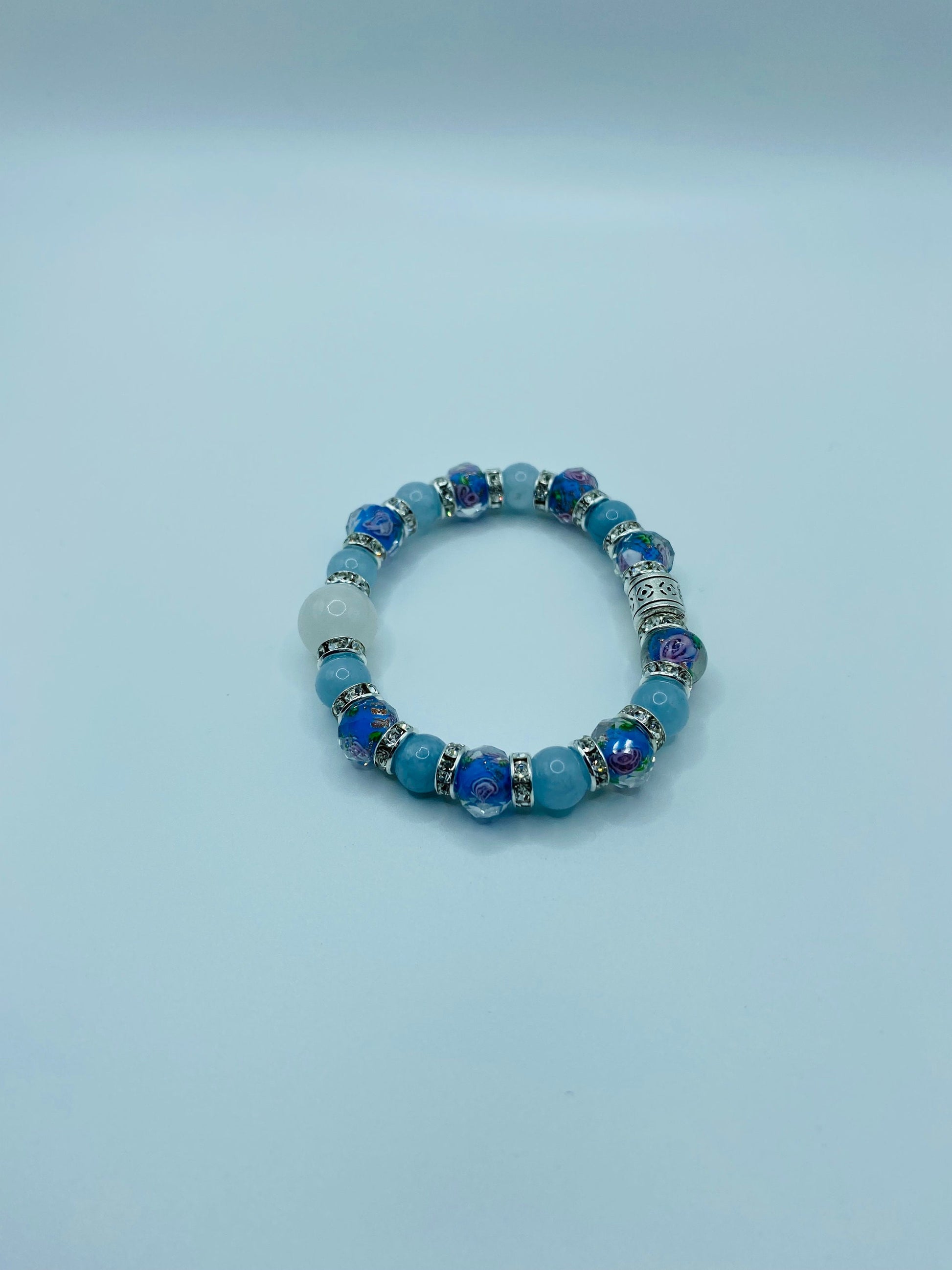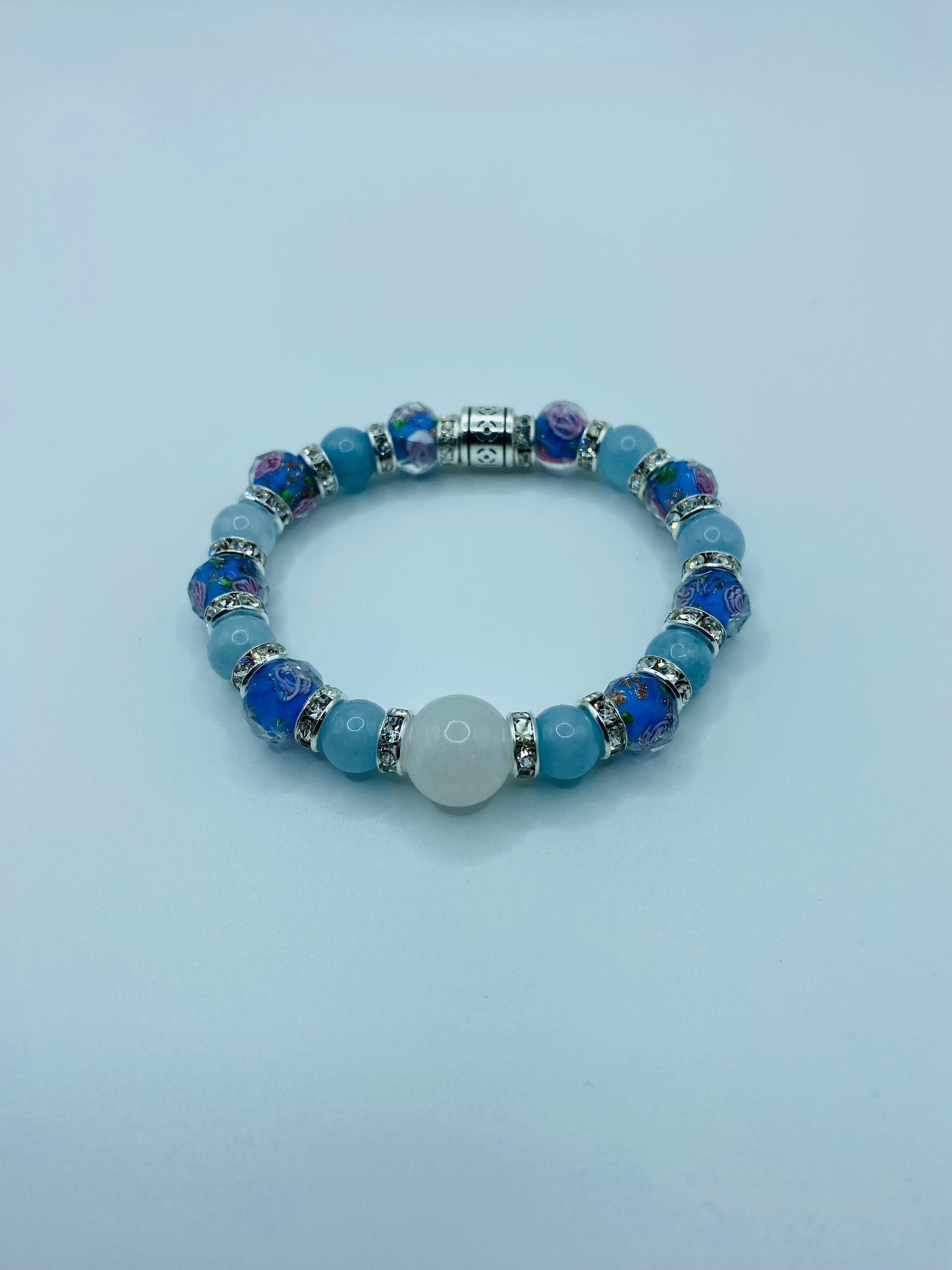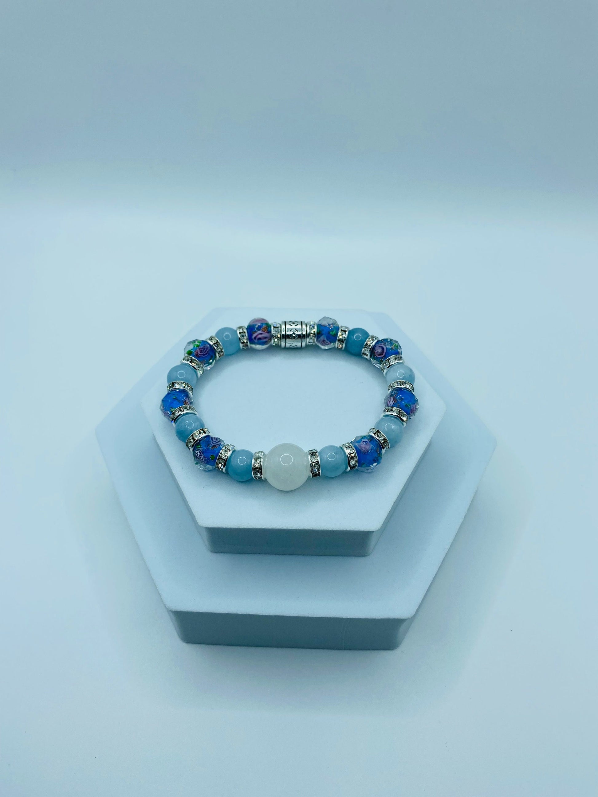 This stunning Aquamarine Bracelet features a beautiful Chalcedony Stone surrounded by exquisite Lampwork Glass Beads. The design is delicate and feminine, perfect for adding a touch of elegance to any outfit. This flower bracelet is a lovely addition to your jewelry collection and makes a thoughtful gift for women who appreciate unique and stylish accessories. Handcrafted with care, this bracelet is sure to make a statement wherever you go. this gorgeous accessory will add a pop of color to any outfit. A must-have for any bracelet lover!