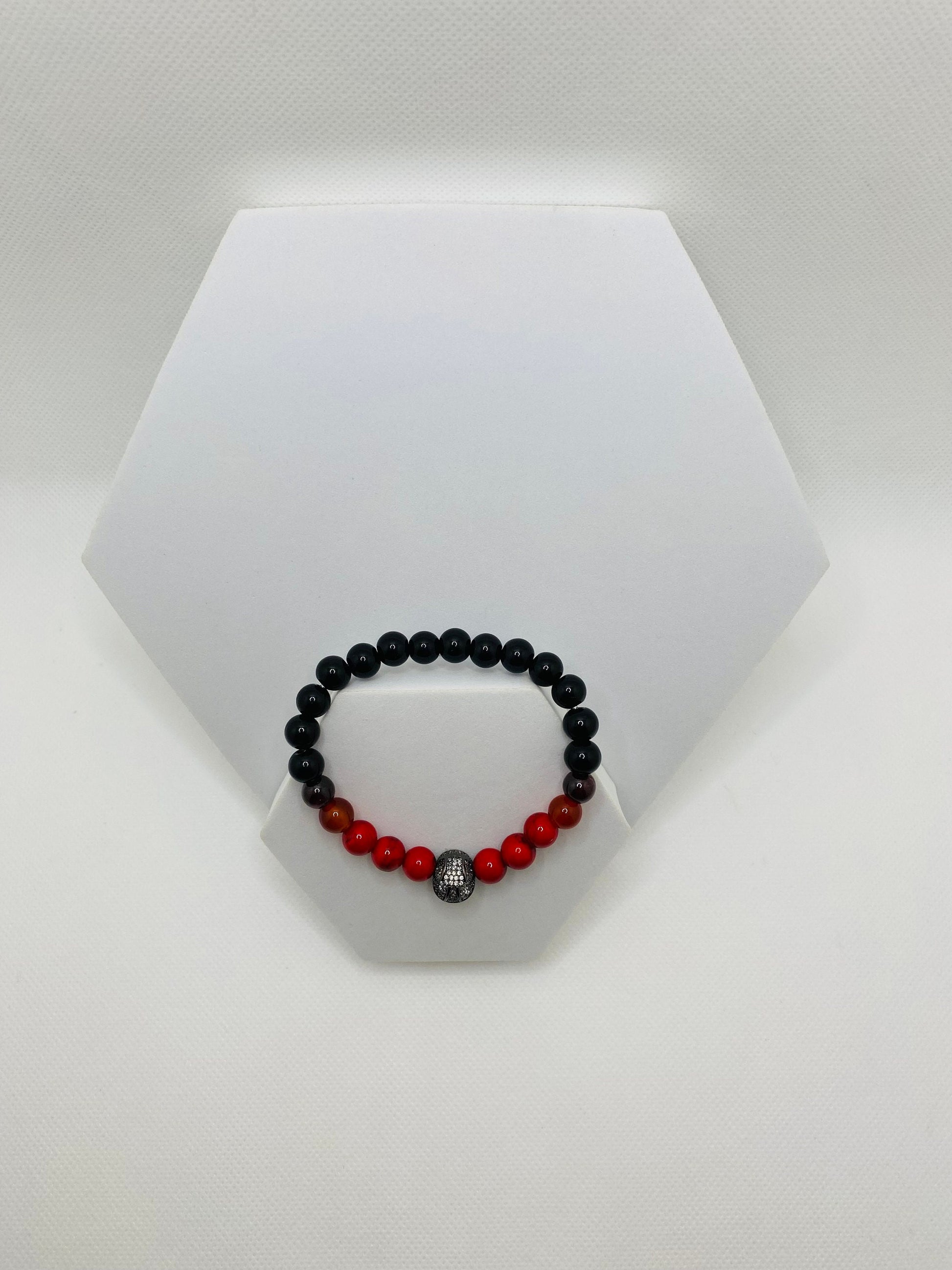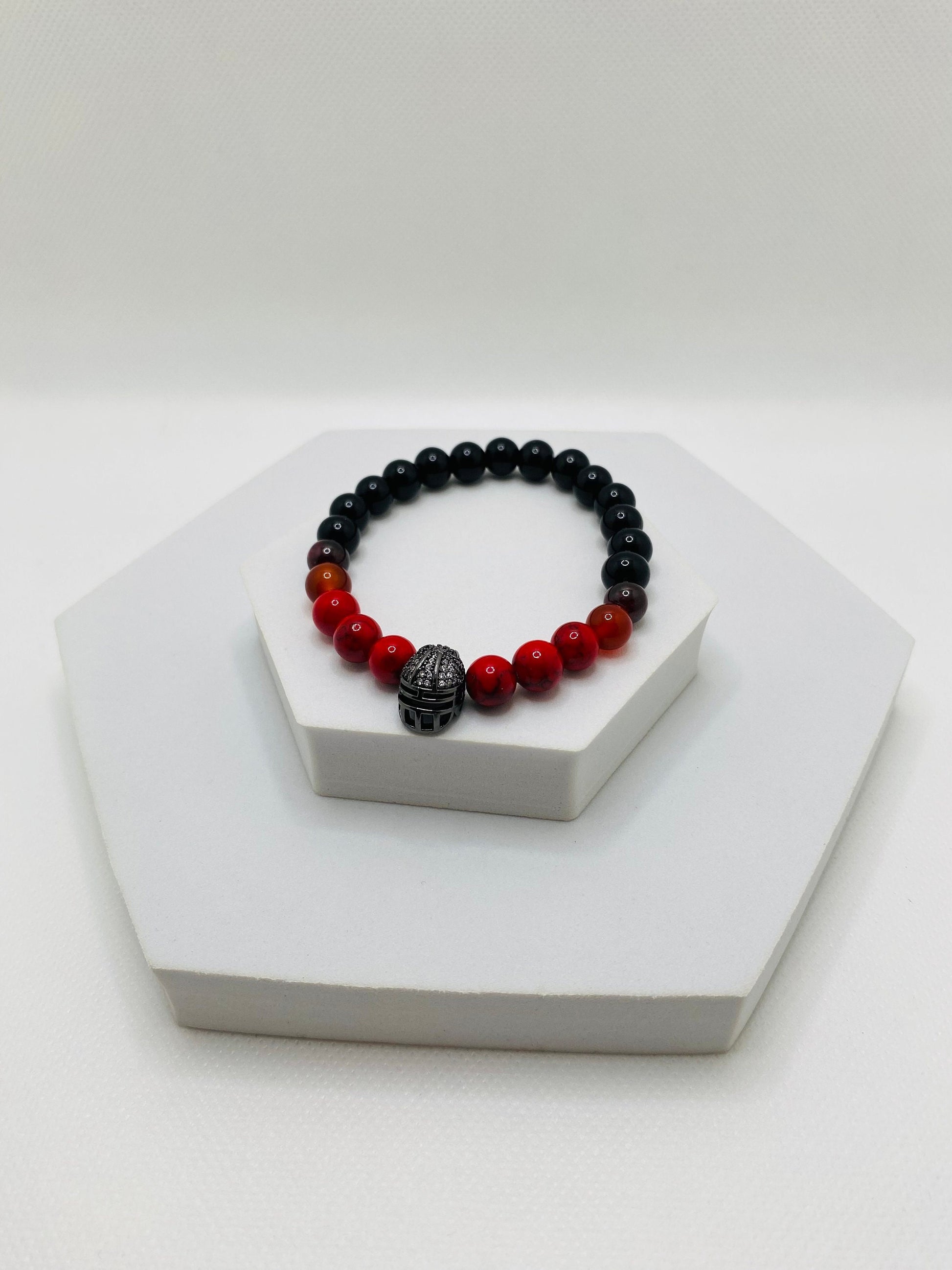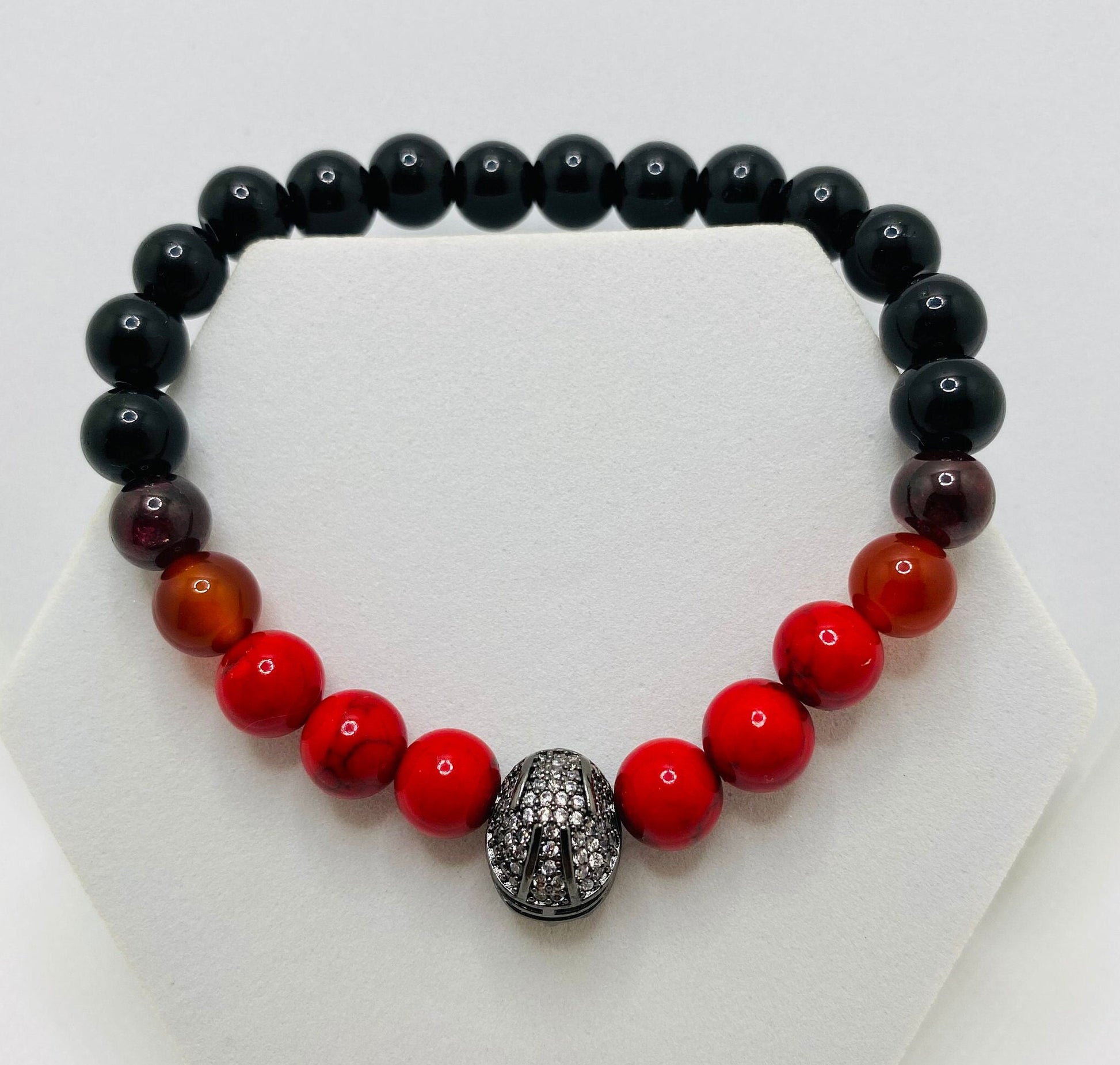 PRODUCT DETAIL - 8mm red Turquoise gemstone beads - 8mm natural Black Onyx gemstone beads - 8mm natural Carnelian gemstone beads - 8mm natural Garnet gemstone beads - Gum metal plated football helmet with inlaid cubic zirconia - Strong, stretchy cord - Handmade in a clean and safe environment