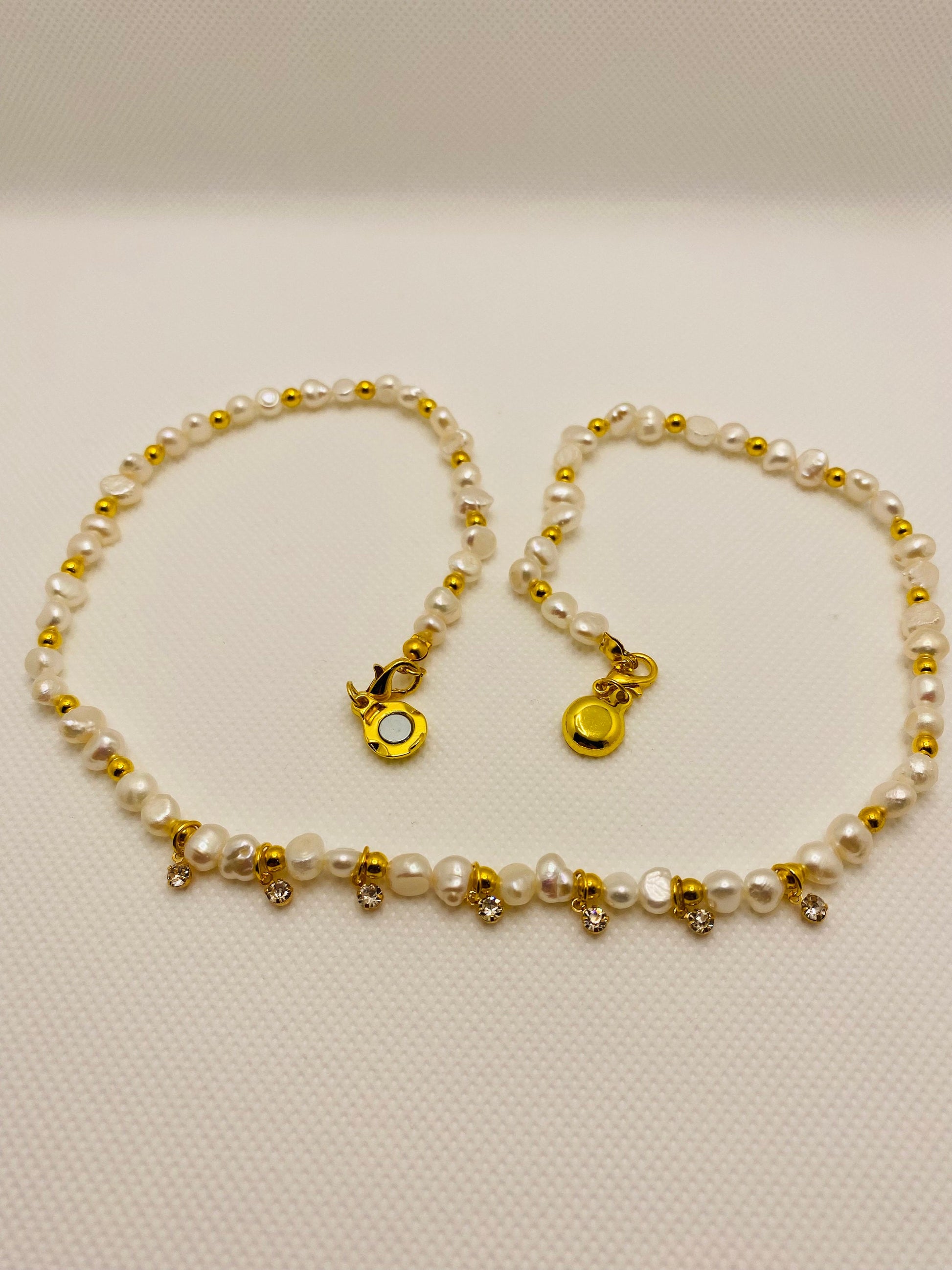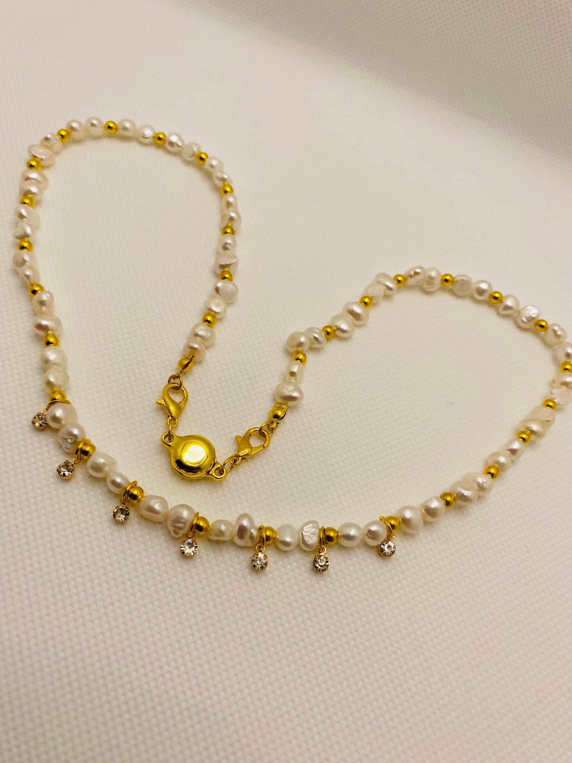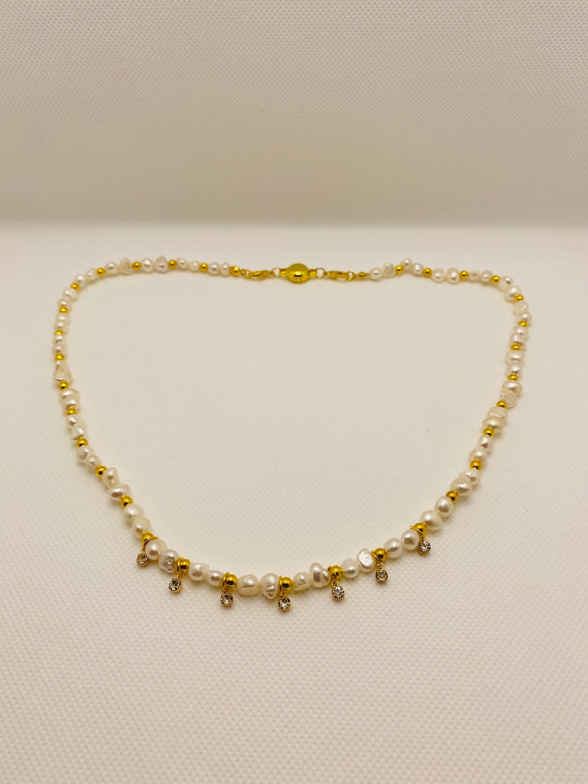 PRODUCT DETAILS : 5-6mm AAA Natural White Baroque Pearl Gemstone Beads. : 3mm 18k Gold Plated Round Spacer Beads. : 18k Gold Plated Brass Mini Round Crystal Clear Rhinestone Mini Charm Pendant. : 18k Gold Plated Lobster Claw Clasp. : 18k Gold Plated Magnetic Clasp : 0.8m Elastic Super Strong Stretchy Cord : Handmade in a Clean and Safe Environment.