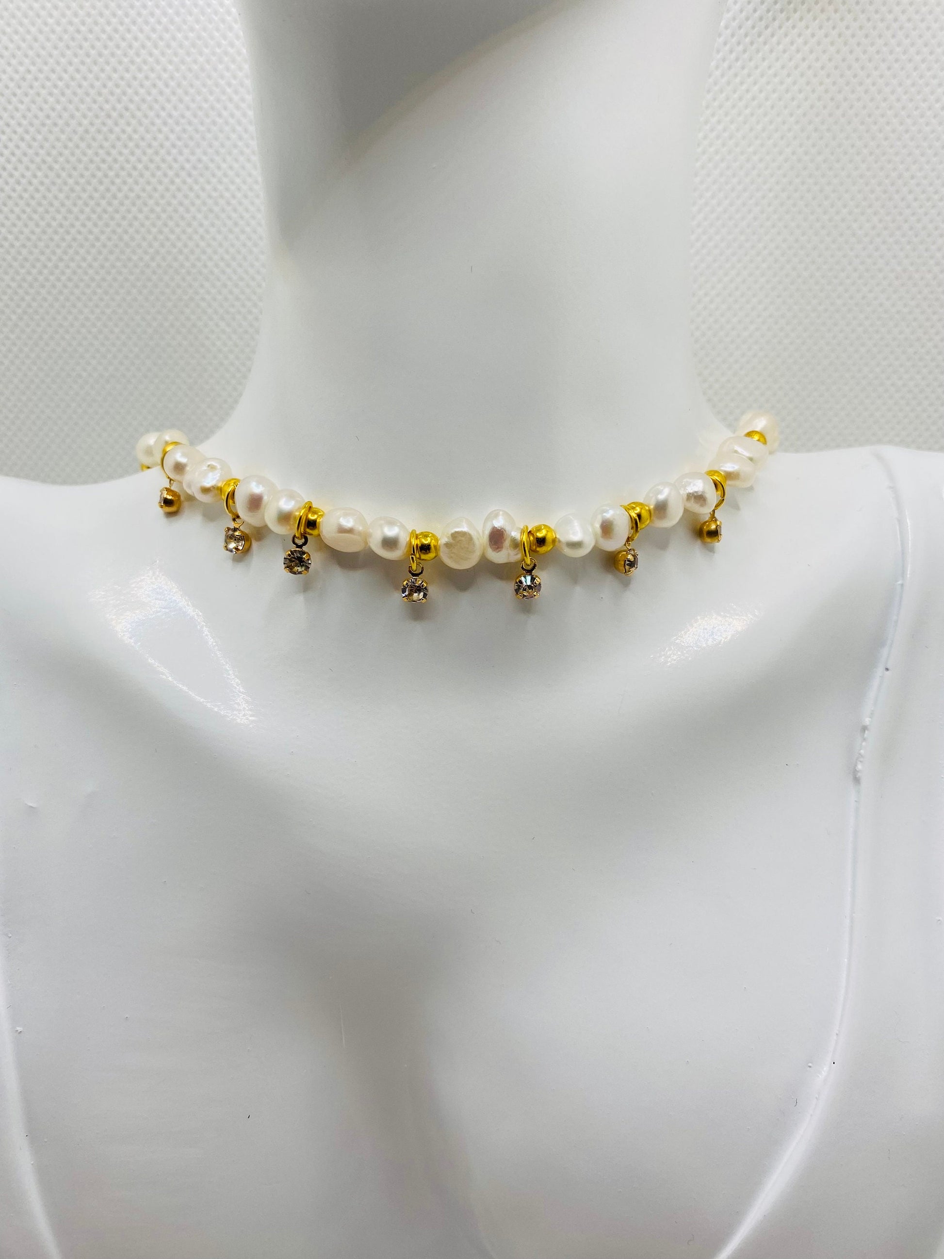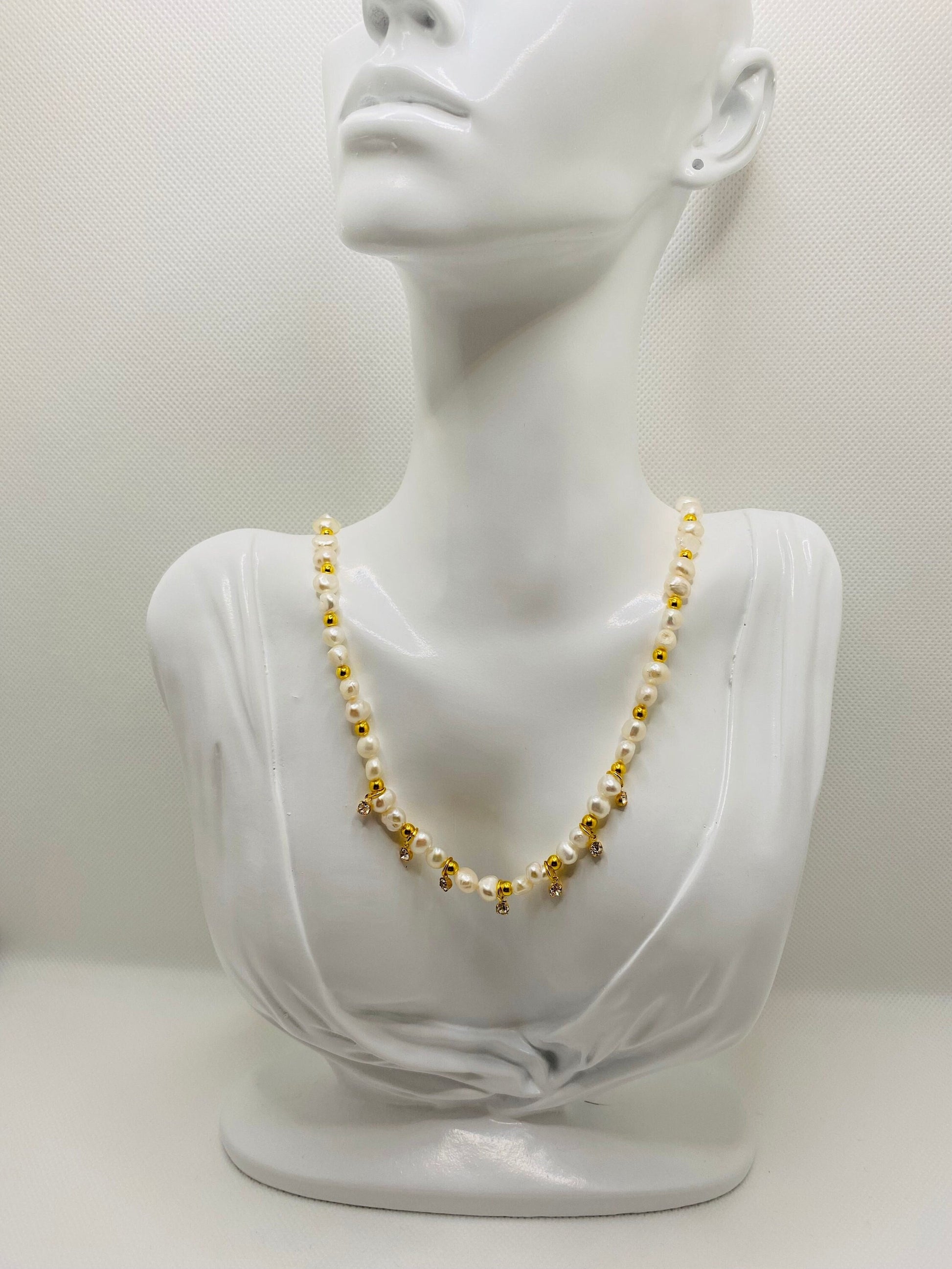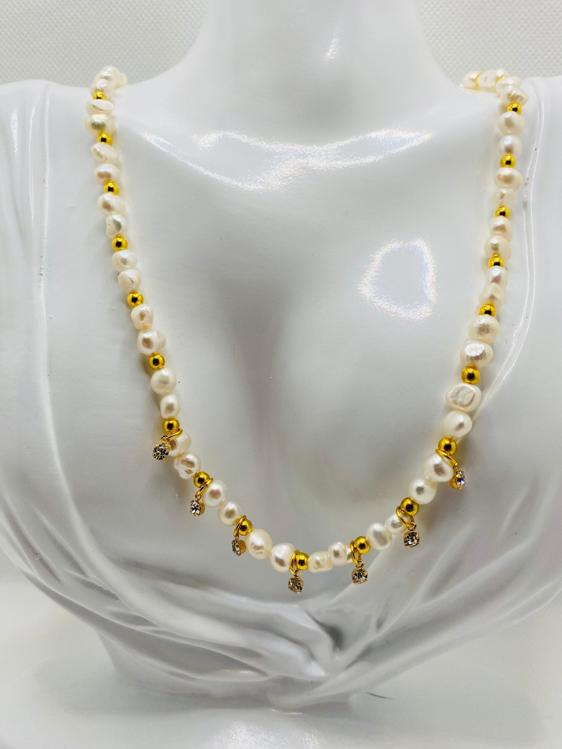 PRODUCT DETAILS : 5-6mm AAA Natural White Baroque Pearl Gemstone Beads. : 3mm 18k Gold Plated Round Spacer Beads. : 18k Gold Plated Brass Mini Round Crystal Clear Rhinestone Mini Charm Pendant. : 18k Gold Plated Lobster Claw Clasp. : 18k Gold Plated Magnetic Clasp : 0.8m Elastic Super Strong Stretchy Cord : Handmade in a Clean and Safe Environment.