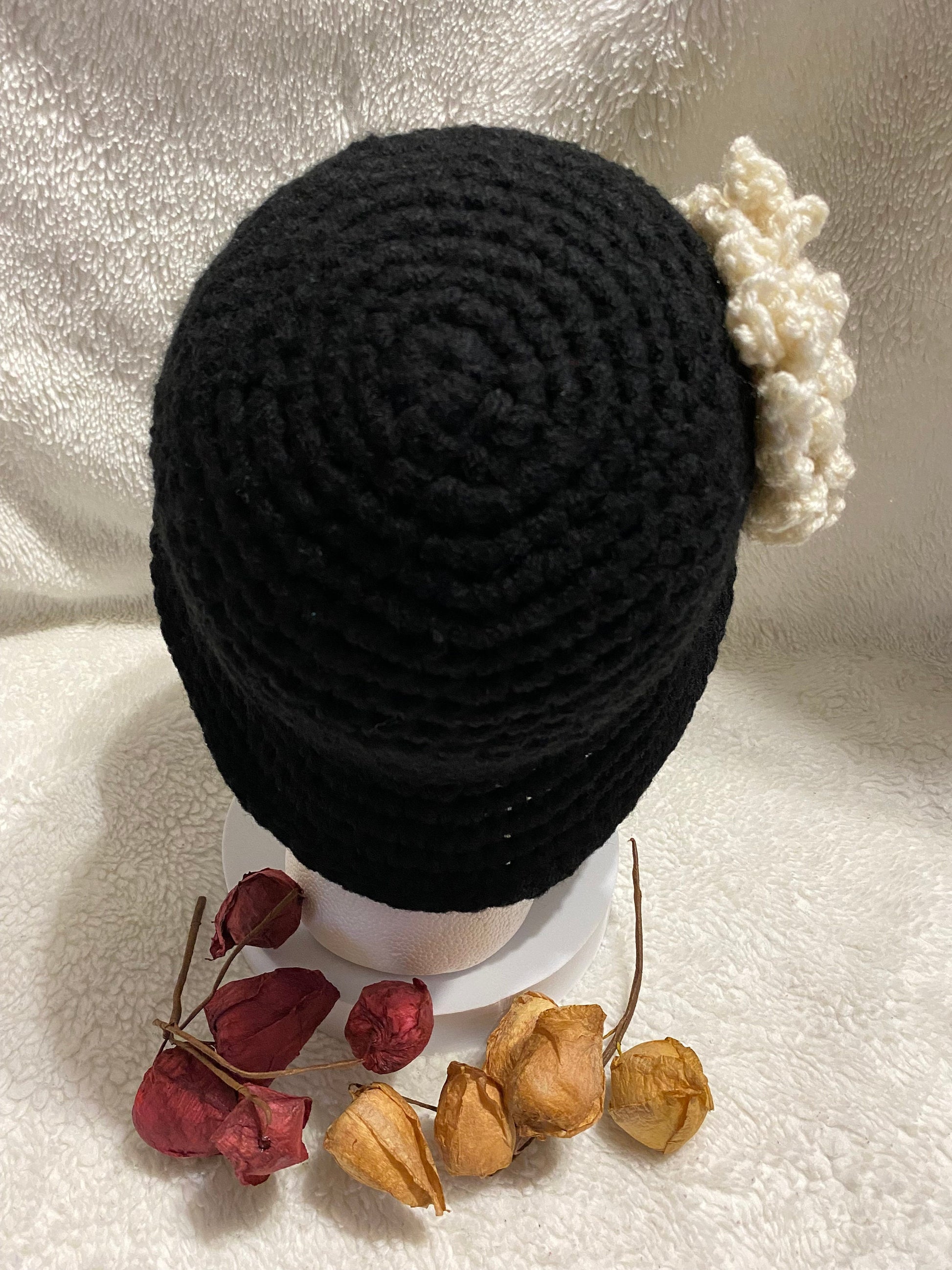 PRODUCT DETAIL - MonaMeCrochetHats - Black 100% acrylic yarn Hat - White 100% acrylic yarn Flower - Crochet hat, sun hat bucket hat with flower - Strong, stretchy yarn - Handmade in a clean and safe environment