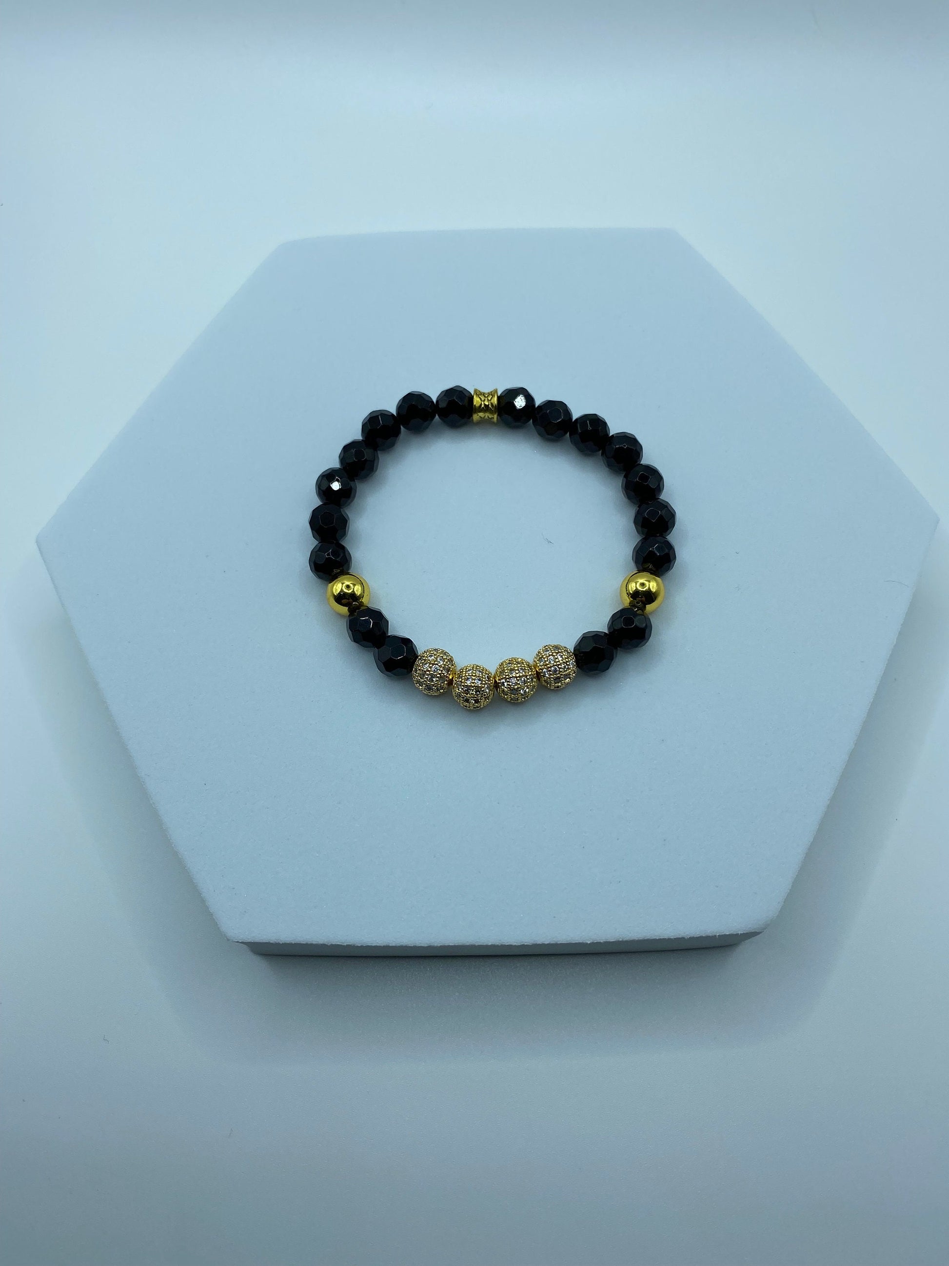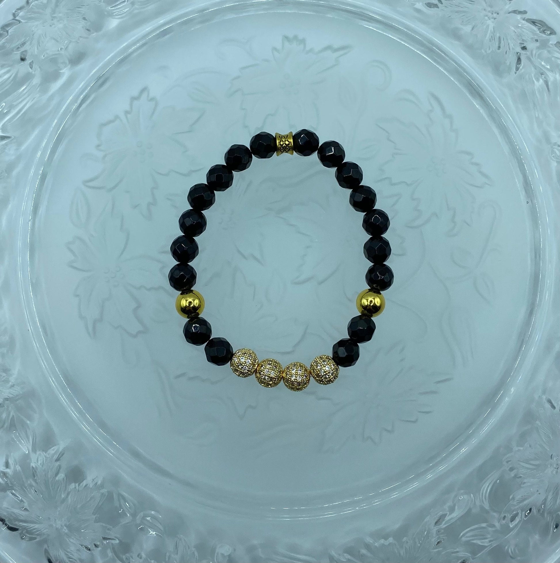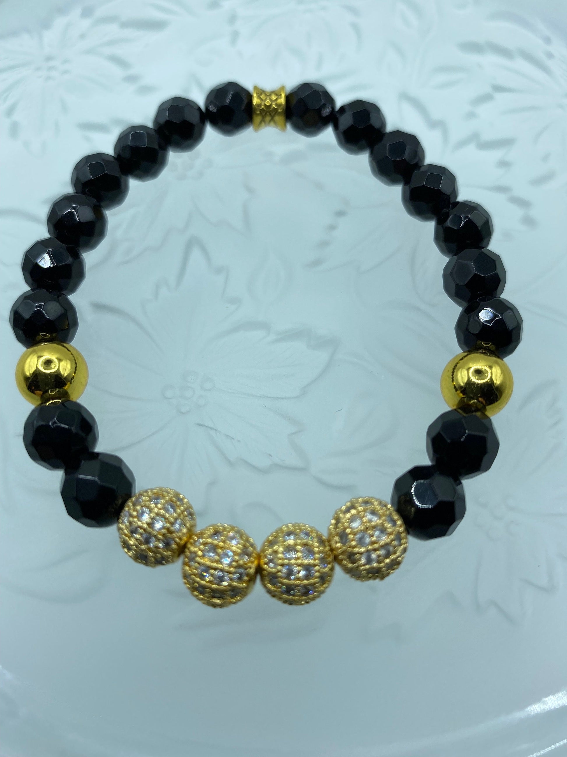 PRODUCT DETAILS - 8mm natural AAA black onyx faceted gemstone beads - 18k gold plated hematite bead - 8mm 18k gold plated beads with inlaid cubic zirconia - Antique gold Tibetan spacer - Strong, stretchy cord - Handmade in a clean and safe environment