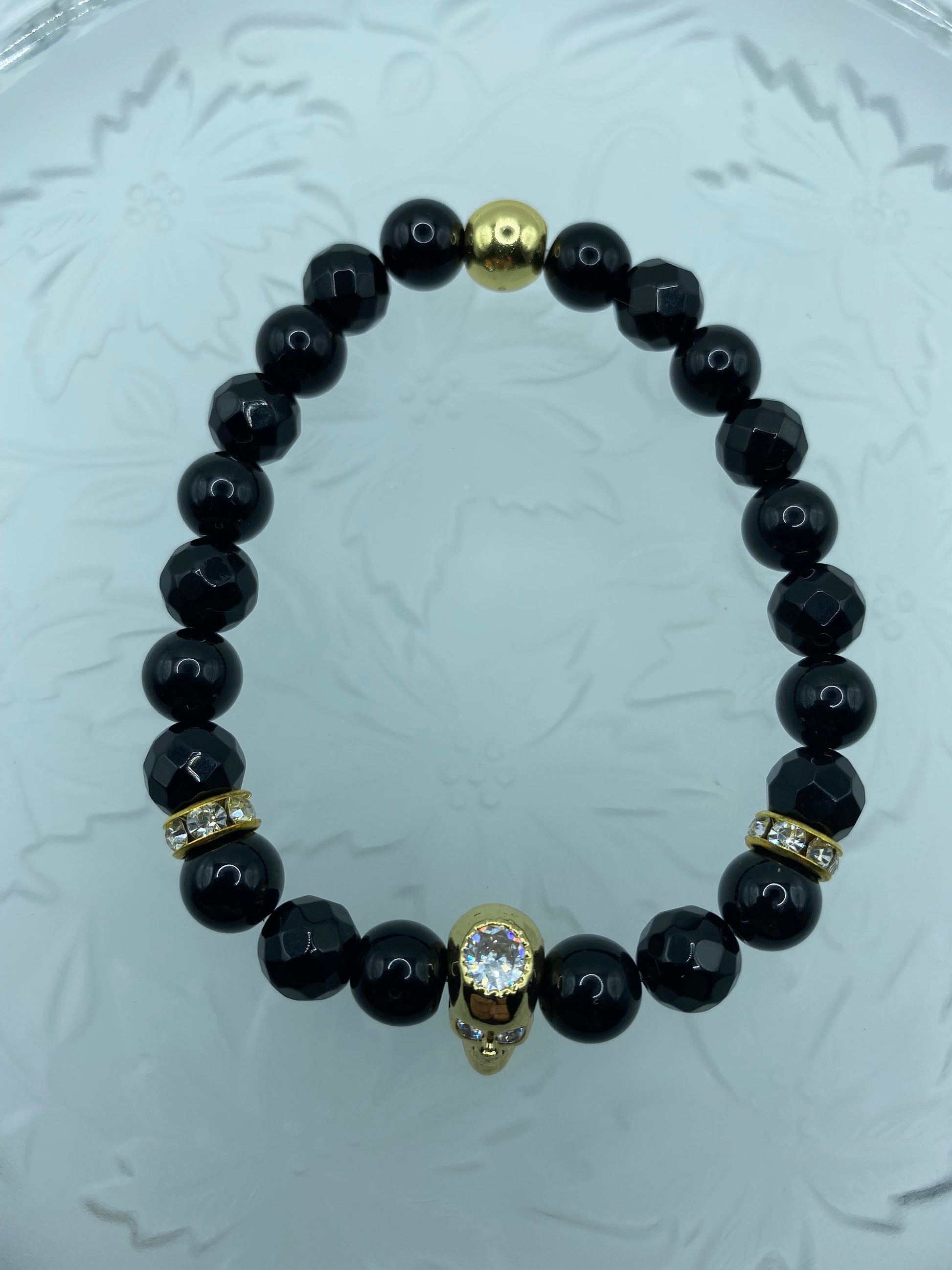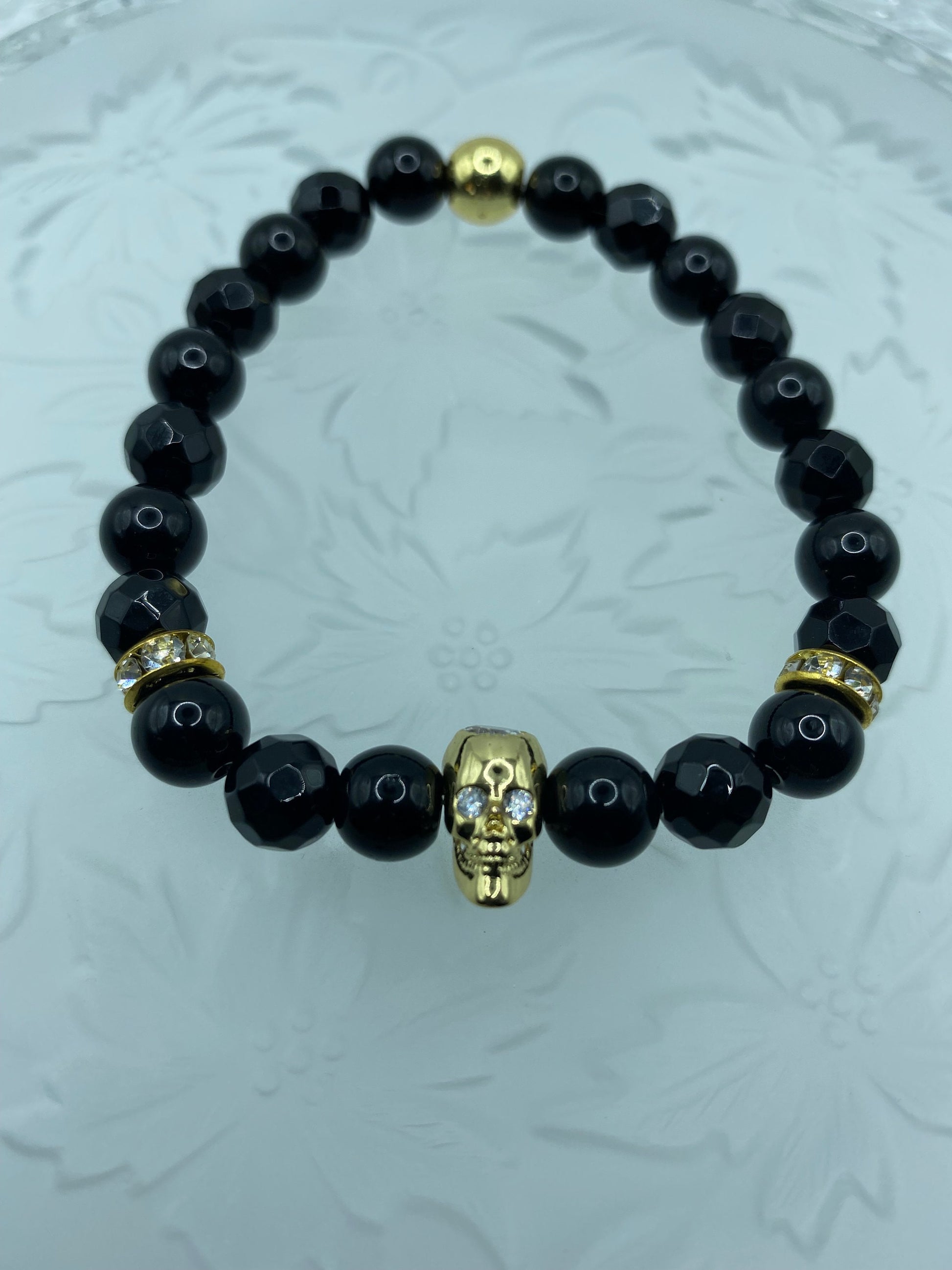 PRODUCT DETAILS - 8mm natural AAA black onyx faceted gemstone beads - 18k gold plated hematite bead - 8mm 18k gold plated rondelles with sparkling rhinestones - Golden brass paved micro cubic zirconia skull head - Strong, stretchy cord - Handmade in a clean and safe environment