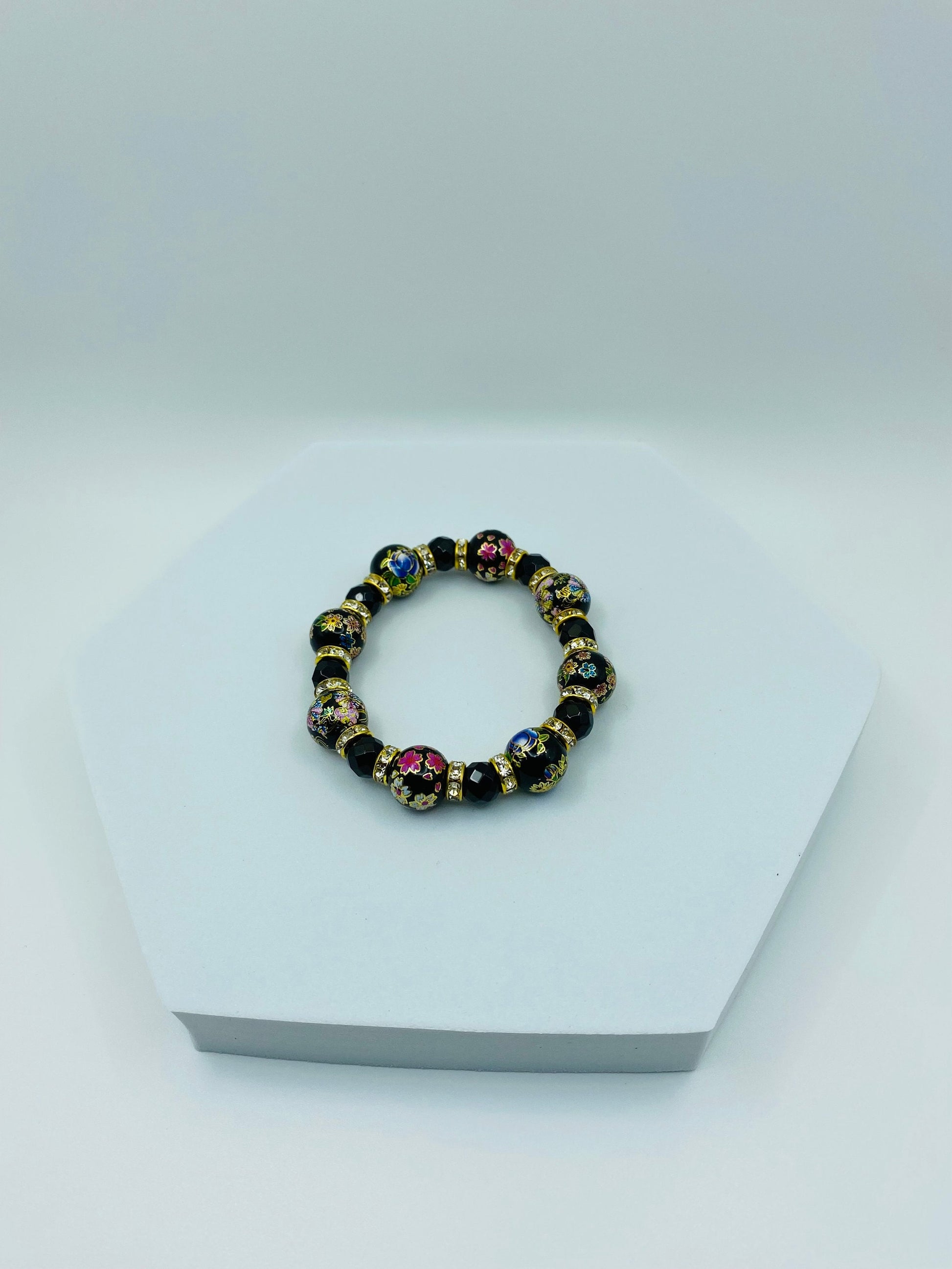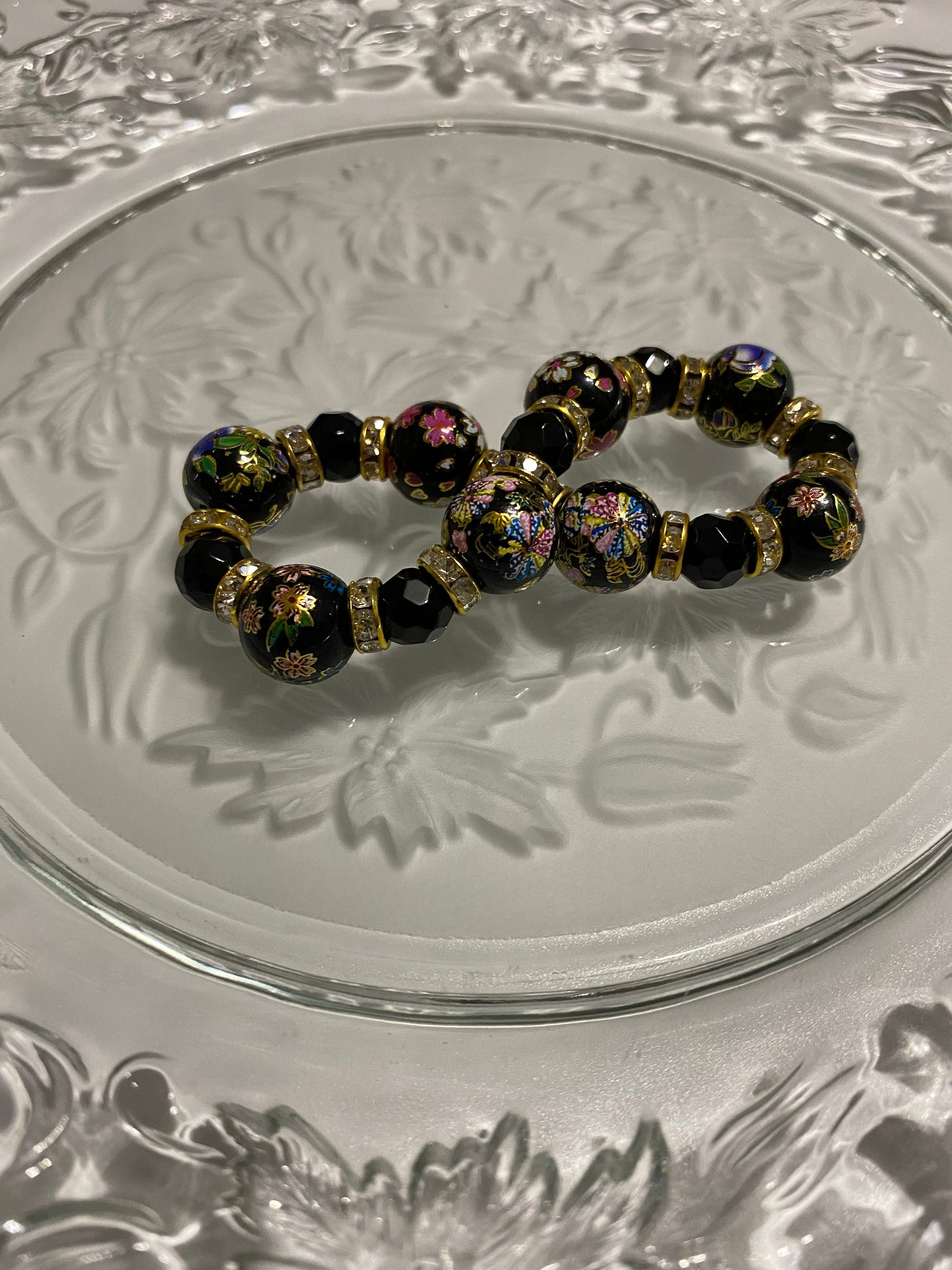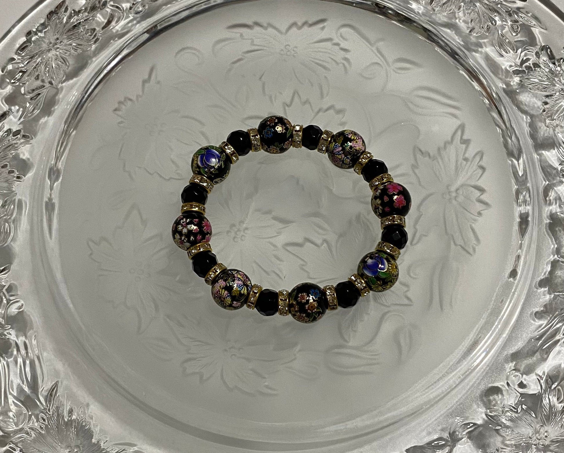 Black Onyx Bracelet: Hand-Painted Floral Glass Beads, 18k Gold Rhinestone