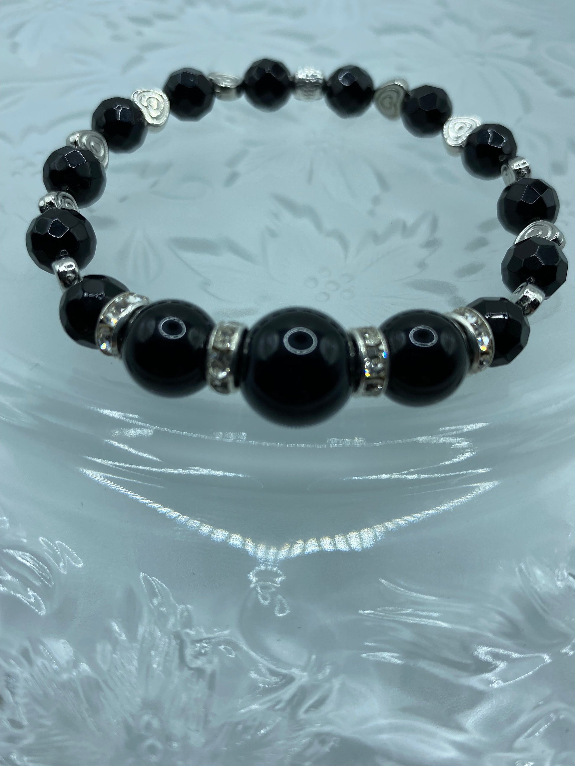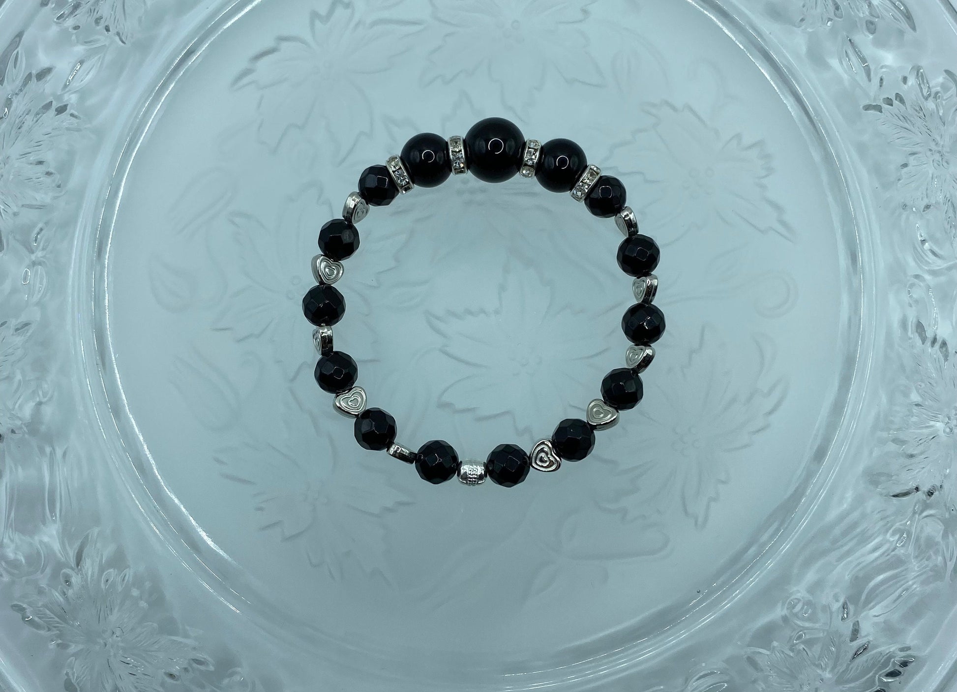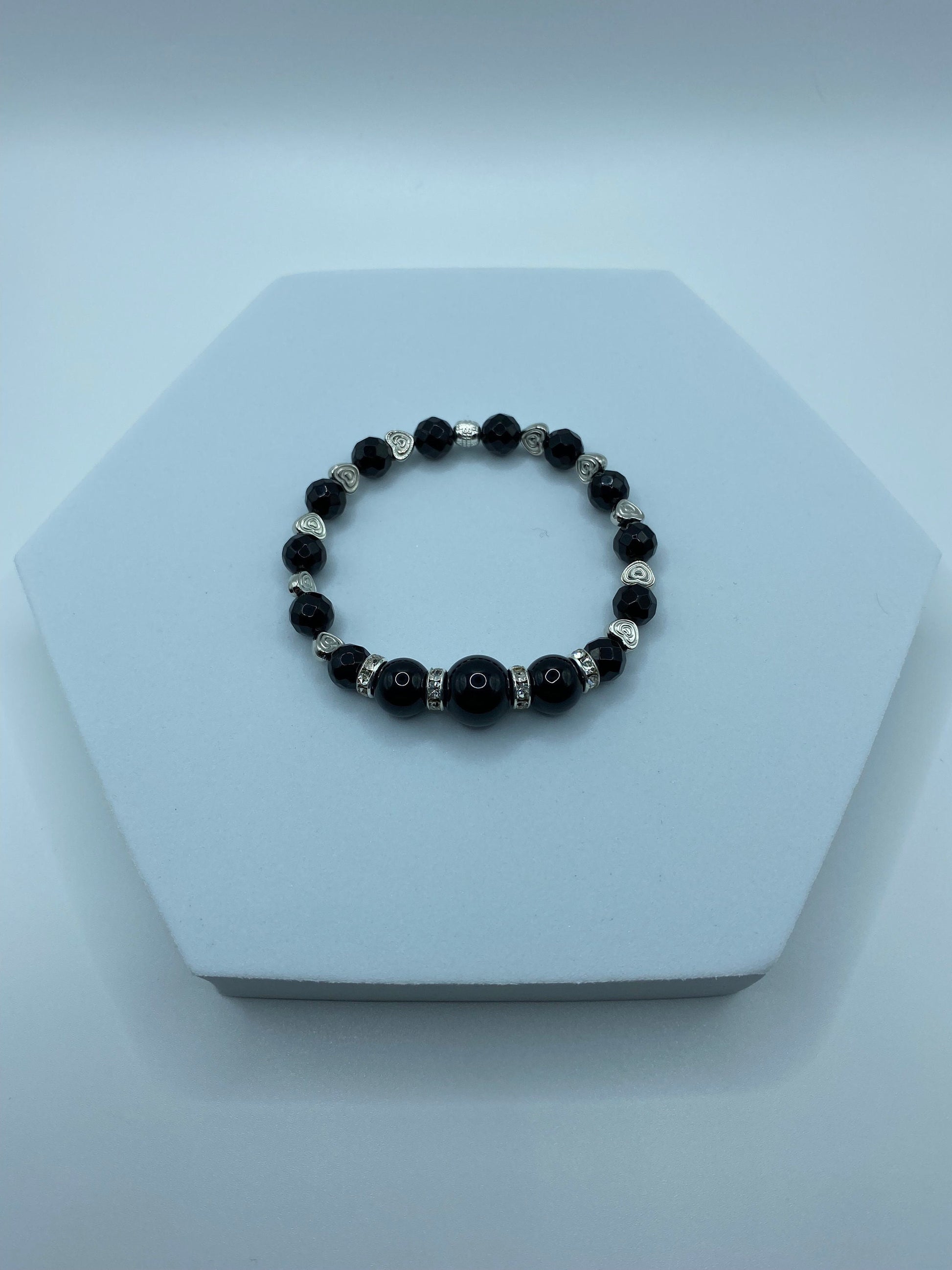 PRODUCT DETAILS - 8mm natural AAA black onyx gemstone beads - 10mm natural AAA black onyx gemstone beads - 12mm natural AAA black onyx gemstone beads - 6mm white gold heart spacer beads - 8mm silver plated rondelles with sparkling rhinestones - Strong, stretchy cord - Handmade in a clean and safe environment
