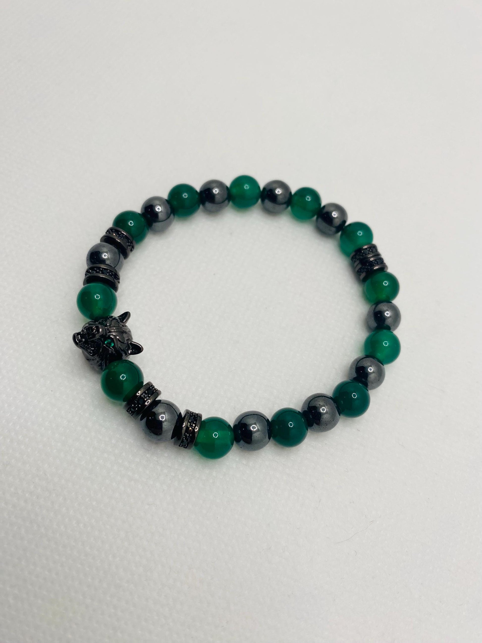 PRODUCT DETAILS - black Wolf forever charm bracelet - 8mm natural black Metallic rhinestone spacers - 8mm black natural hematite gemstone beads - 8mm natural green jade gemstone beads - Metallic black copper Wolf head charm with green rhinestone eyes - Strong, stretchy cord - Handmade in a clean and safe environment