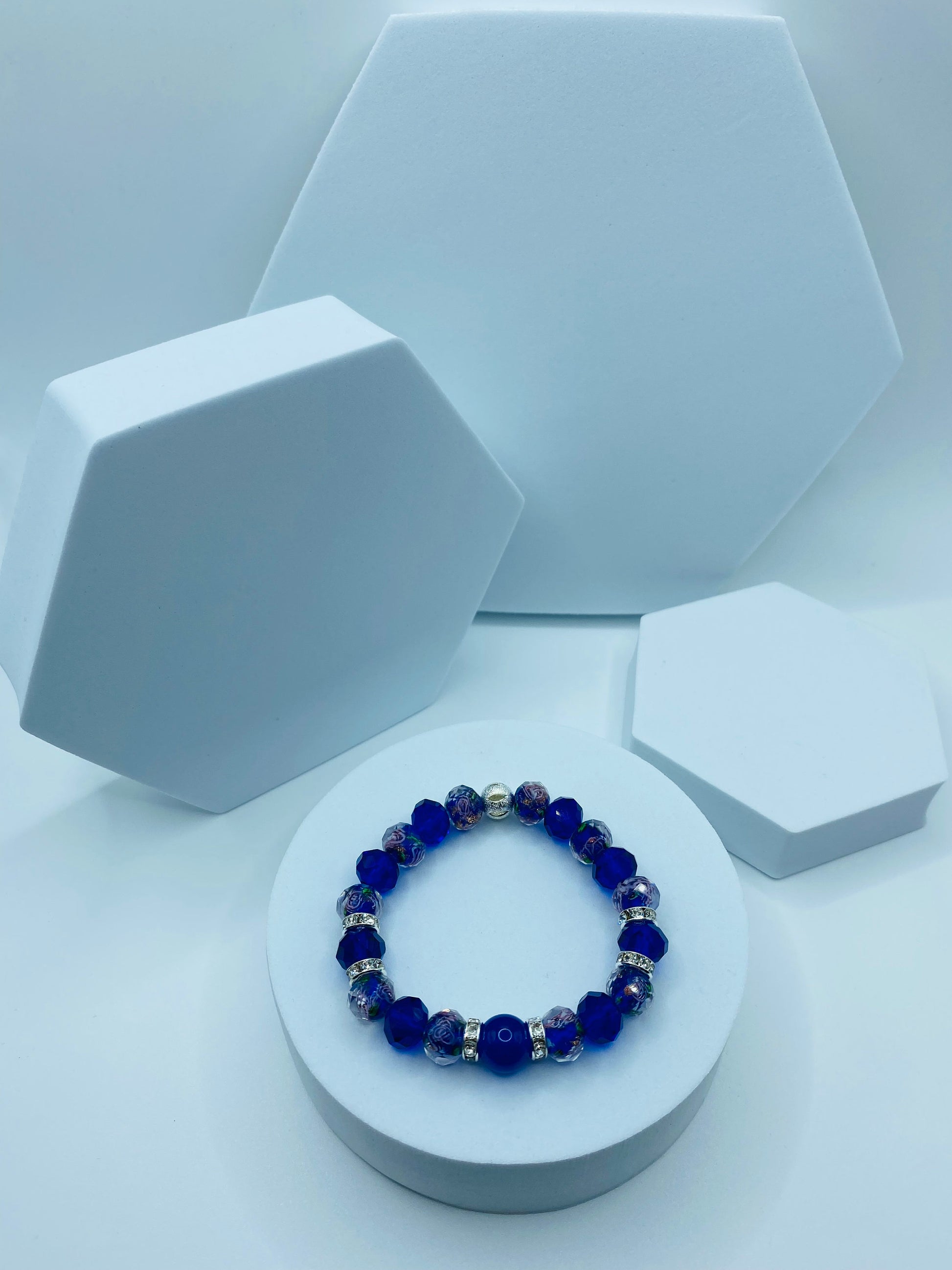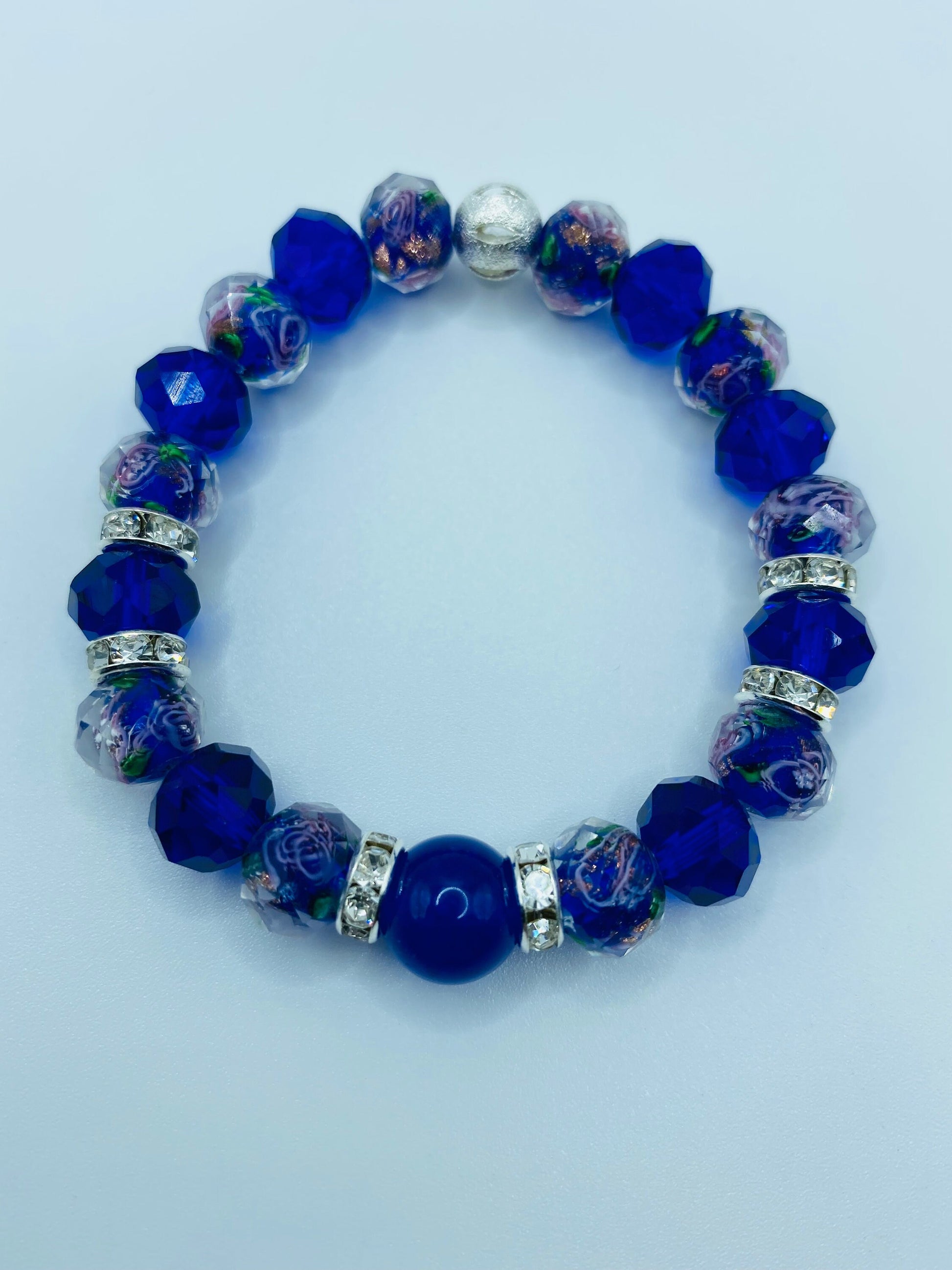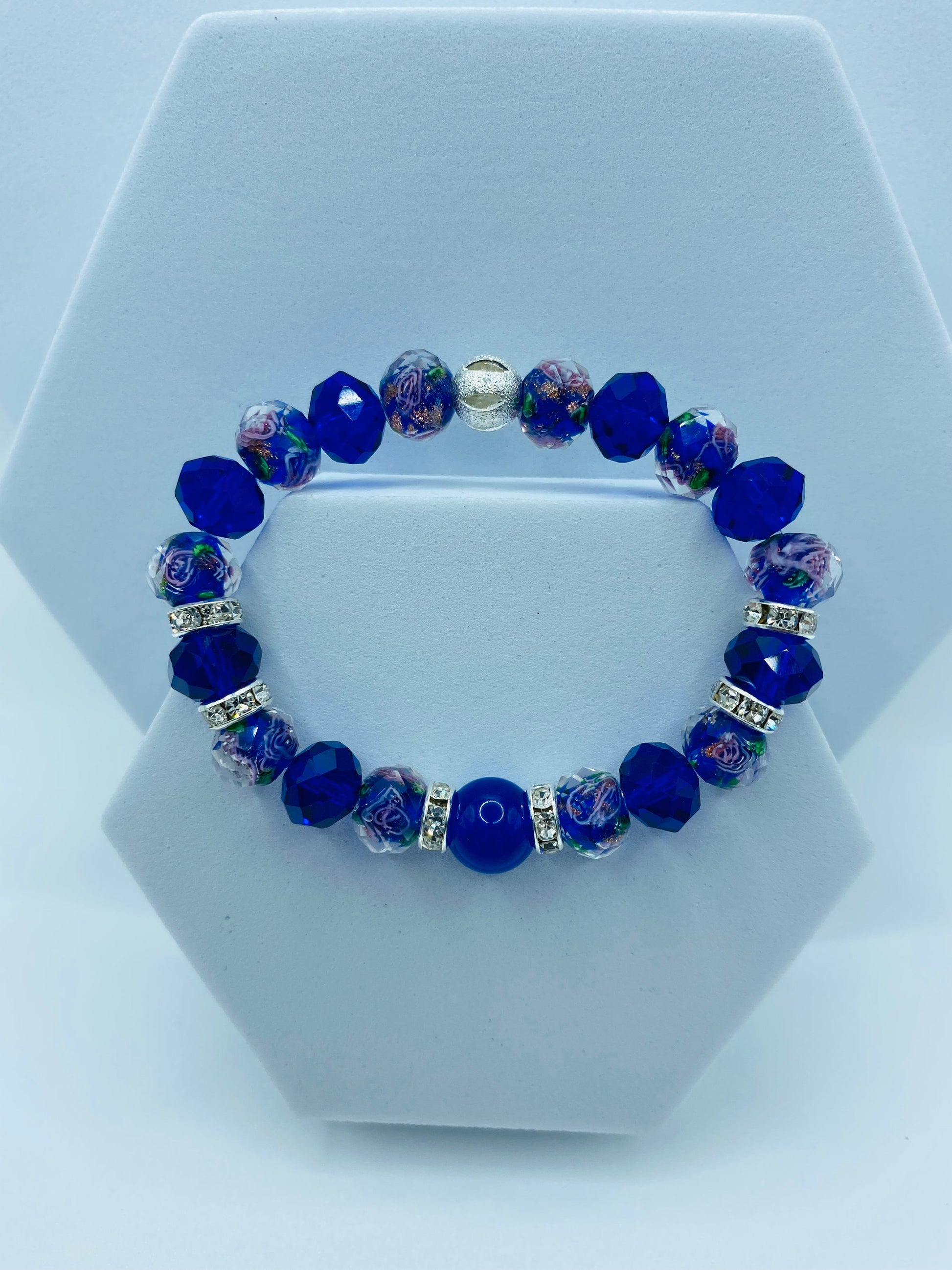 PRODUCT DETAILS - 10mm natural chalcedony sapphire blue gemstone bead - 10mm pinkish blue lampwork gold sand faceted floral glass beads - 10mm blue crystal faced glass beads - 8mm hollow silver-plated round spacer bead - 8mm silver plated rondelles with sparkling rhinestones - Strong, stretchy cord - Handmade in a clean and safe environment