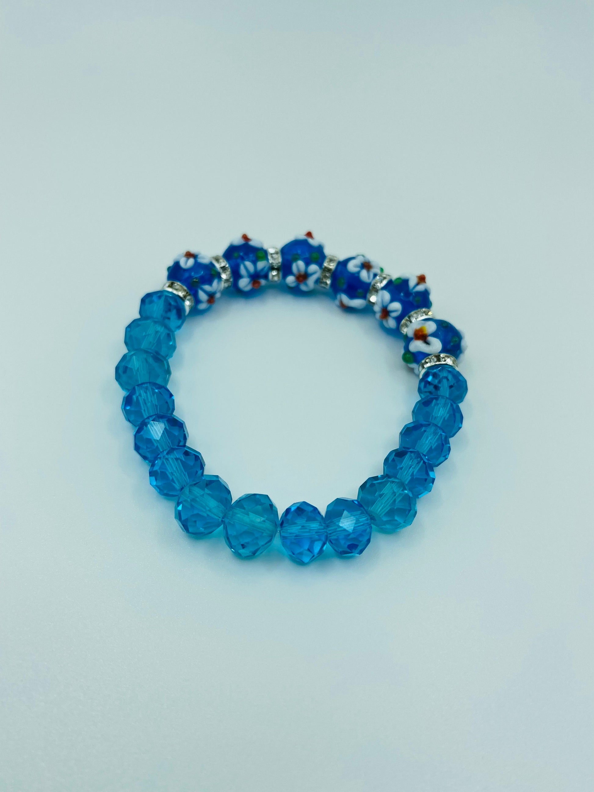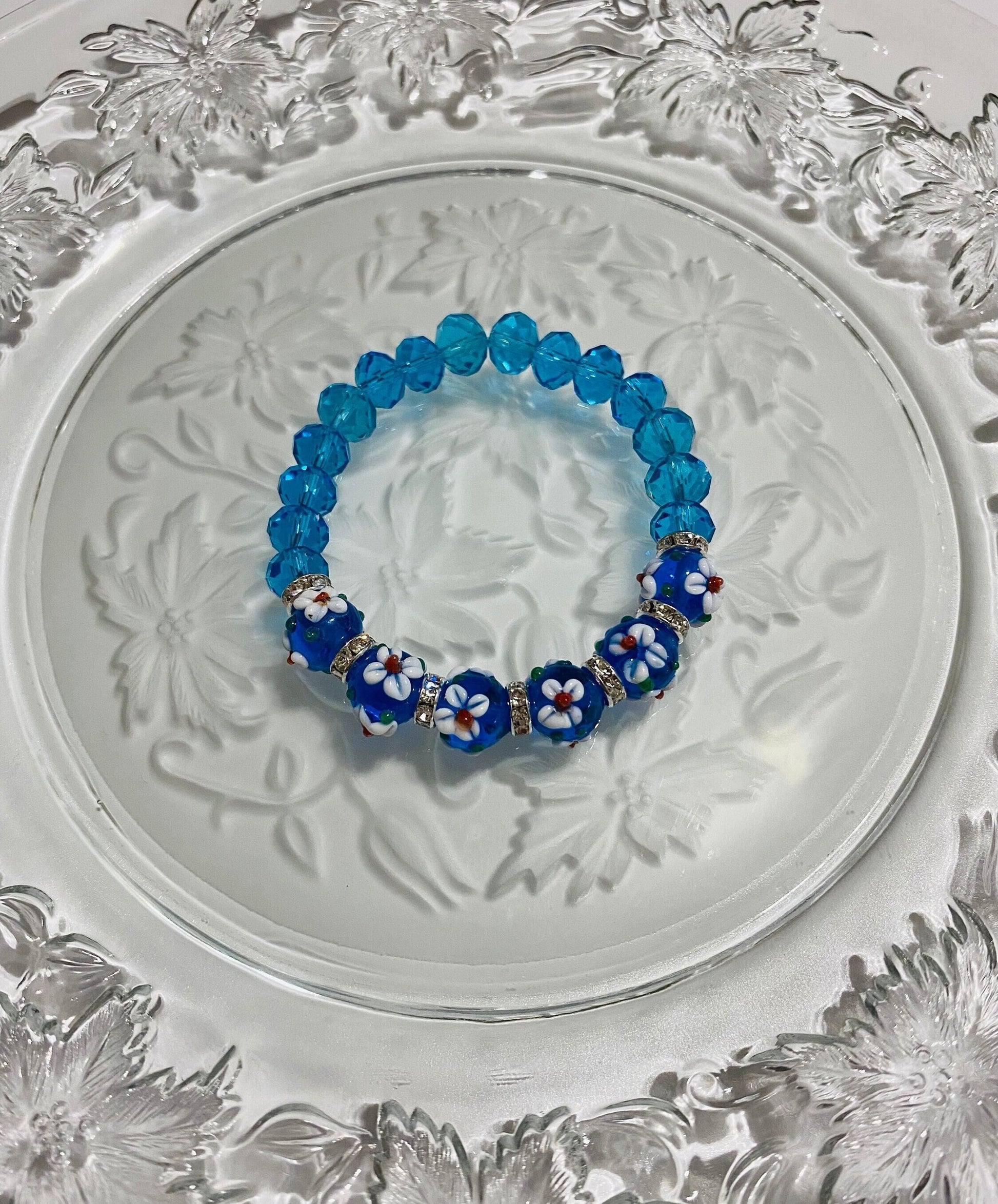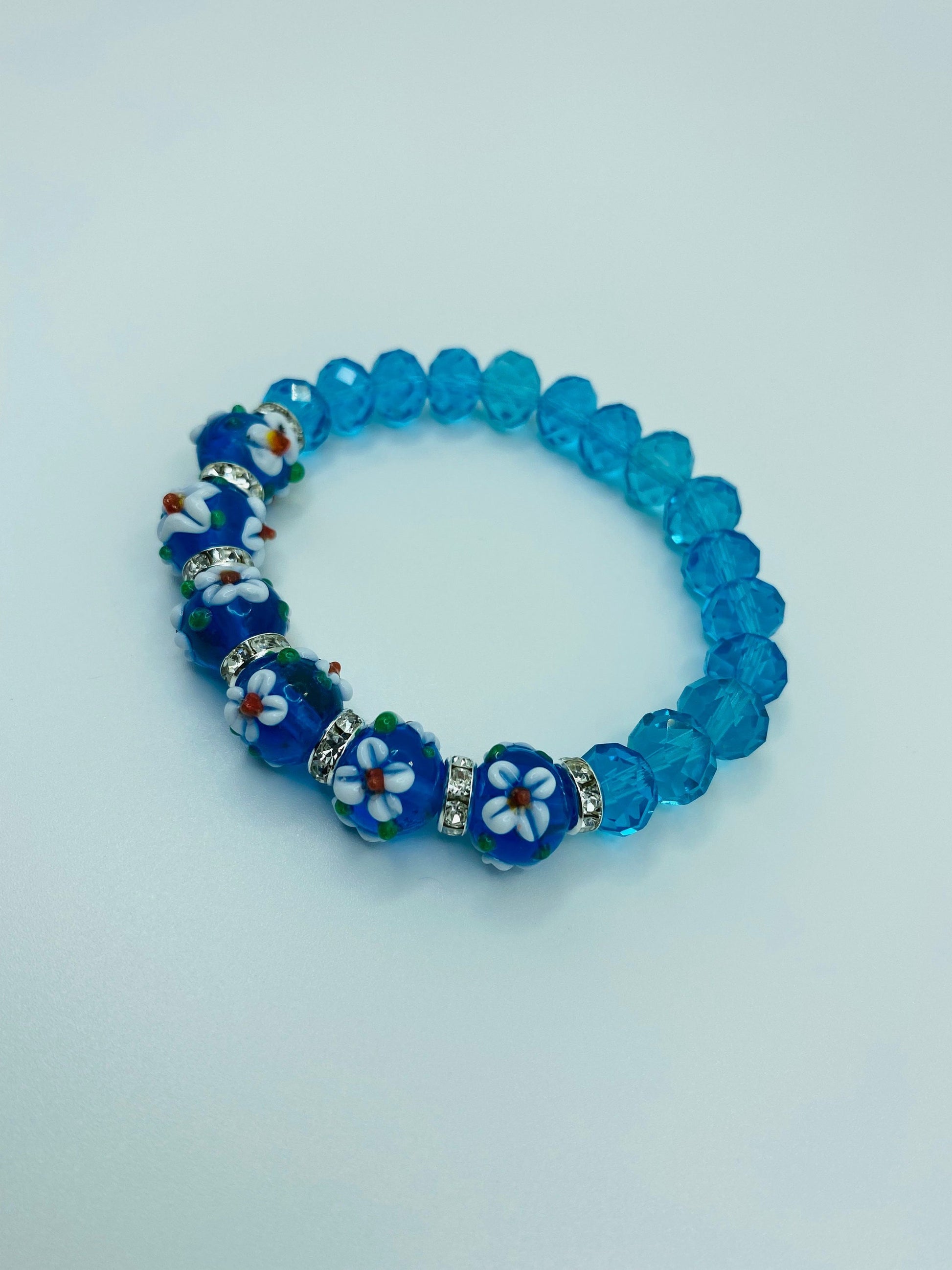 PRODUCT DETAILS - Lampwork glass bumpy floral crystal bracelet - 12mm bumpy floral lampwork glass beads - 10mm blue crystal faceted glass beads - Silver plated rondelles with sparkling rhinestones - Strong, stretchy cord - Handmade in a clean and safe environment