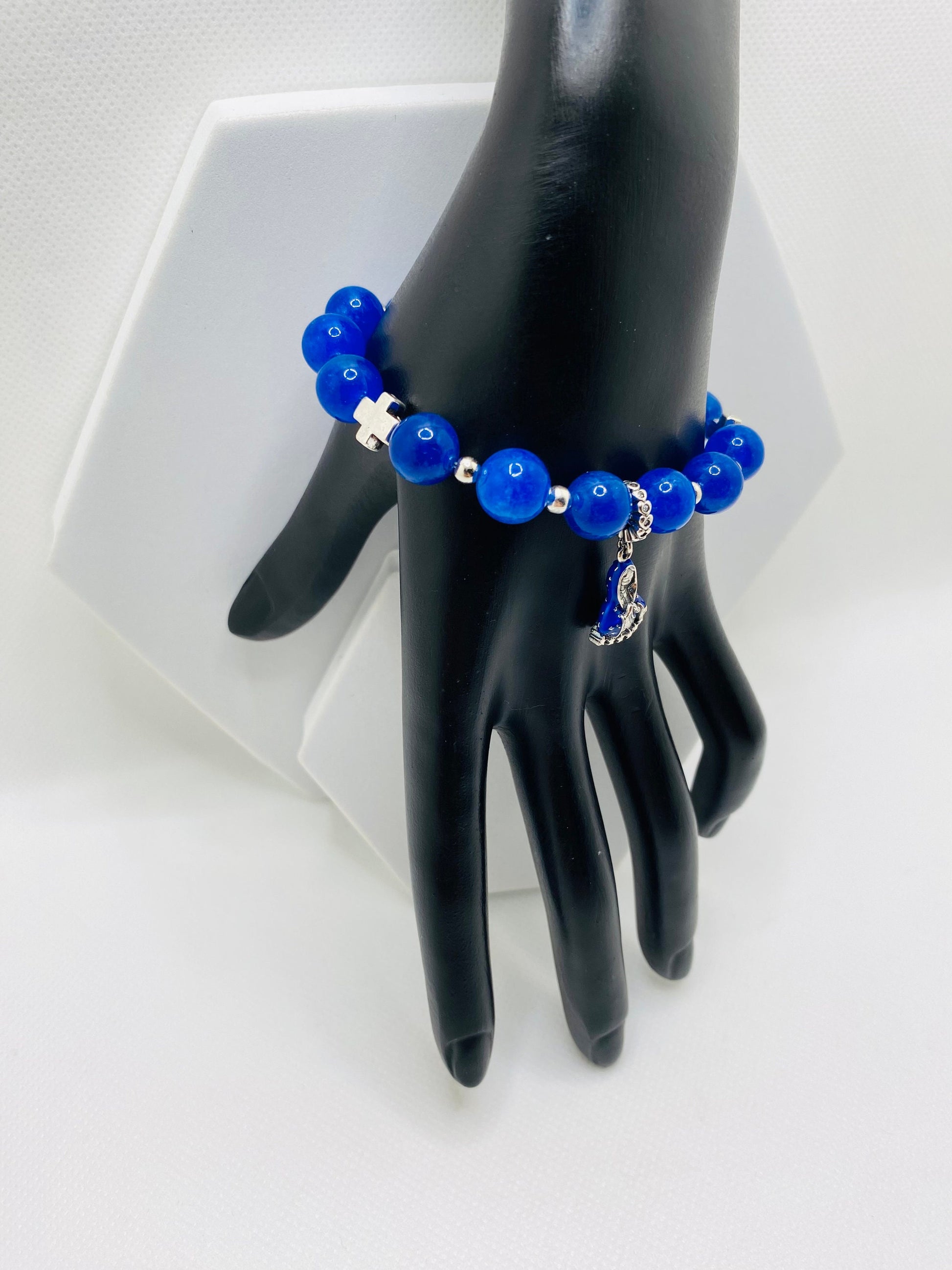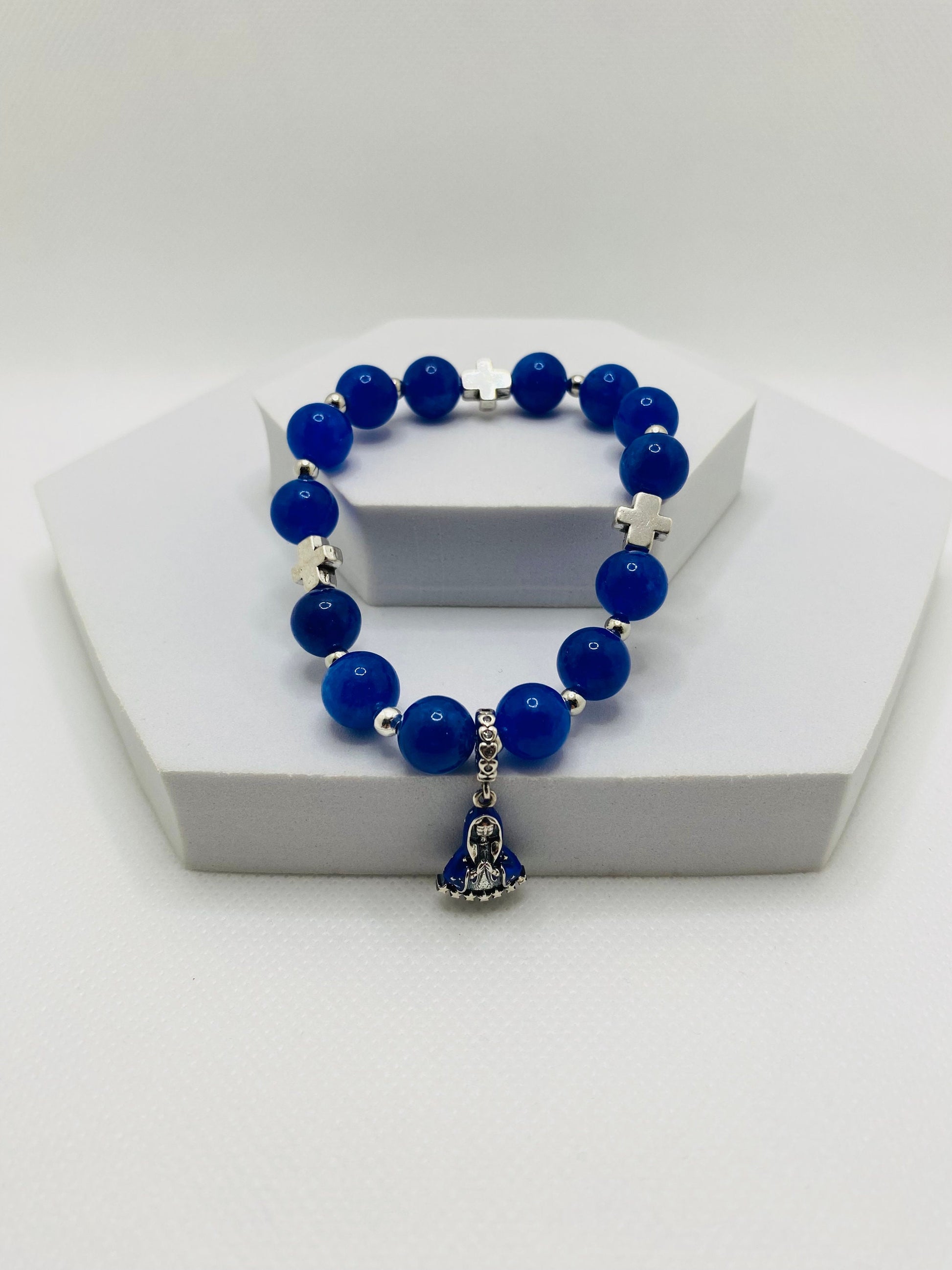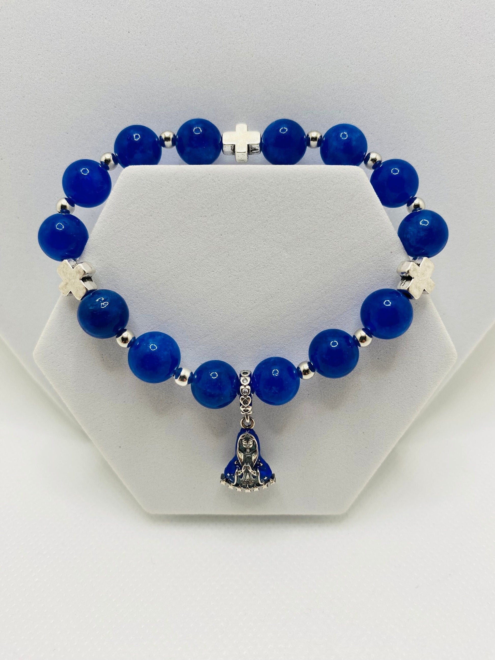 Blue Kyanite Gemstone Bracelet: Virgin Mary Charm, Cross Beads