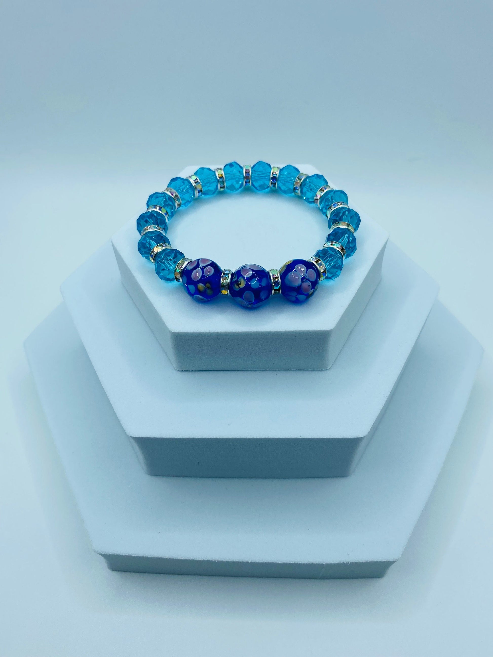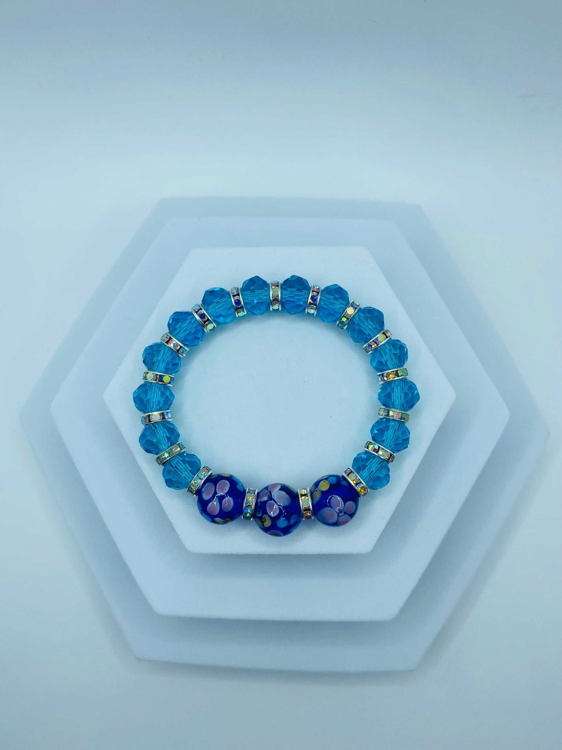 PRODUCT DETAILS - Blue lampwork glass floral bracelet - 10mm AAA topaz blue crystal faceted glass beads - 12mm Blue Murano lampwork floral glass beads - 8mm gold plated rondelle with rhinestones - Strong, stretchy cord - Handmade in a clean and safe environment
