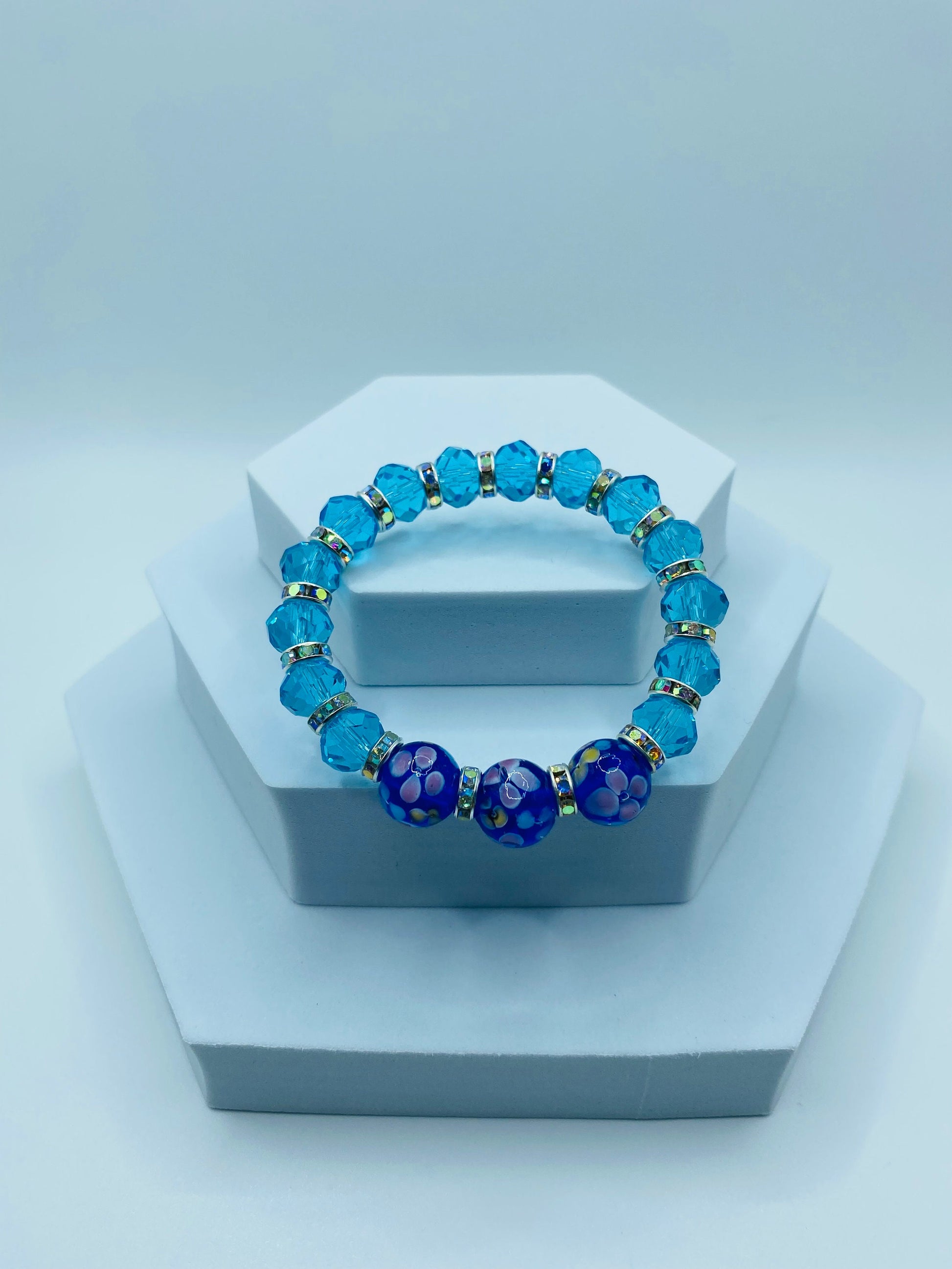 Adorn your wrist with elegance and charm with this stunning crystal bracelet featuring sparkling blue topaz glass beads and delicate lampwork blue glass flower beads. The addition of shimmering rhinestones adds a touch of glamour to this unique piece. Perfect for adding a pop of color to any outfit, this bracelet is sure to catch the eye and make a statement wherever you go. A must-have accessory for any jewelry lover! Handcrafted with care, this bracelet is sure to make a statement wherever you go.