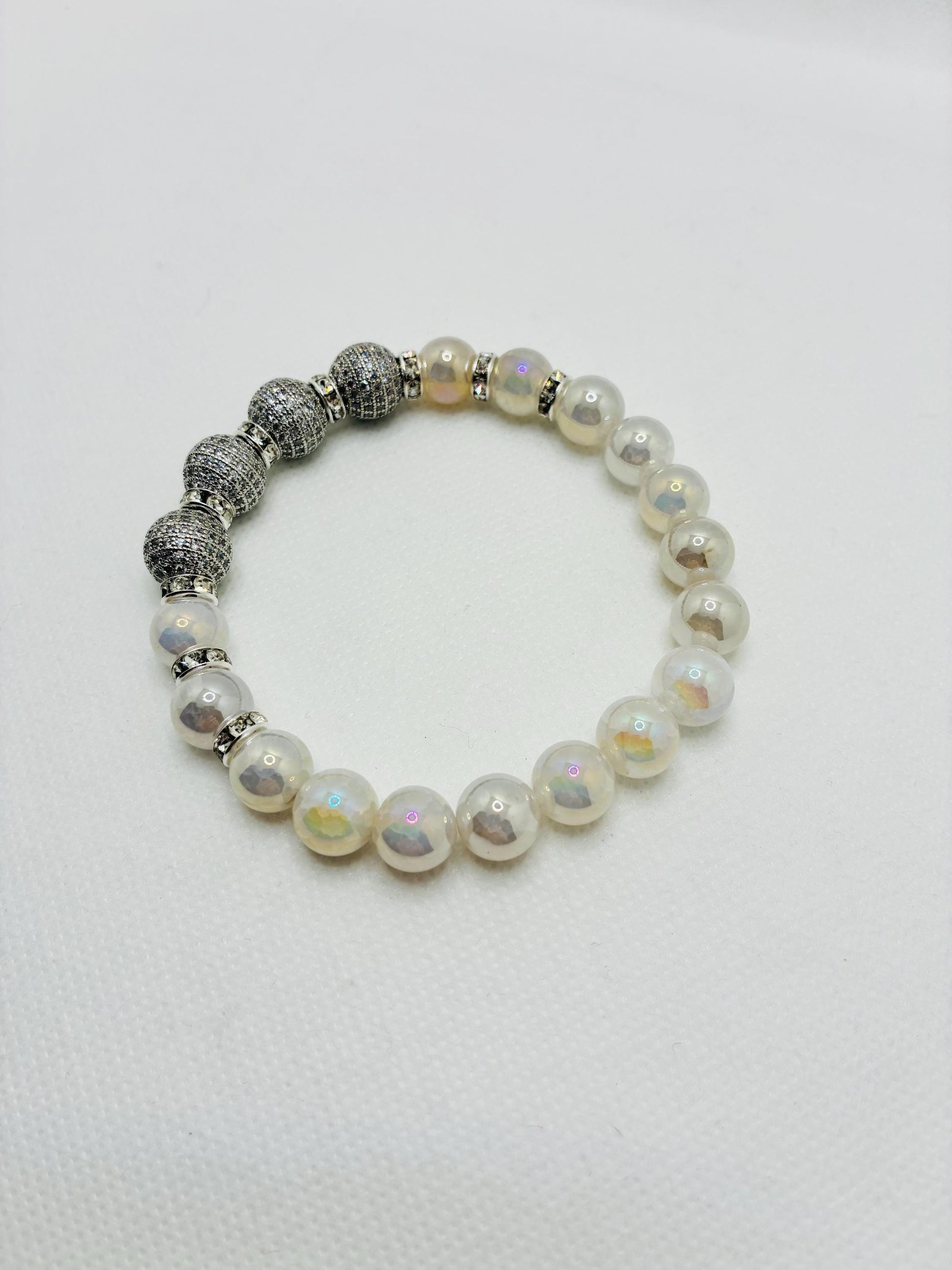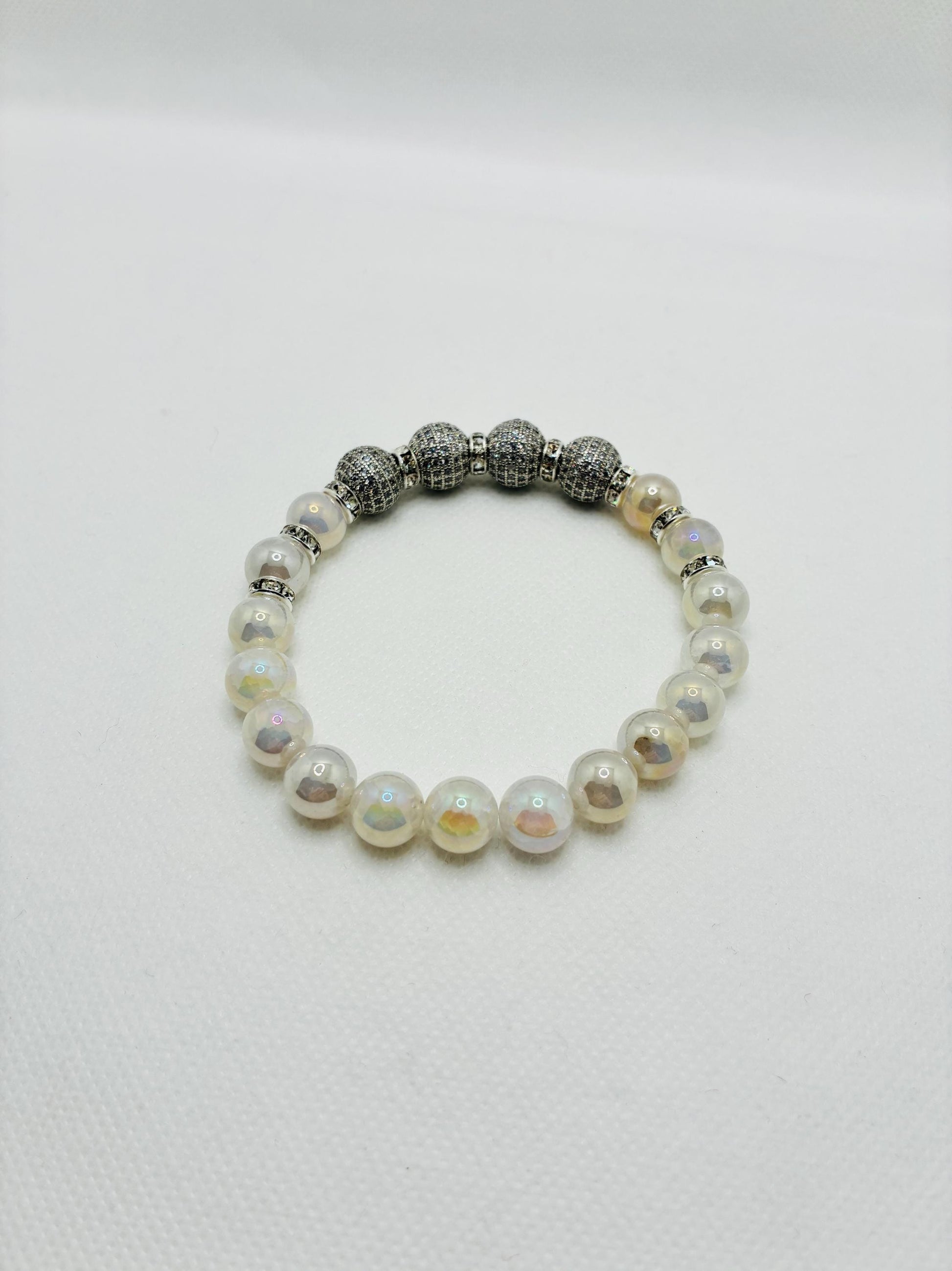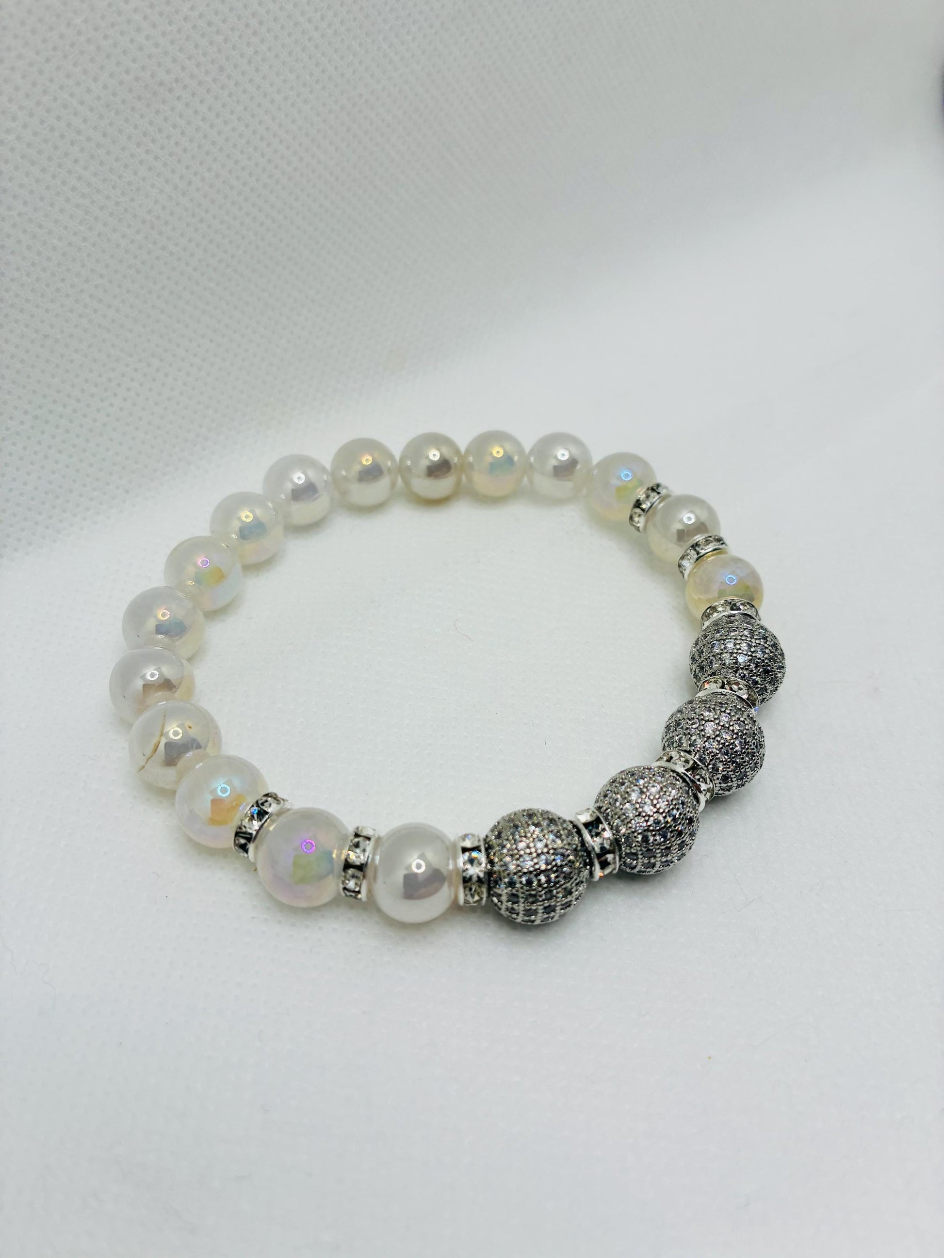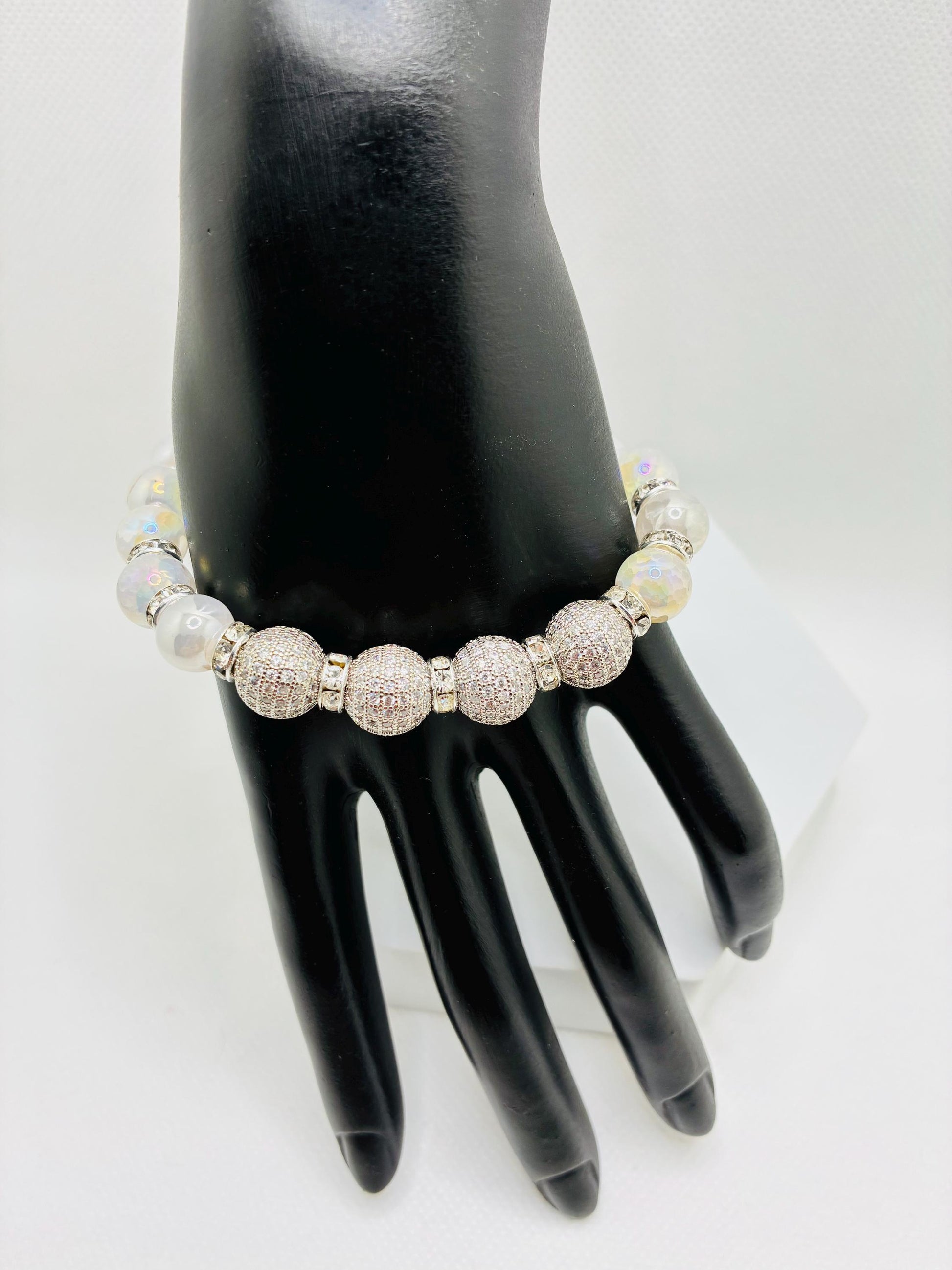 Product Info: 12mm white gold brass rhinestone & zircon beads. 10mm sparkling snow crackle quartz gemstone beads. silver plated rondelle spacers with sparkling rhinestones. 0.8mm super strong stretchy cord 100 % handmade in a clean and safe environment.