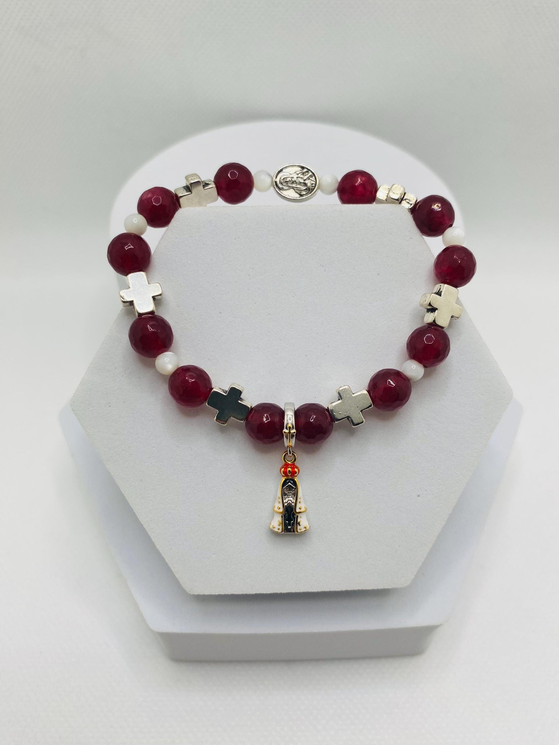 PRODUCT DETAILS: : 8mm natural Red Carnelian gemstone beads. : 4mm White Mother of Pearl gemstone beads. : silverplated 8mmx8mm mini cross beads. : Silver Plated oval bead with Mary and Cross. : 925 silverplated Mary of Nazareth charm pendant.