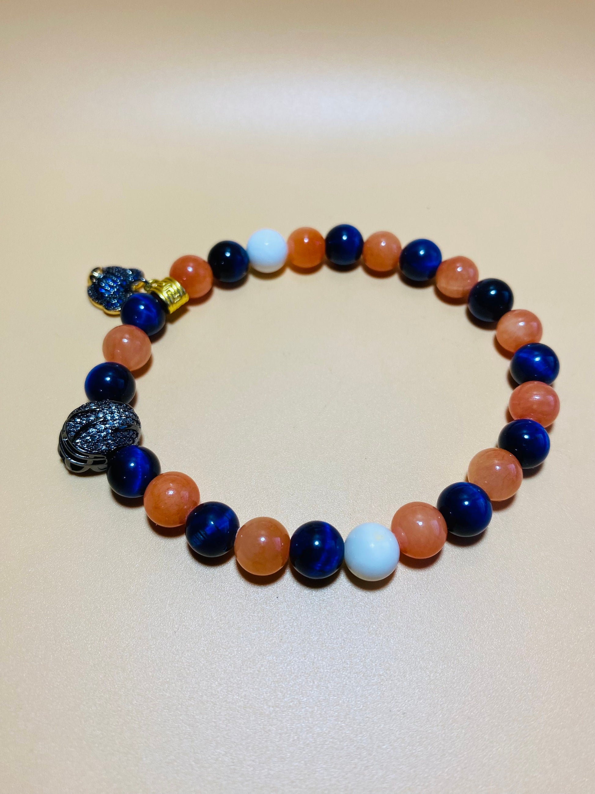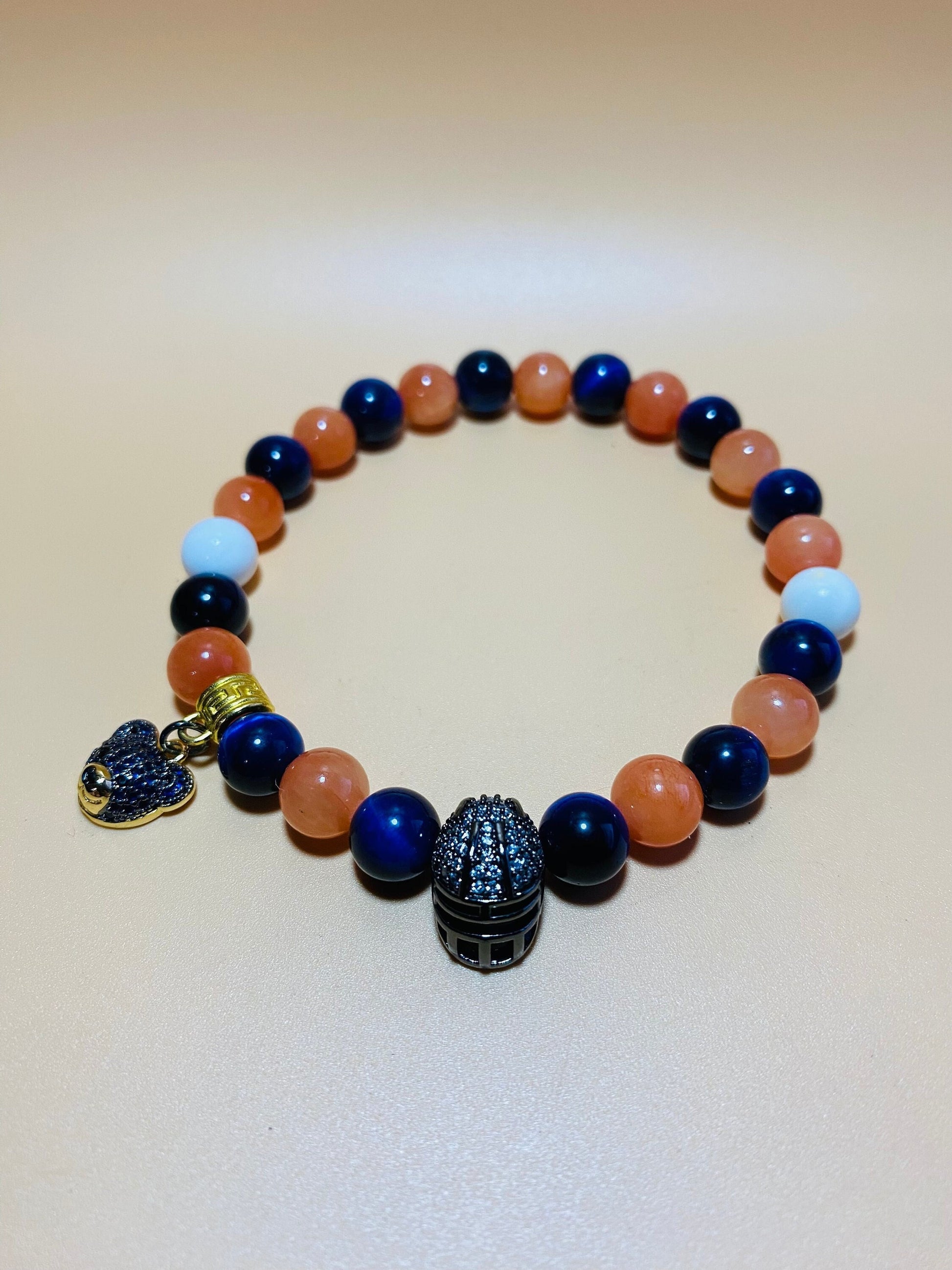 Show your true colors and team spirit with the Chicago Bears Bracelet, a must-have accessory for any die-hard fan! This stylish bracelet features a stunning combination of gemstone beads that not only catch the eye but also carry the essence of strength and loyalty. Each bead is carefully selected to represent the spirit of the Bears, making it a perfect way to showcase your devotion. Adorning this bracelet are charming accents in the form of a bear and a football helmet, symbolizing the heart and soul of Chicago football. These unique charms add a playful touch, making it a standout piece for game day or everyday wear. Whether you're at the stadium cheering for a touchdown or catching up with friends, this bracelet effortlessly elevates any outfit while ensuring you always represent your favorite team with pride. Don’t miss out on the chance to add this iconic Chicago Bears Bracelet to your collection. Perfect for gifting or treating yourself, it’s time to wear your enthusiasm on your wrist. Grab yours now and let the world know you’re a proud Bears fan!