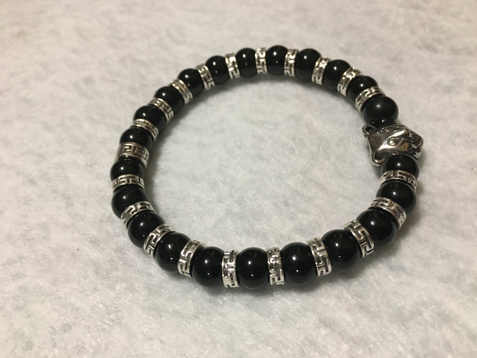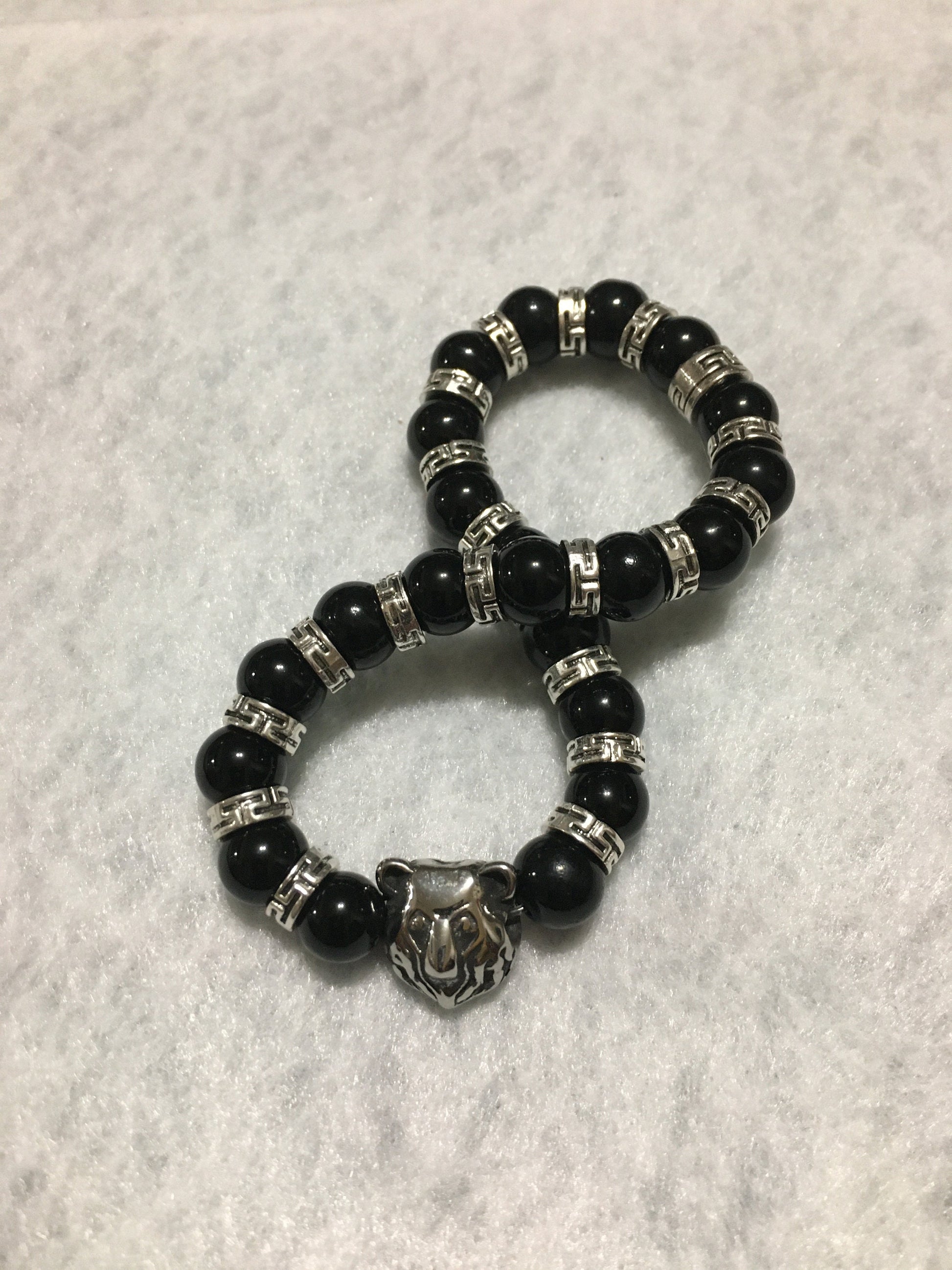 PRODUCT DETAILS - 8mm natural Onyx gemstone beads - Stainless steel bear head charm - Antique silver Tibetan tube spacer - Strong, stretchy cord - Handmade in a clean and safe environment