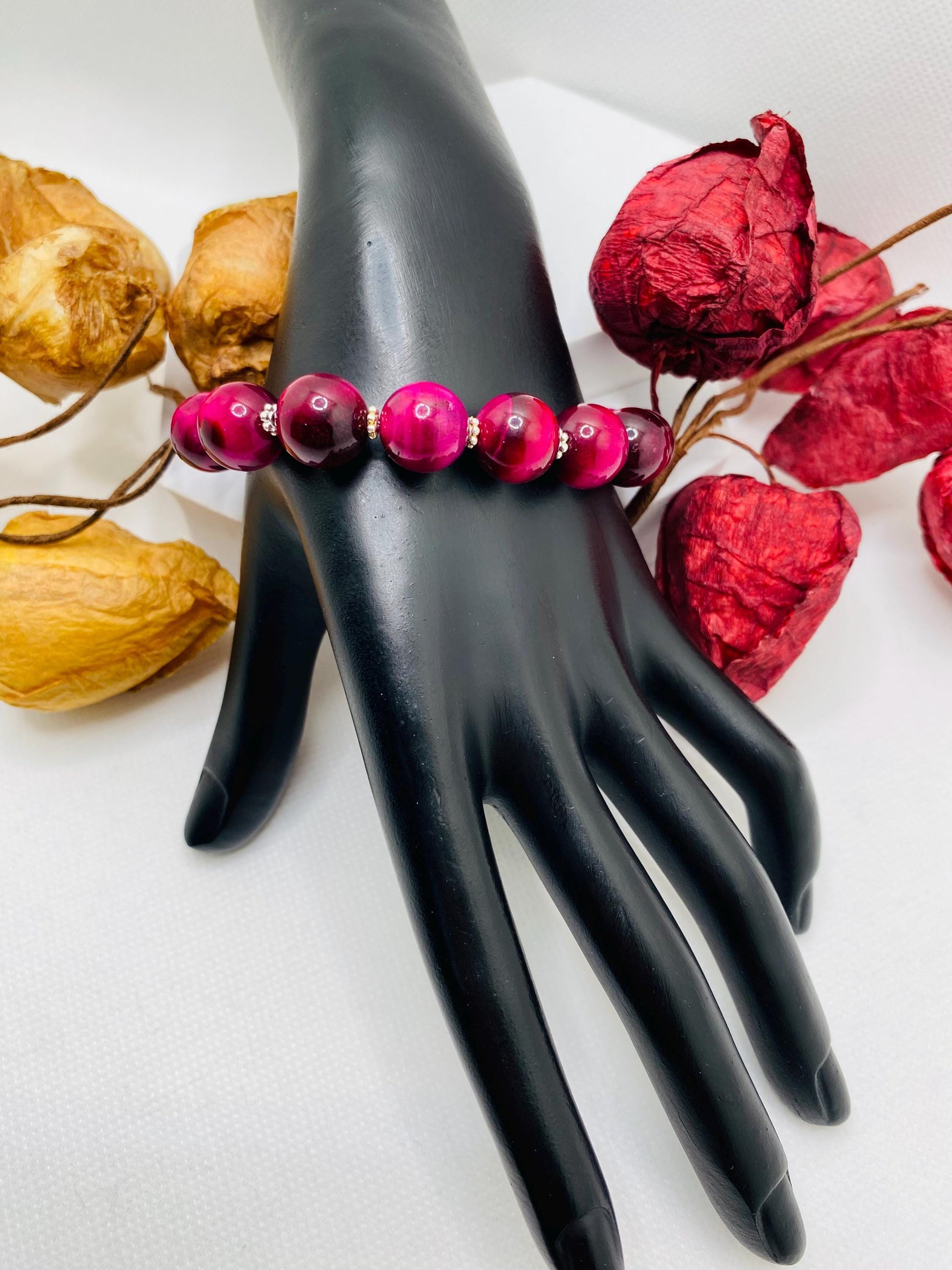 Elevate your style with our Chunky Rose Red Tigers Eye Bracelet, a stunning piece of handmade gemstone jewelry that combines sophistication with a touch of bohemian flair. Crafted from 12MM natural rose red tigers eye gemstone beads, this bracelet not only makes a bold fashion statement but also harnesses the protective energy associated with this stunning stone. Its rich, vibrant color is sure to catch the eye and spark conversation wherever you go. Each bead is thoughtfully separated by 4mm gold-plated snowflake spacers, adding a hint of elegance that perfectly complements the earthy tones of the tigers eye. The strong stretch design ensures a comfortable and secure fit for everyone, making it an ideal accessory for any wrist. Whether you’re dressing up for a night out or adding a pop of color to your everyday look, this bracelet is versatile enough to be worn on any occasion. Don’t miss out on the chance to add this unique piece to your jewelry collection. Treat yourself or surprise a loved one with a gift that embodies beauty and strength. Order your Chunky Rose Red Tigers Eye Bracelet today and let your style shine!