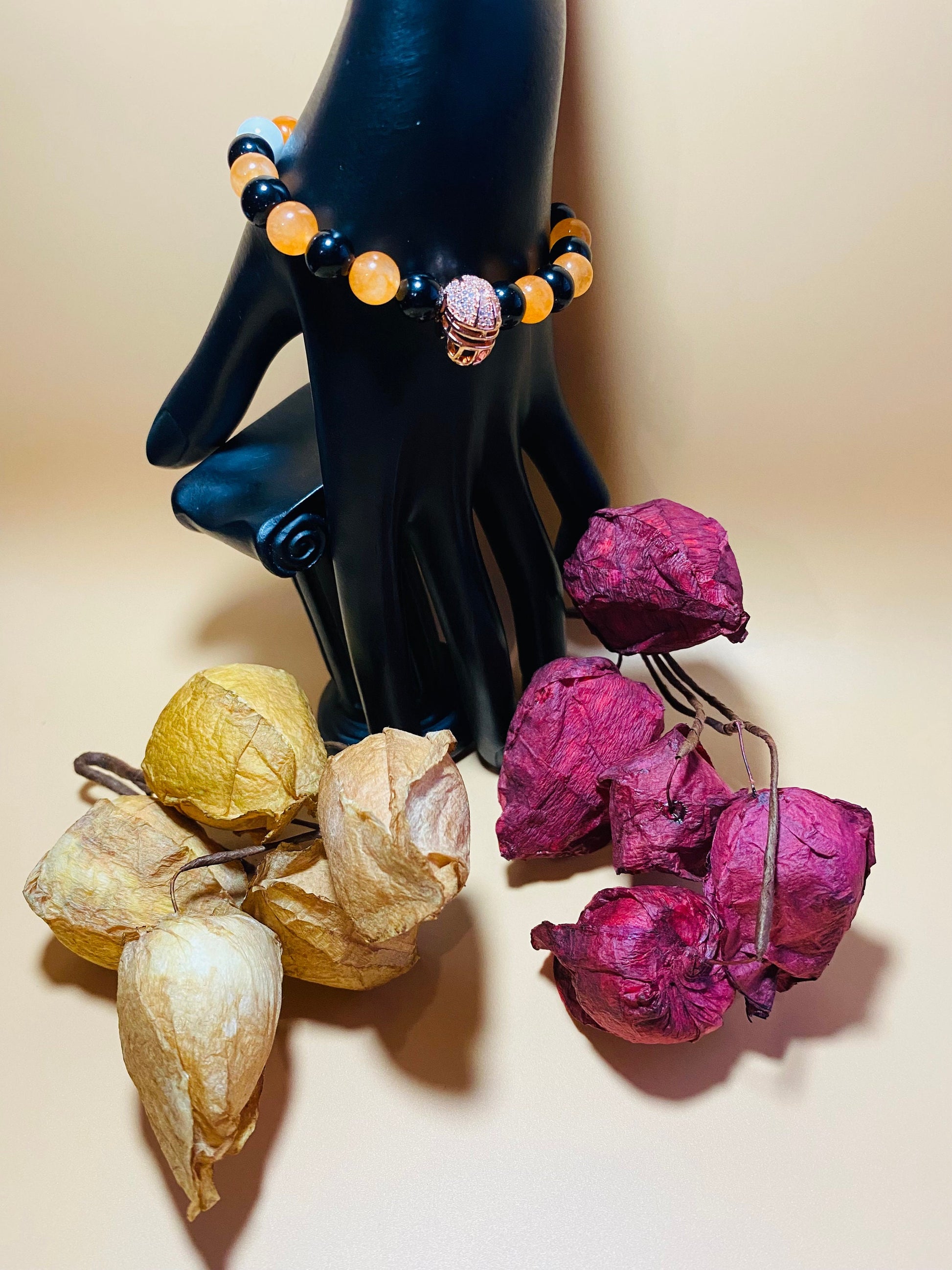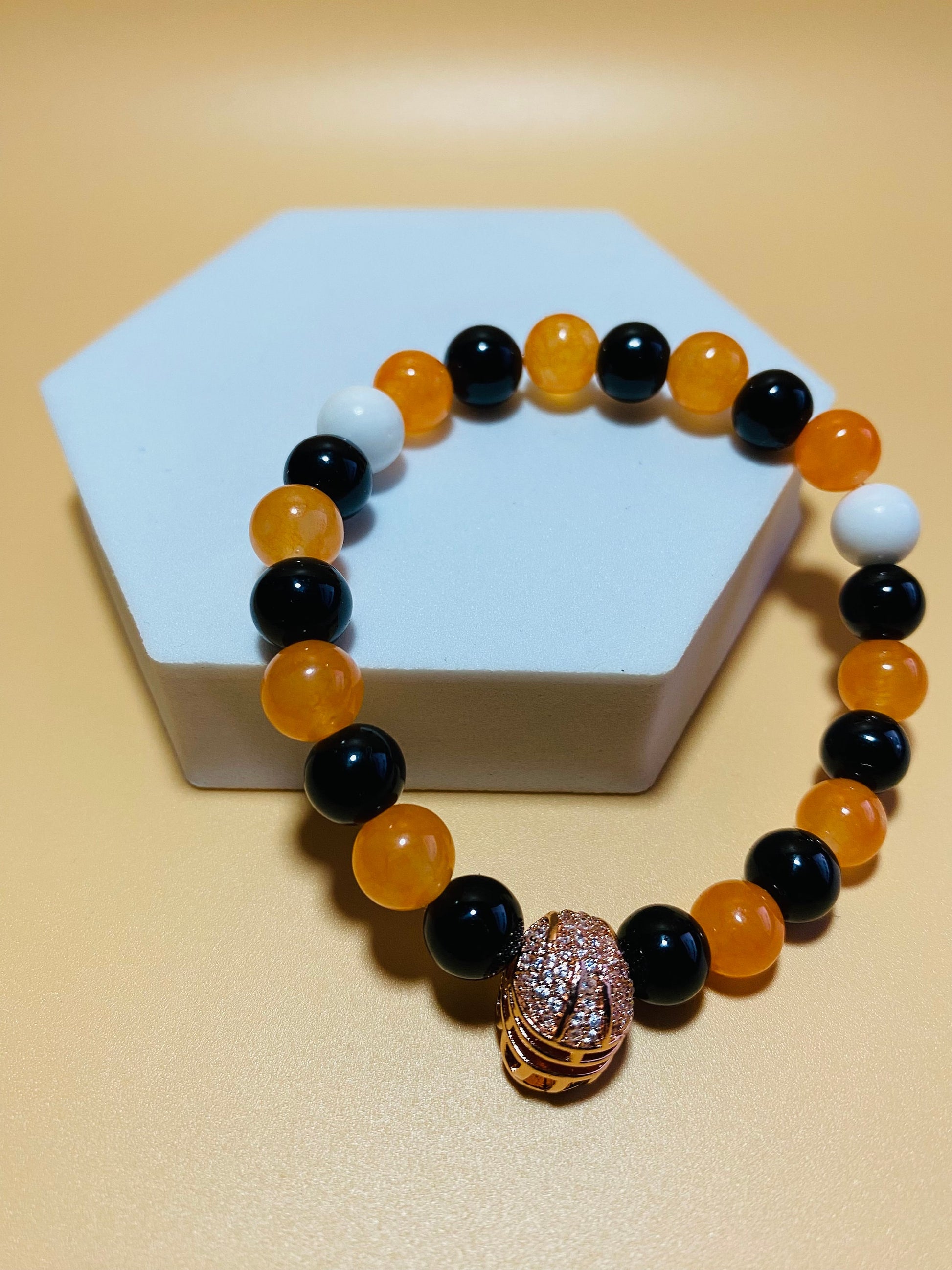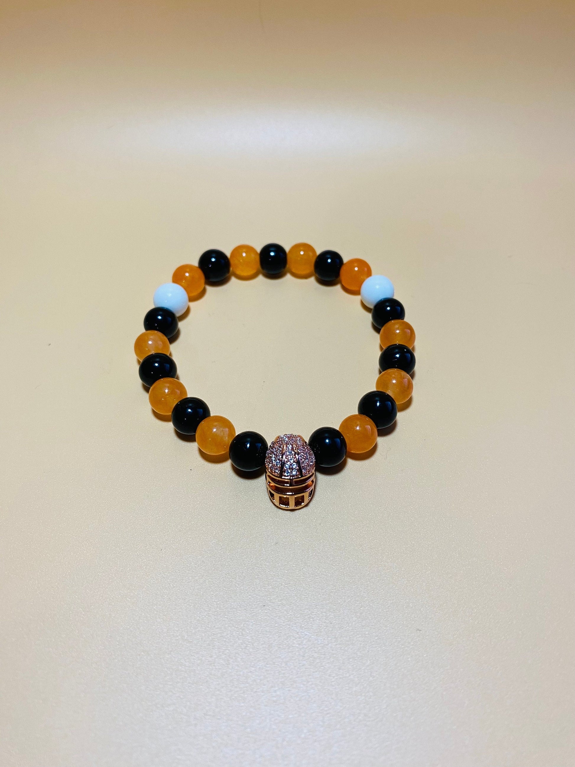 PRODUCT DETAIL - 8mm natural black onyx gemstone beads - 8mm natural white jade gemstone beads - 8mm natural orange jade gemstone beads - Rose Gold plated football helmet with inlaid cubic zirconia - Strong, stretchy cord - Handmade in a clean and safe environment