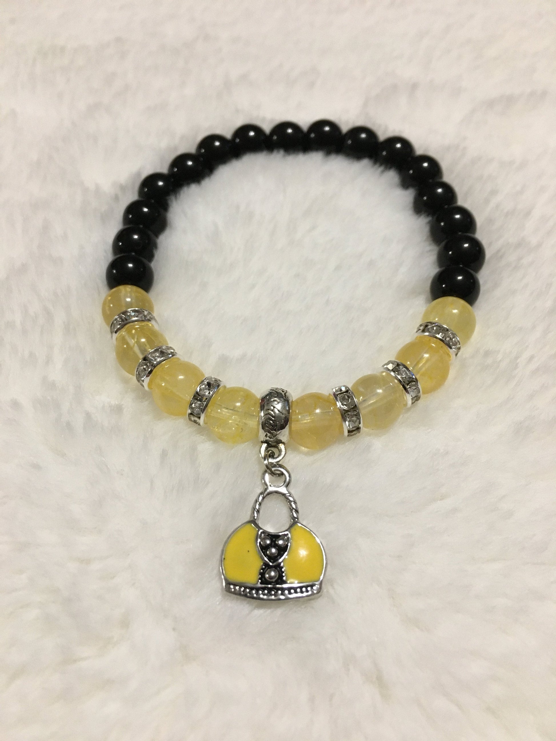 PRODUCT DETAILS - Beautiful onyx and citrine gemstone beaded charm bracelet - 8mm natural onyx gemstone beads - 8mm natural citrine gemstone beads - Silver plated enameled handbag charm - Antique silver round bail charm holder - Silver plated rondelles with rhinestone crystals - Strong, stretchy cord - Handmade in a clean and safe environment