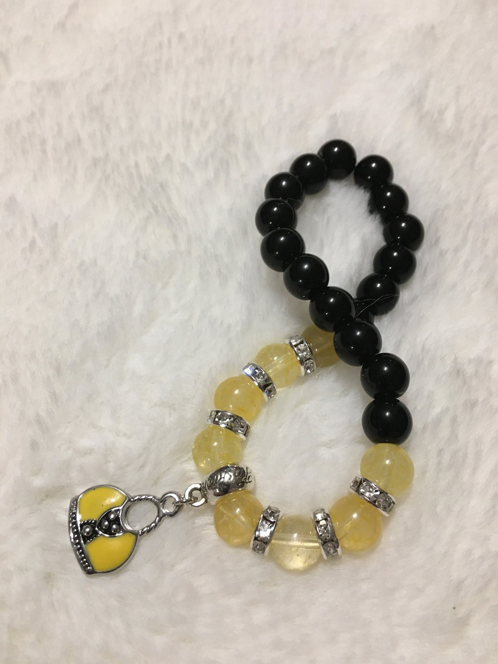 Elevate your accessory game with our stunning Citrine & Black Onyx Bracelet. This beautifully crafted charm bracelet features 8mm natural onyx gemstone beads paired with vibrant citrine accents, creating a striking contrast that catches the eye. The addition of a silver purse charm and sparkling rhinestone accents gives this piece an extra touch of glamour, making it perfect for any occasion, from casual outings to elegant events. Designed for both style and comfort, this bracelet is lightweight and easy to wear. The natural onyx beads are not only visually captivating but also symbolize strength and protection, while the citrine is a stone of abundance and positivity. Whether you're treating yourself or searching for the ideal gift for a loved one, this bracelet embodies a blend of fashion and meaning that resonates with everyone. Don’t miss the chance to own this exquisite piece of jewelry that adds flair to your collection. Grab your Citrine & Black Onyx Bracelet today and shine with every step you take!