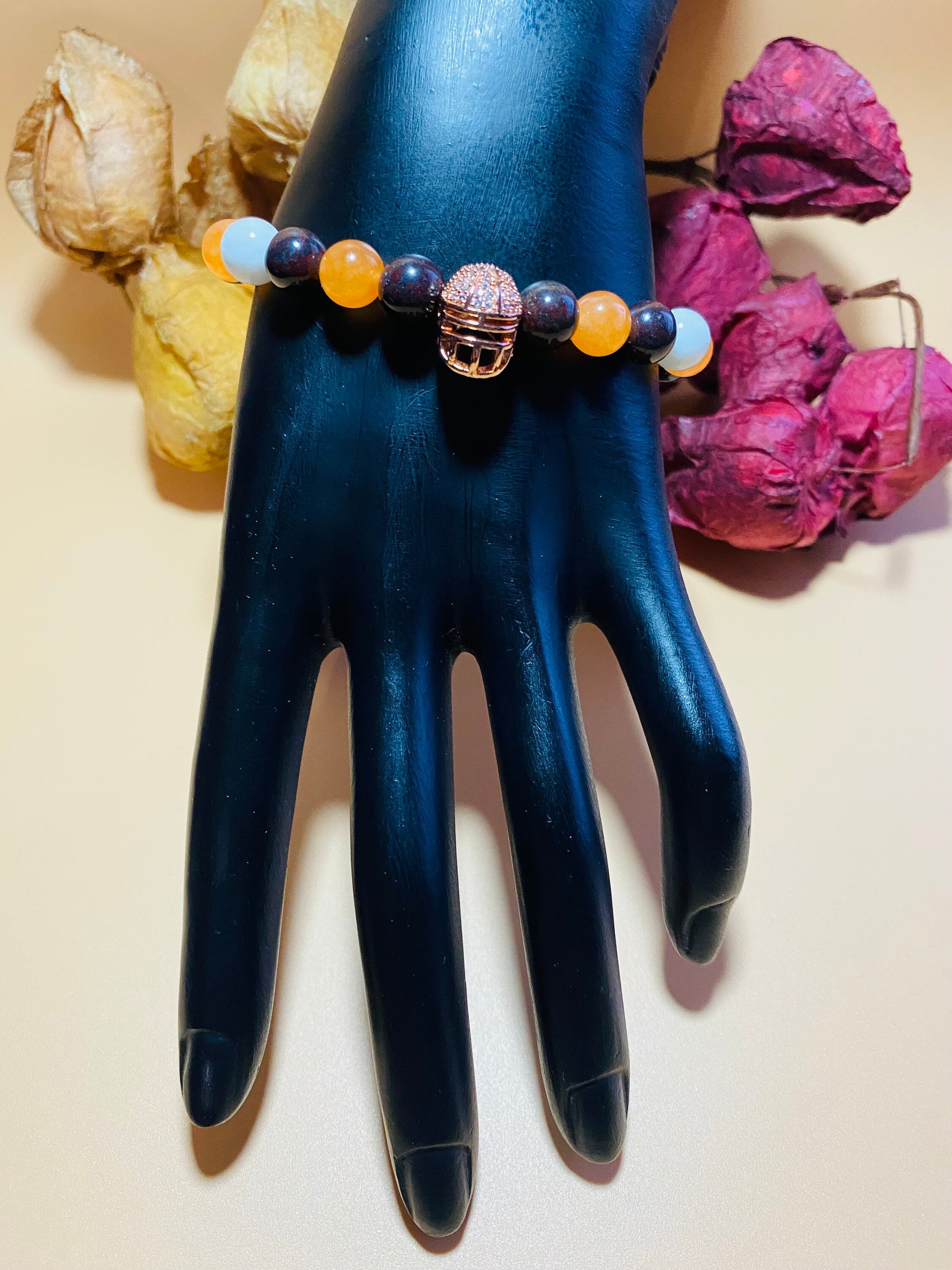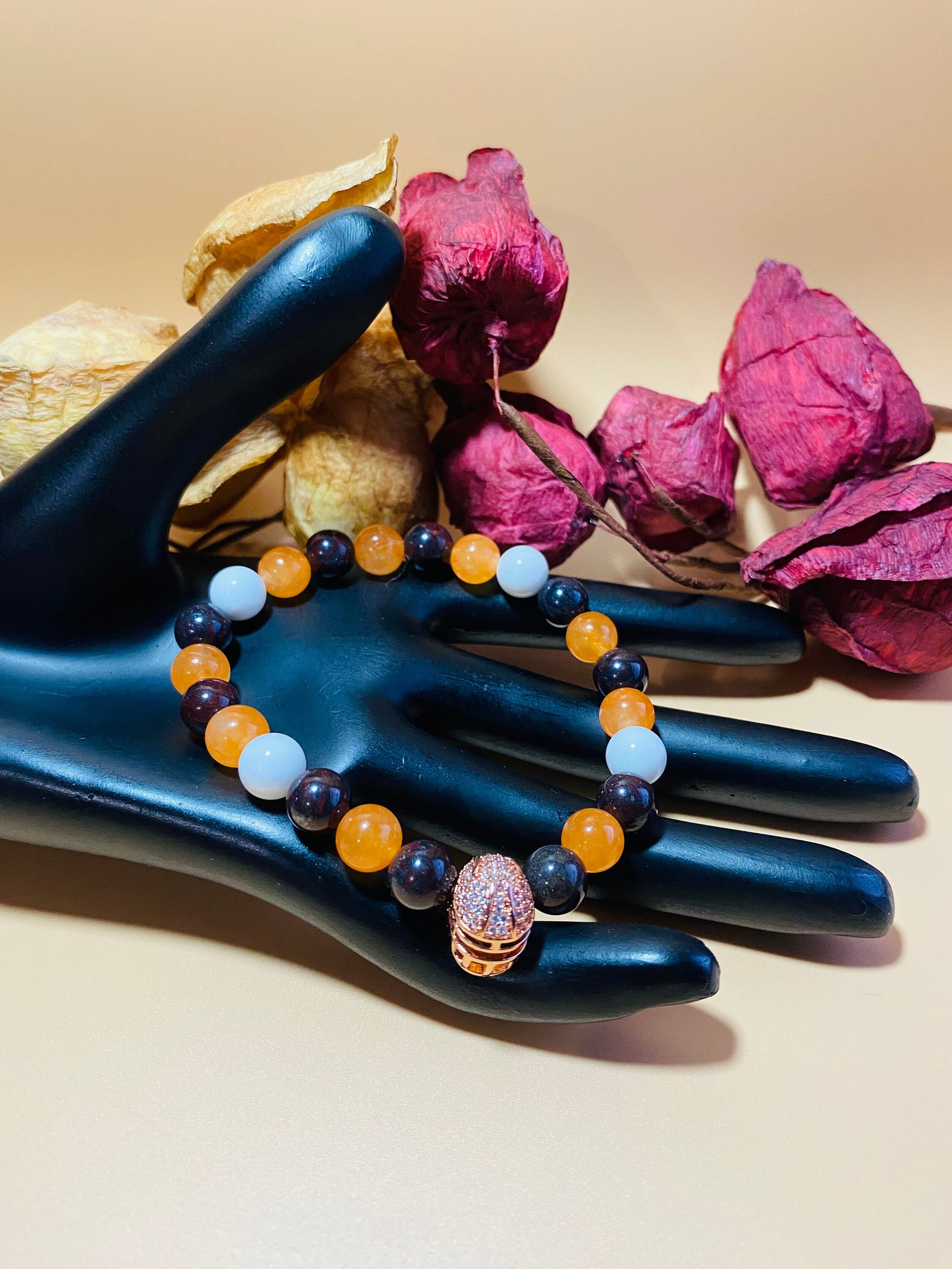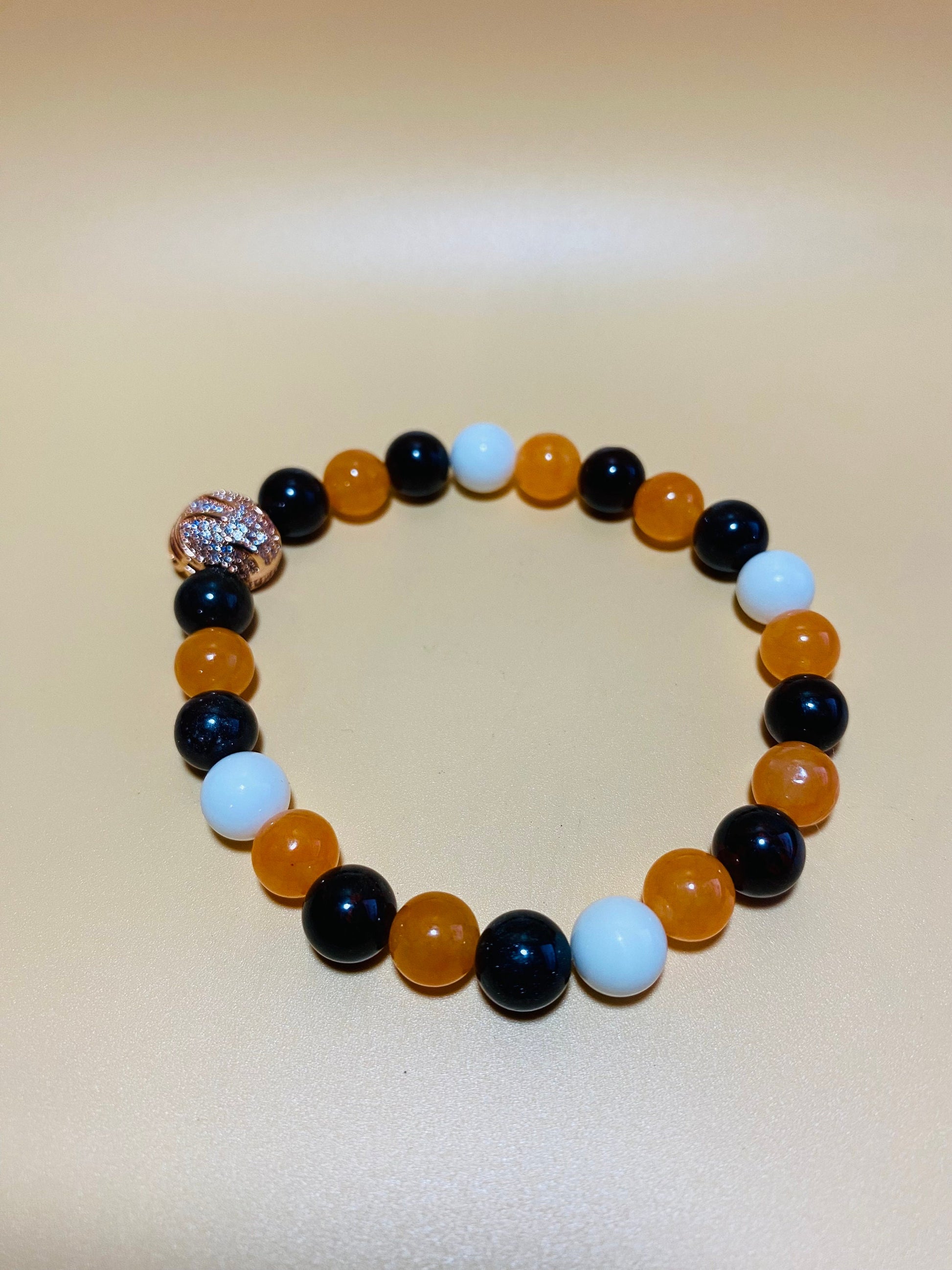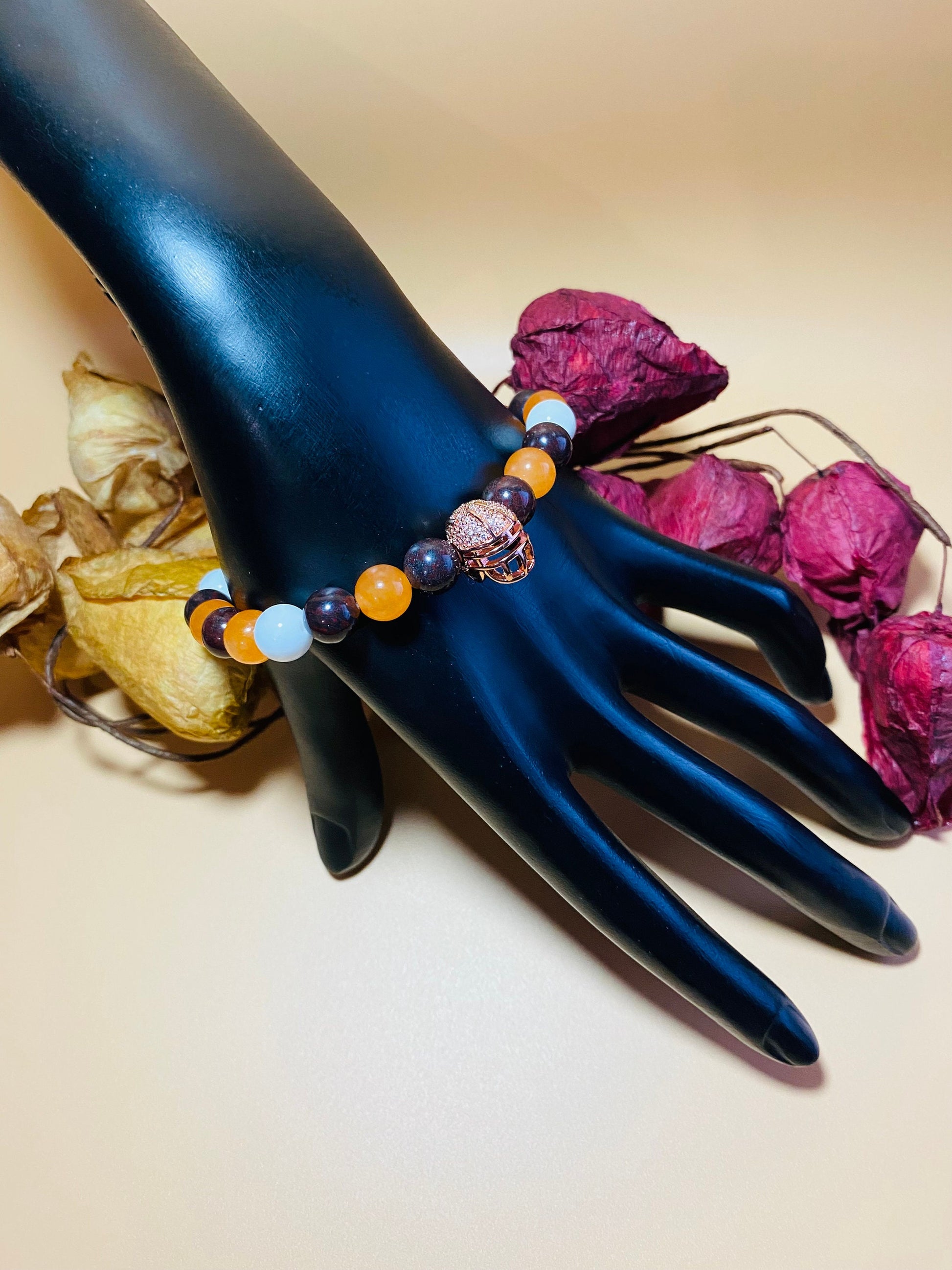PRODUCT DETAIL - 8mm natural brown Bronzite gemstone beads - 8mm natural white jade gemstone beads - 8mm natural orange jade gemstone beads - Rose Gold plated football helmet with inlaid cubic zirconia - Strong, stretchy cord - Handmade in a clean and safe environment