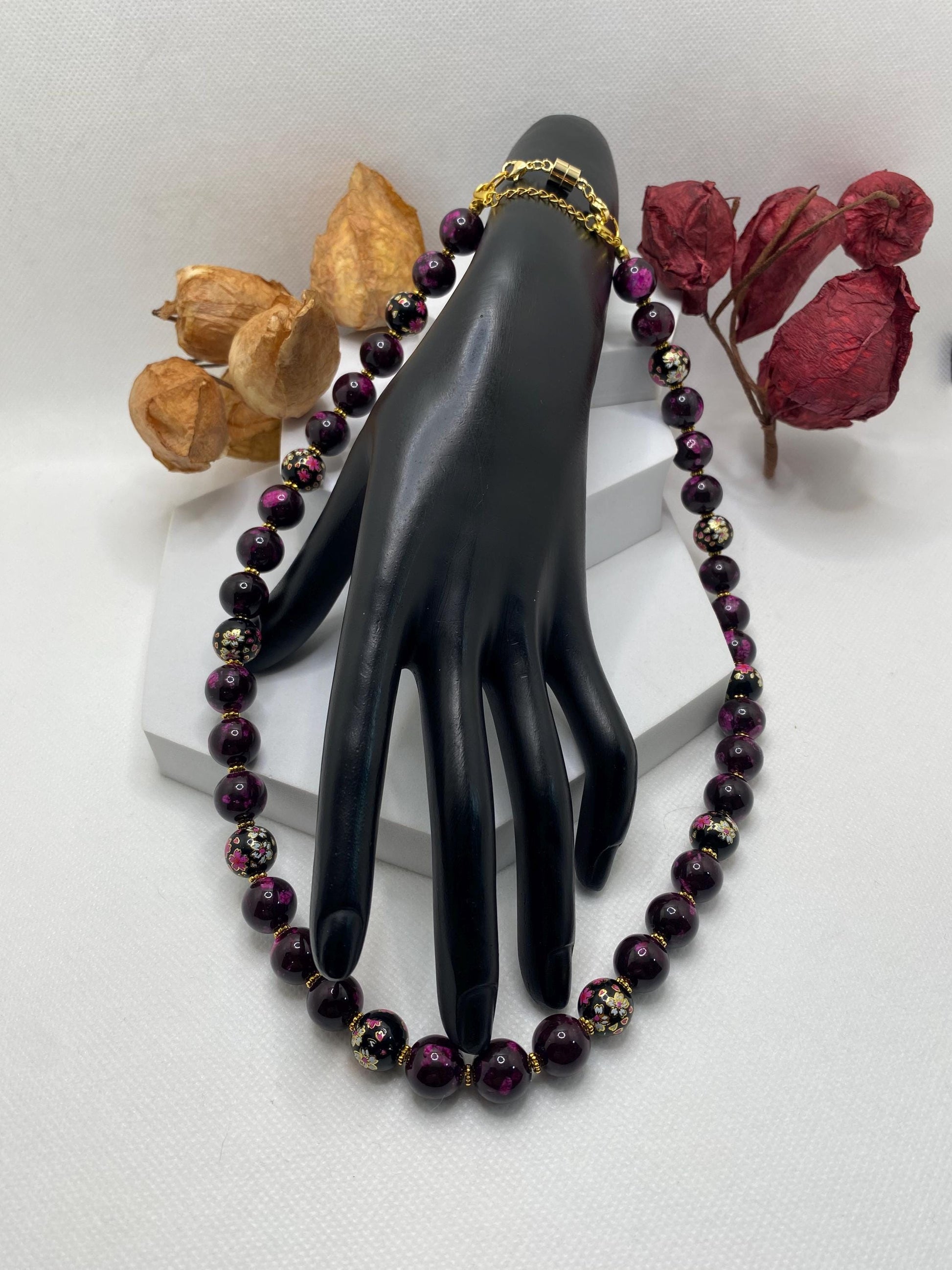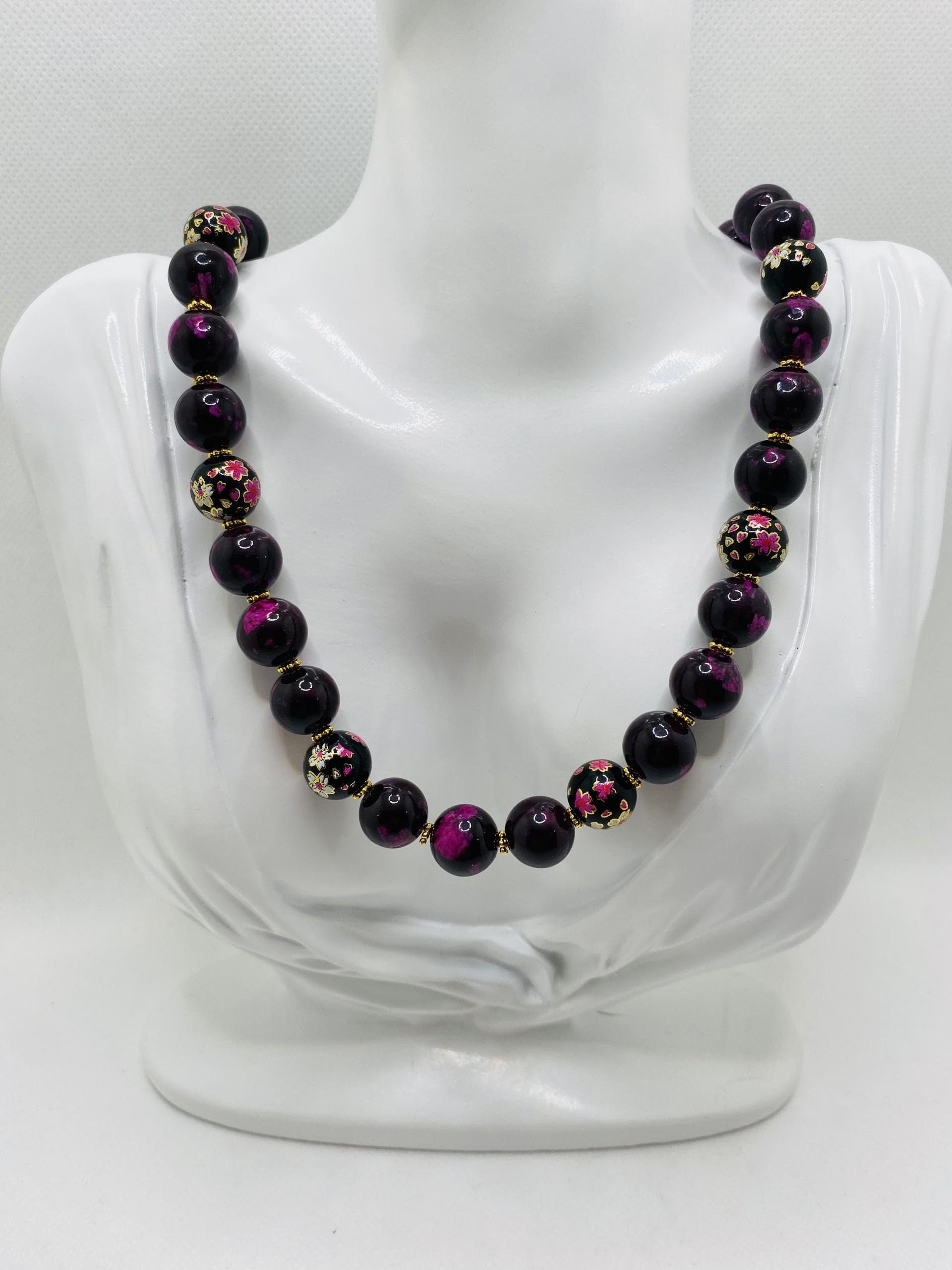 Elevate your accessory collection with our stunning Dark Red Jasper Beaded Necklace, a perfect blend of natural beauty and contemporary style. This eye-catching piece features 12mm natural dark red Jasper gemstone beads that are not only striking but also believed to promote emotional balance and stability. Each bead is unique, showcasing rich hues that beautifully catch the light. Interspersed among the Jasper beads are 12mm black transparent painted floral glass accents that add a touch of whimsy and charm. The intricate floral design complements the deep tones of the Jasper, creating a harmonious balance that is perfect for any outfit, whether you're dressing up for a night out or adding flair to your casual wear. The necklace is finished with elegant gold accents that elevate its overall aesthetic, making it a must-have accessory for trendsetters. Don’t miss out on the chance to own this one-of-a-kind piece. Embrace the beauty and versatility of the Dark Red Jasper Beaded Necklace—order yours today and make a statement that truly reflects your personal style!