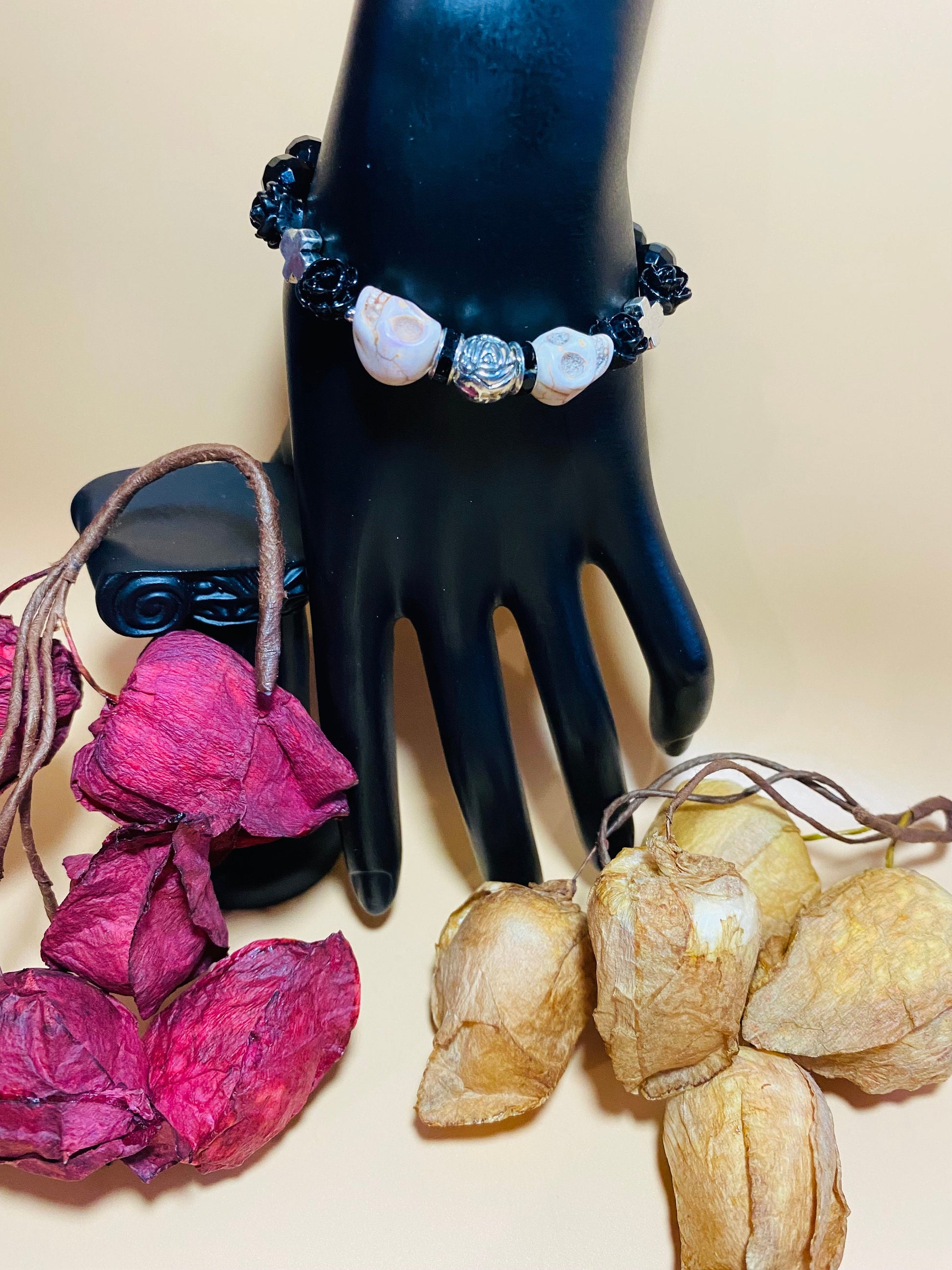 PRODUCT DETAILS - Black Onyx skull charm and Cross bracelet - 8mm Faceted black Onyx gemstone Beads - 8mm Black Acrylic Rose Beads - white, turquoise skull head charm Beads - Antique silver cross bead spacers - Antique Silver Round Floral Sphere - Strong, stretchy cord - Handmade in a clean and safe environment
