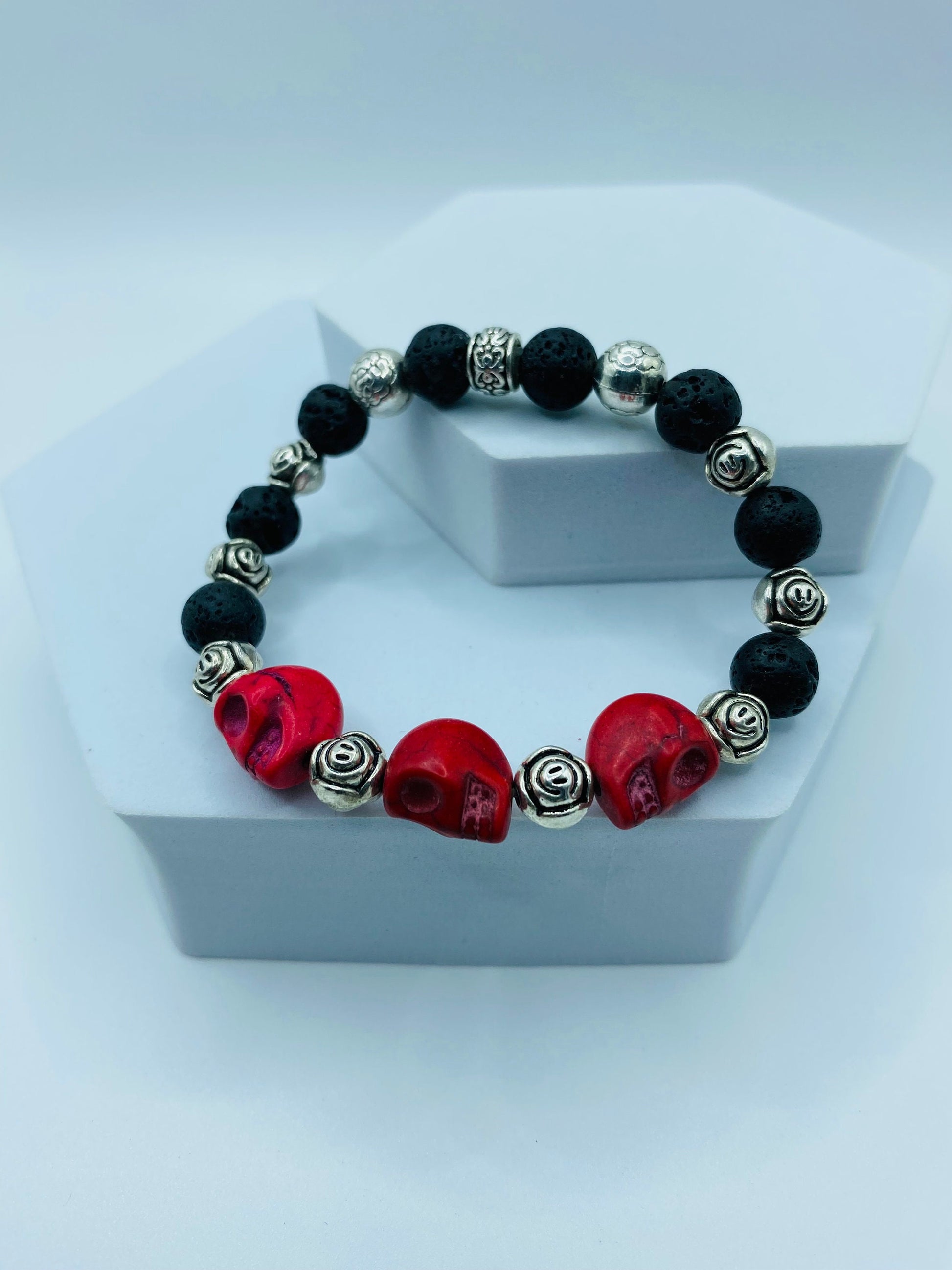 PRODUCT DETAILS - Lava Rock gemstone charm bracelet - 8mm lava rock gemstone beads - Red, turquoise skull head charms - Antique silver Rose bead spacers - Strong, stretchy cord - Handmade in a clean and safe environment