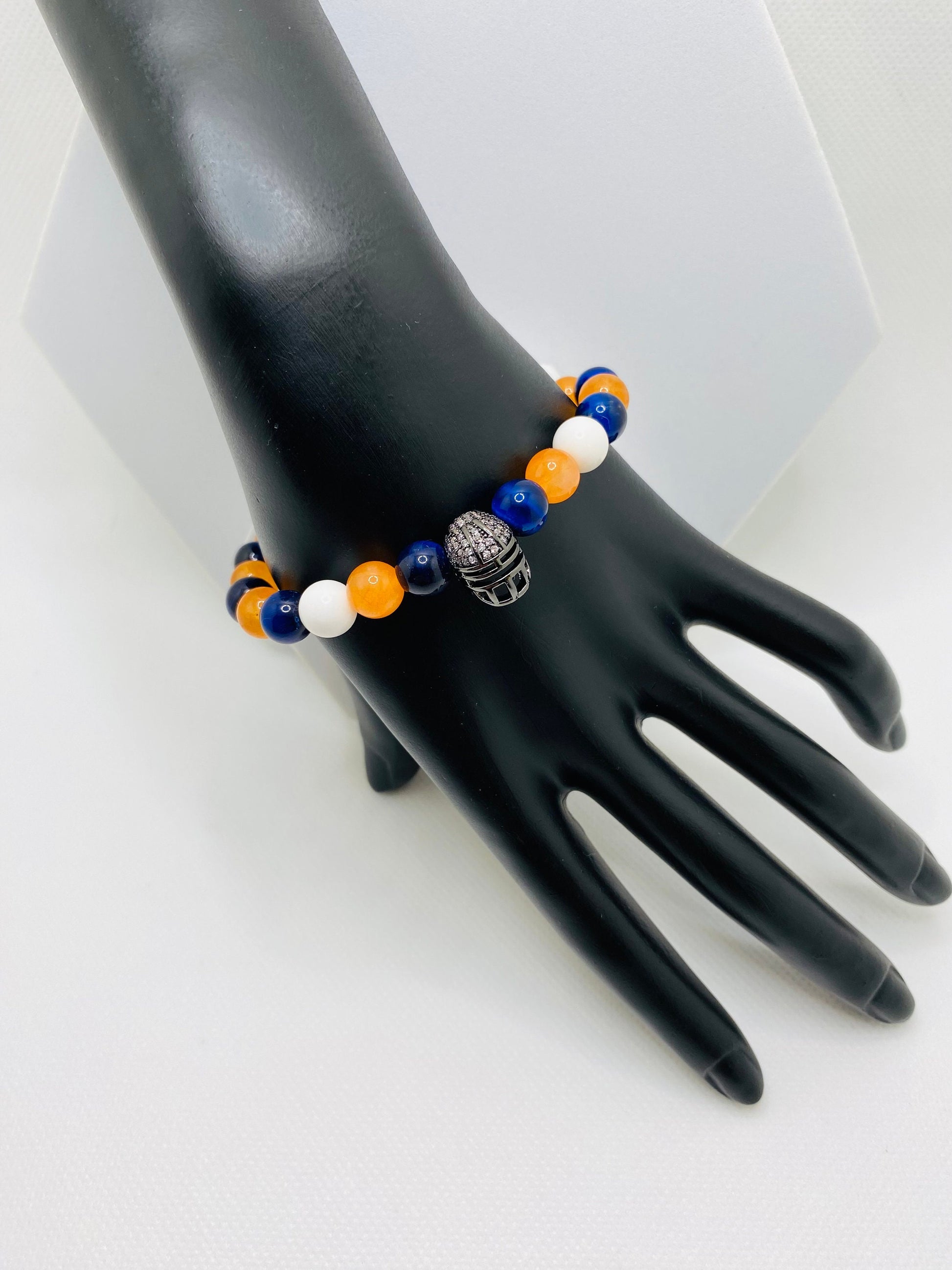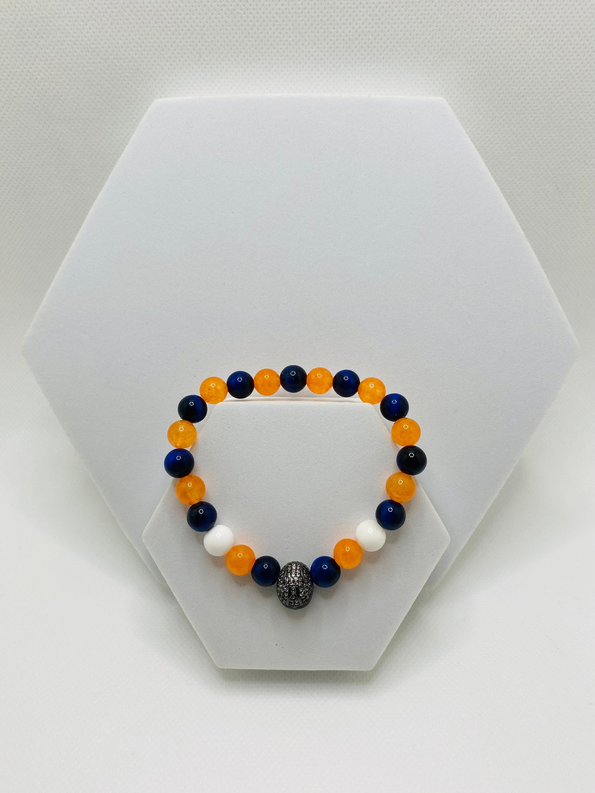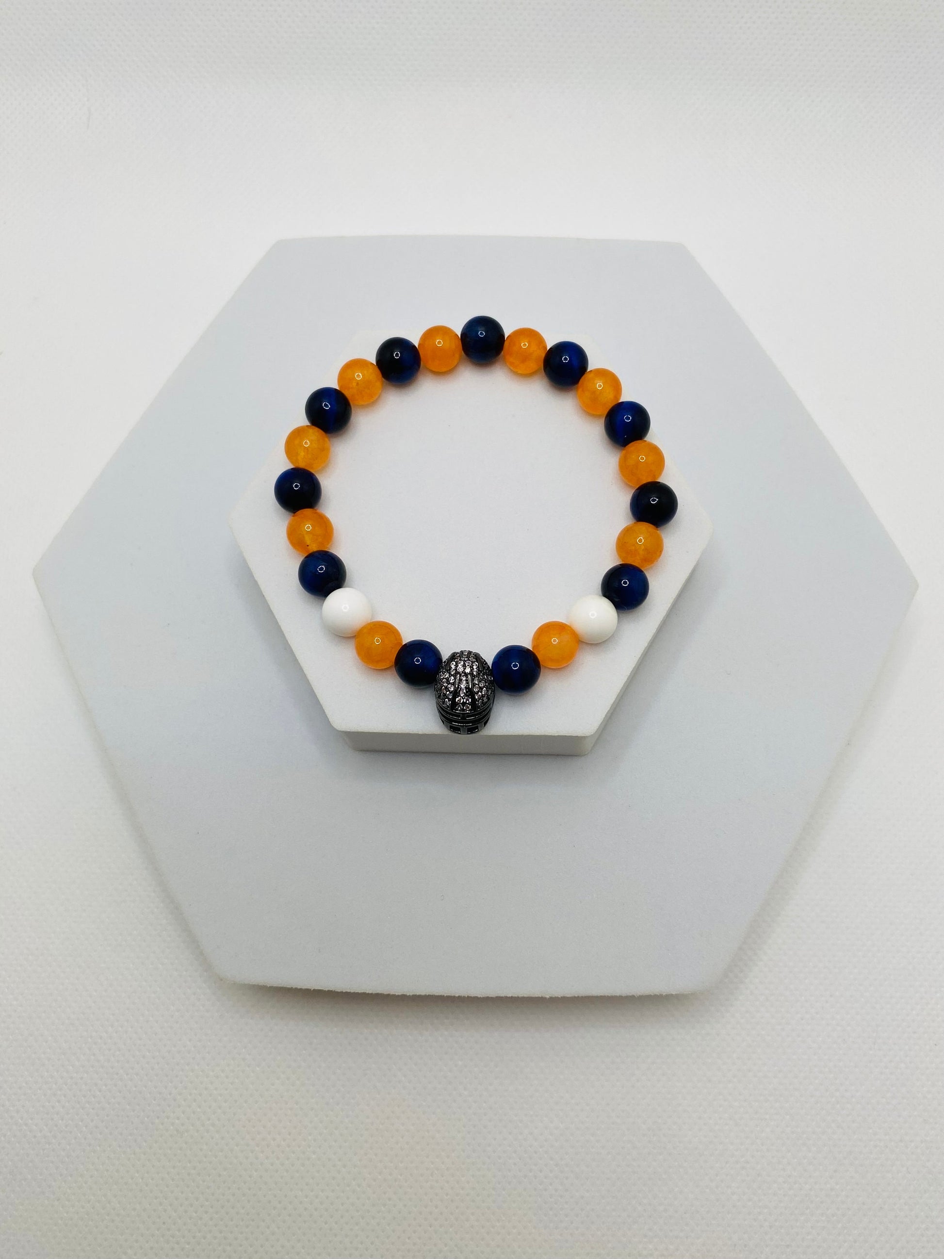 PRODUCT DETAIL - 8mm natural blue tigers eye gemstone beads - 8mm natural white jade gemstone beads - 8mm natural orange jade gemstone beads - Gum metal plated football helmet with inlaid cubic zirconia - Strong, stretchy cord - Handmade in a clean and safe environment