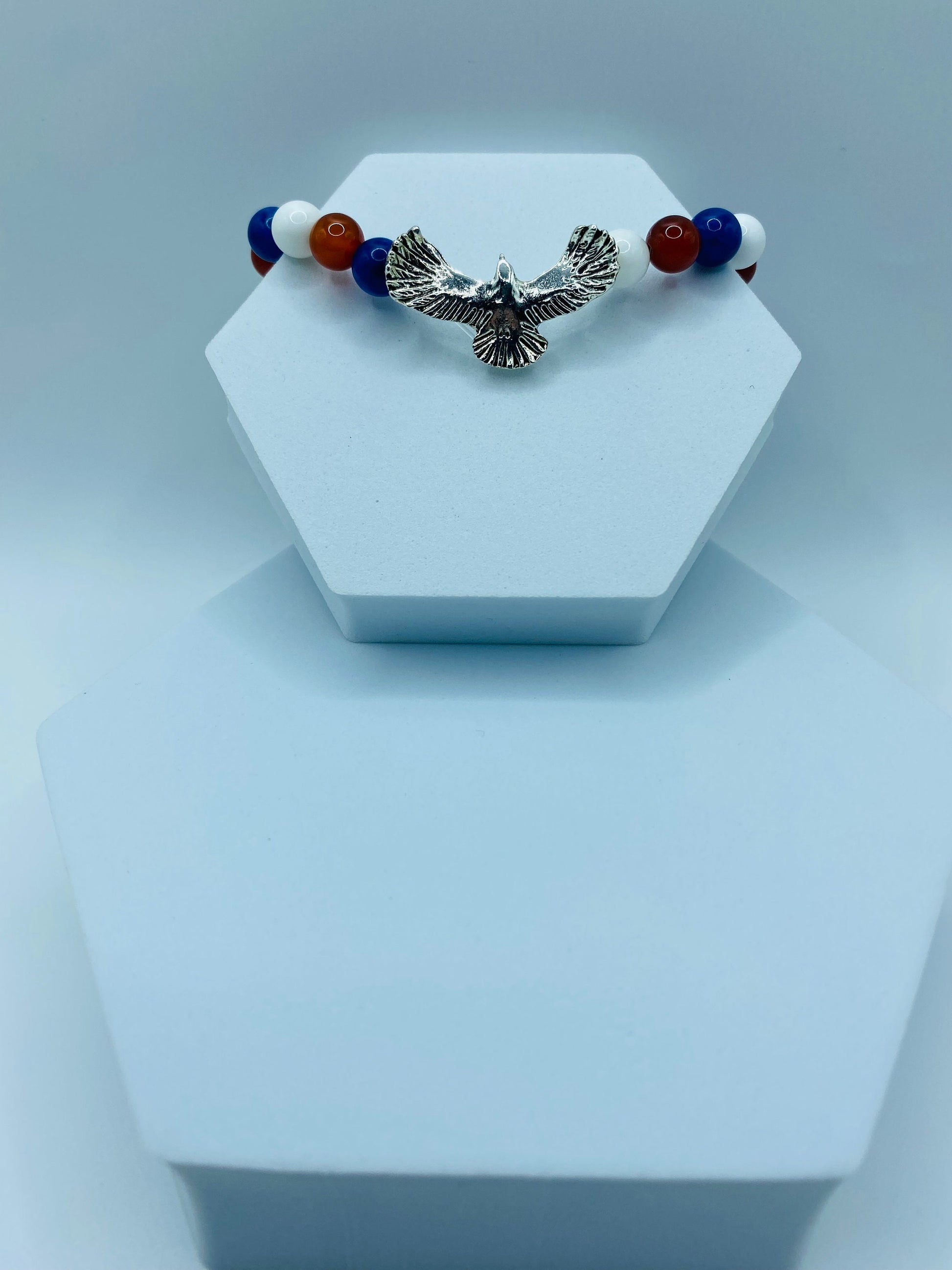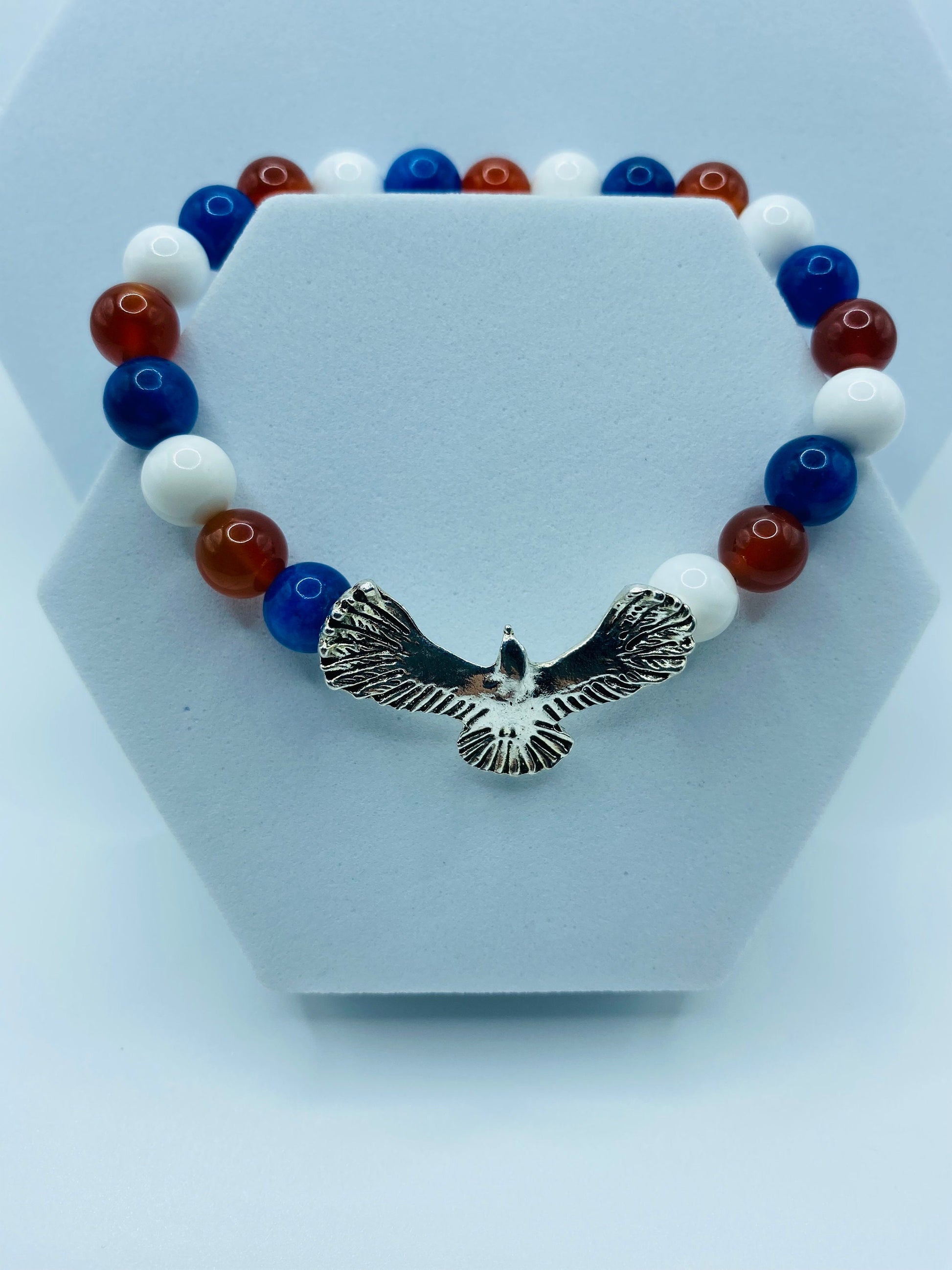Celebrate Independence Day in style with this stunning Eagle Bracelet featuring patriotic Red, White, and Blue gemstone beads. The bold colors symbolize freedom and unity, while the eagle charm represents strength and courage. Handcrafted with care, this bracelet is a perfect accessory to show your pride and honor the spirit of America. Add a touch of patriotism to your outfit and wear this unique bracelet on July 4th and all year round. Add this unique accessory to your jewelry collection and stand out with style and patriotism!
