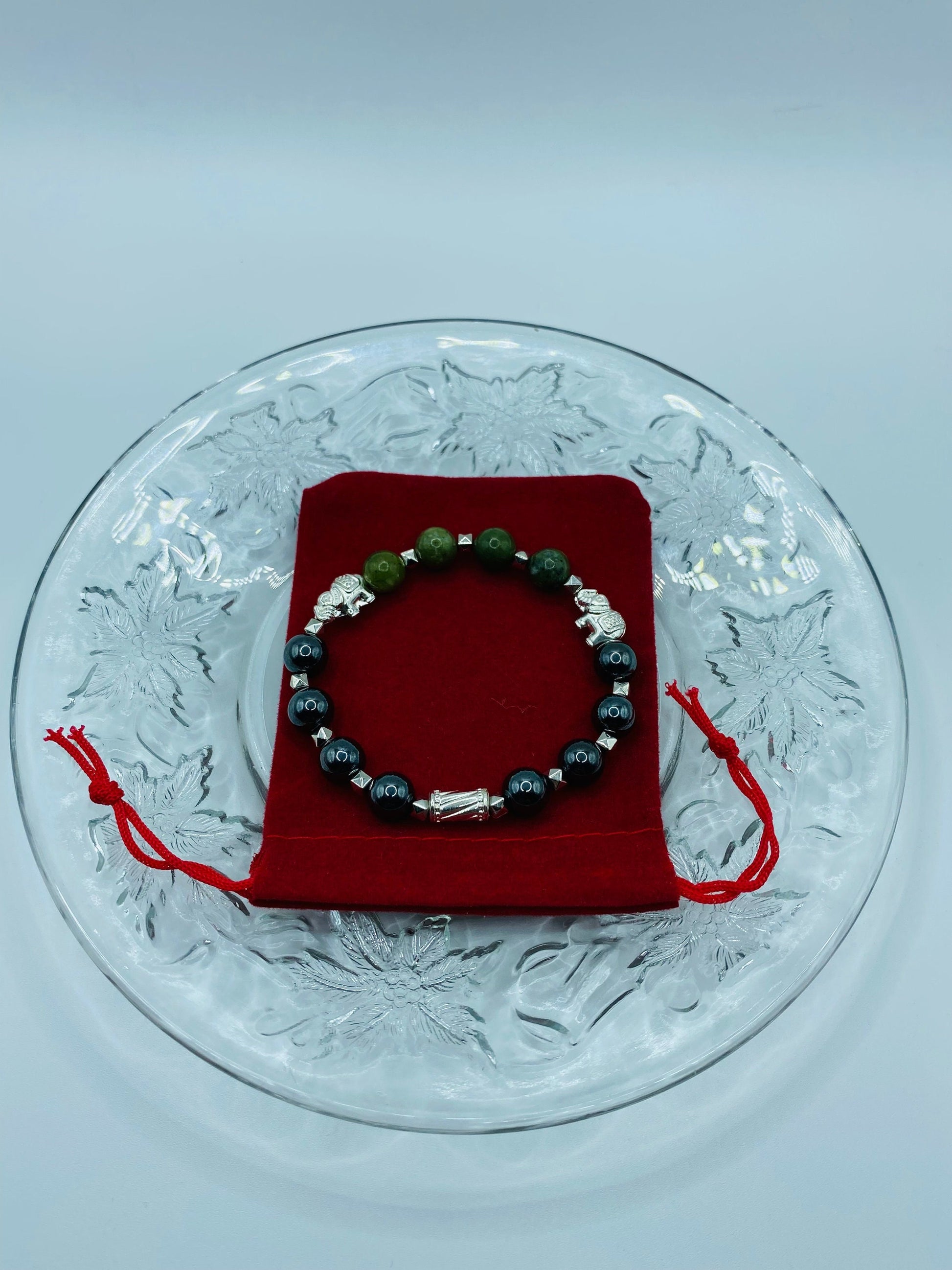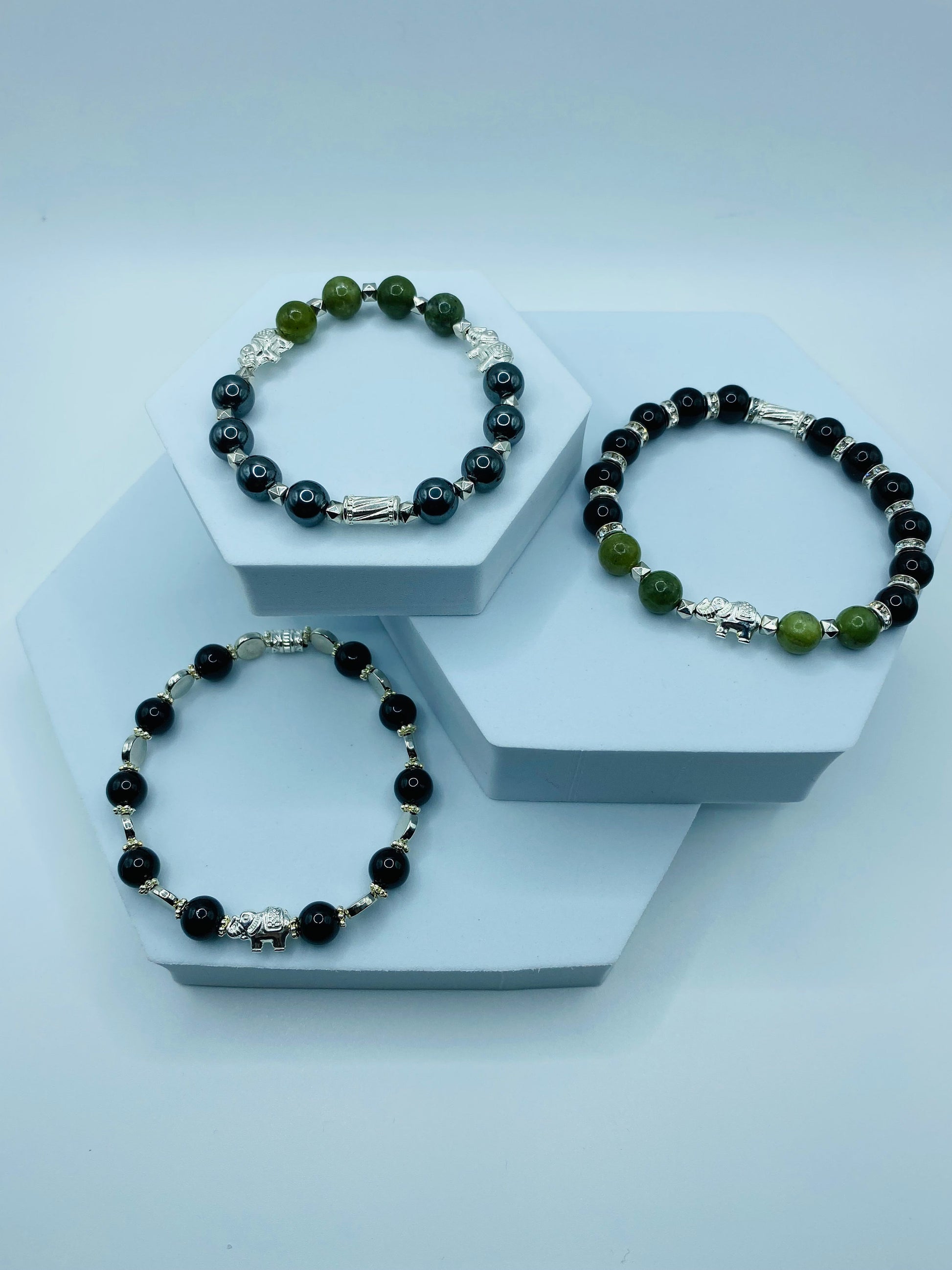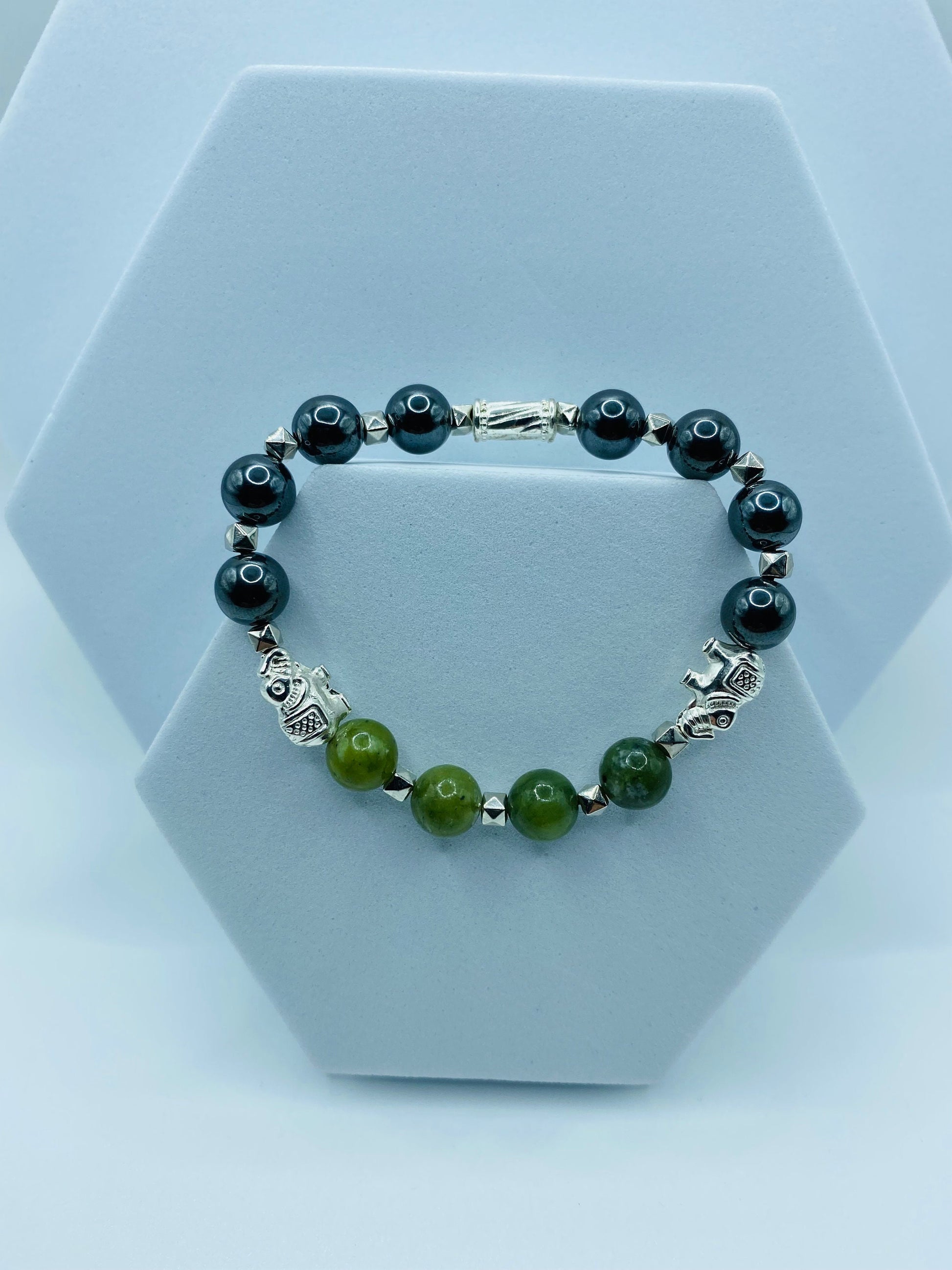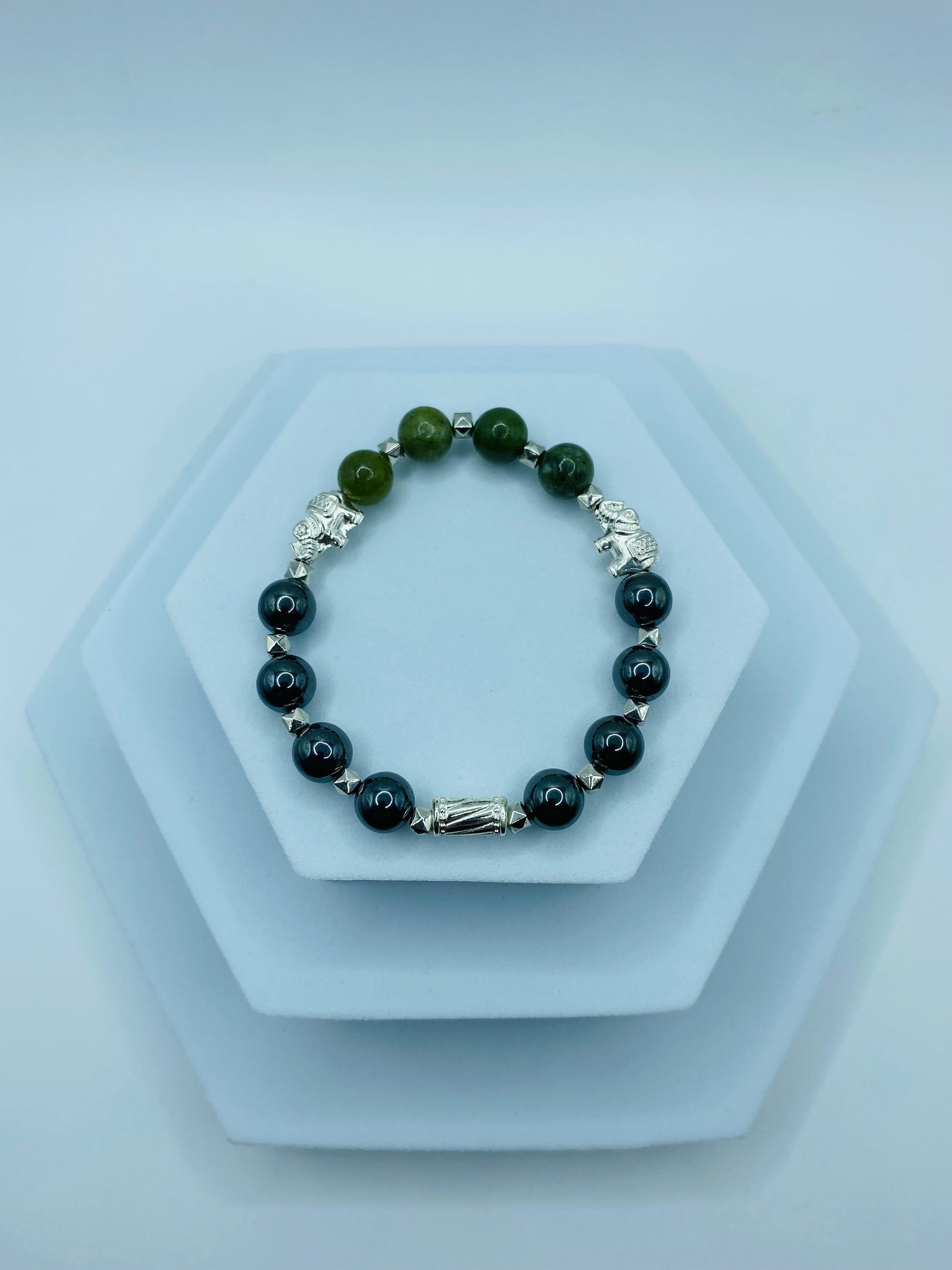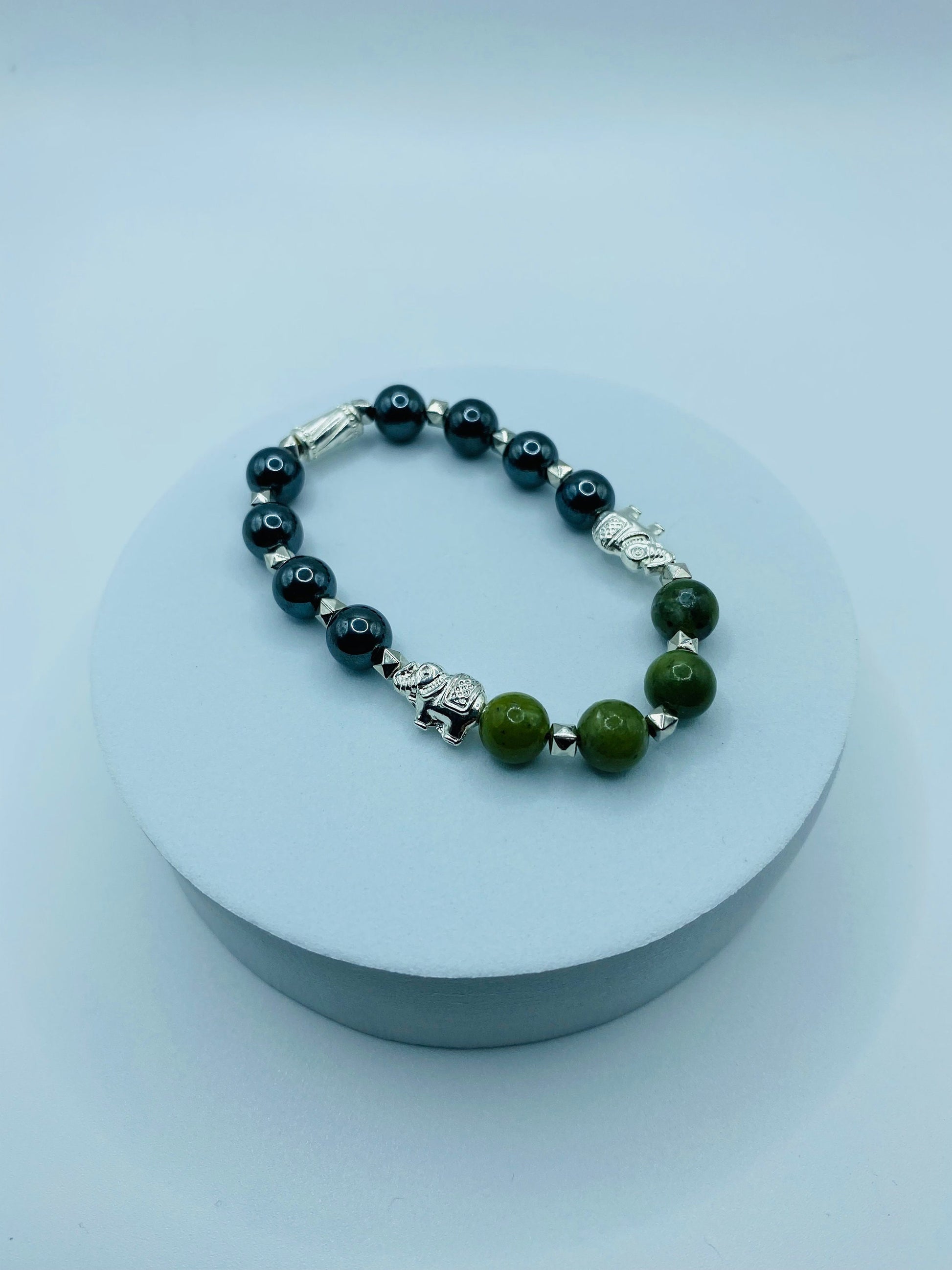 PRODUCT DETAILS - Women's green jade elephant charm bead bracelet - 8mm natural green jade gemstone beads - 8mm natural hematite gemstone beads - Silver Plated Elephant Bead Charms - 3mm square white gold spacers - Silver plated tube spacer - Strong, stretchy cord - Handmade in a clean and safe environment