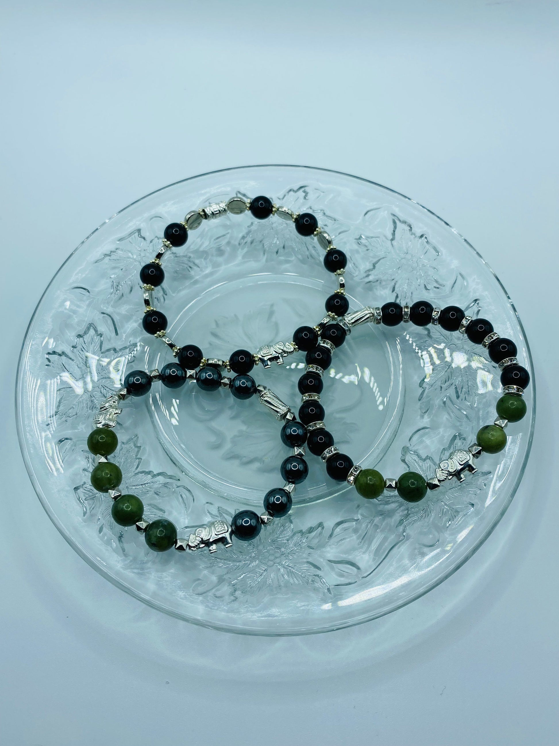 Elephant Jewelry White Gold Womens Bracelet with Jade & Hematite Gemstone Beads - Elephant Gifts