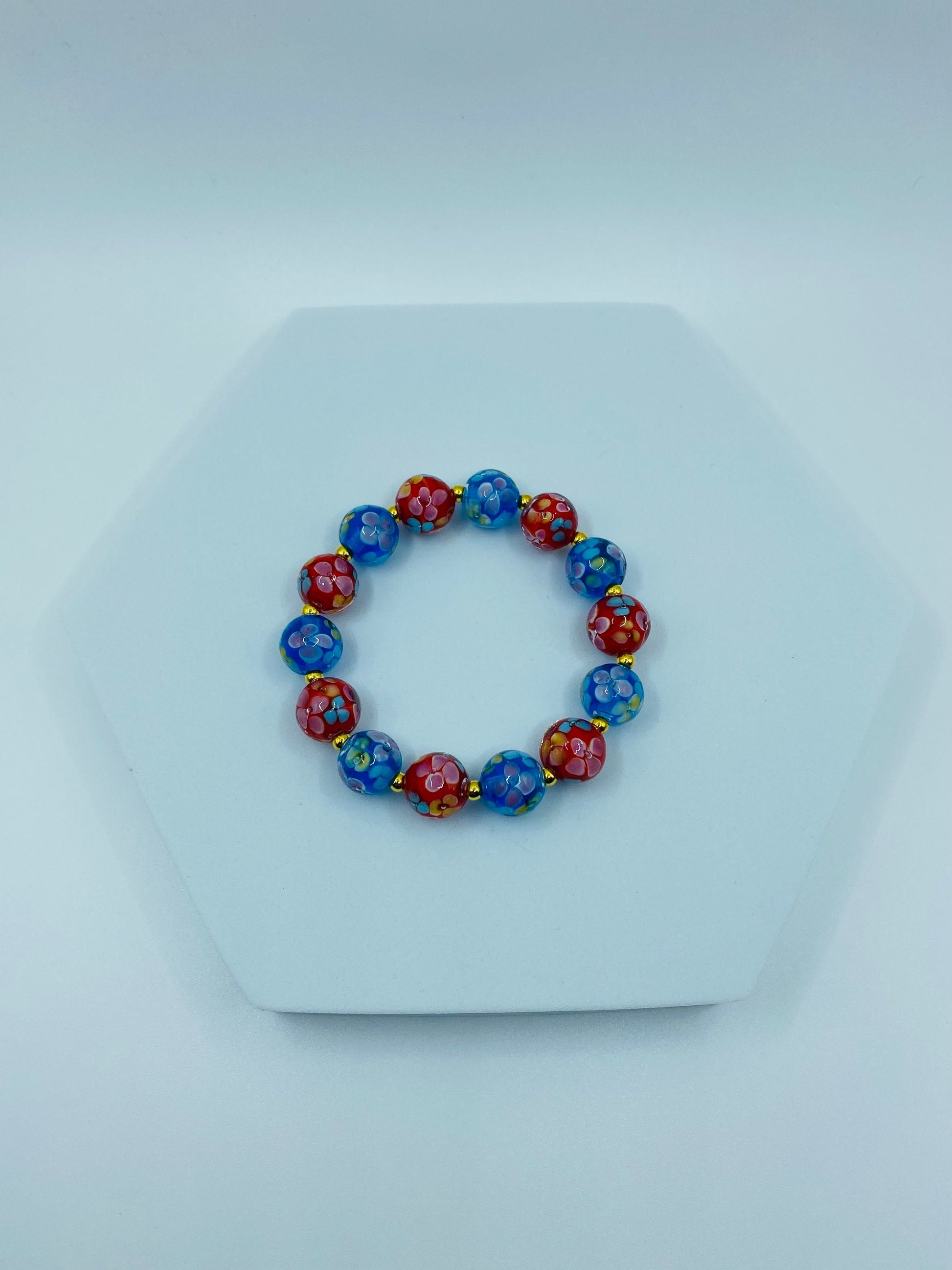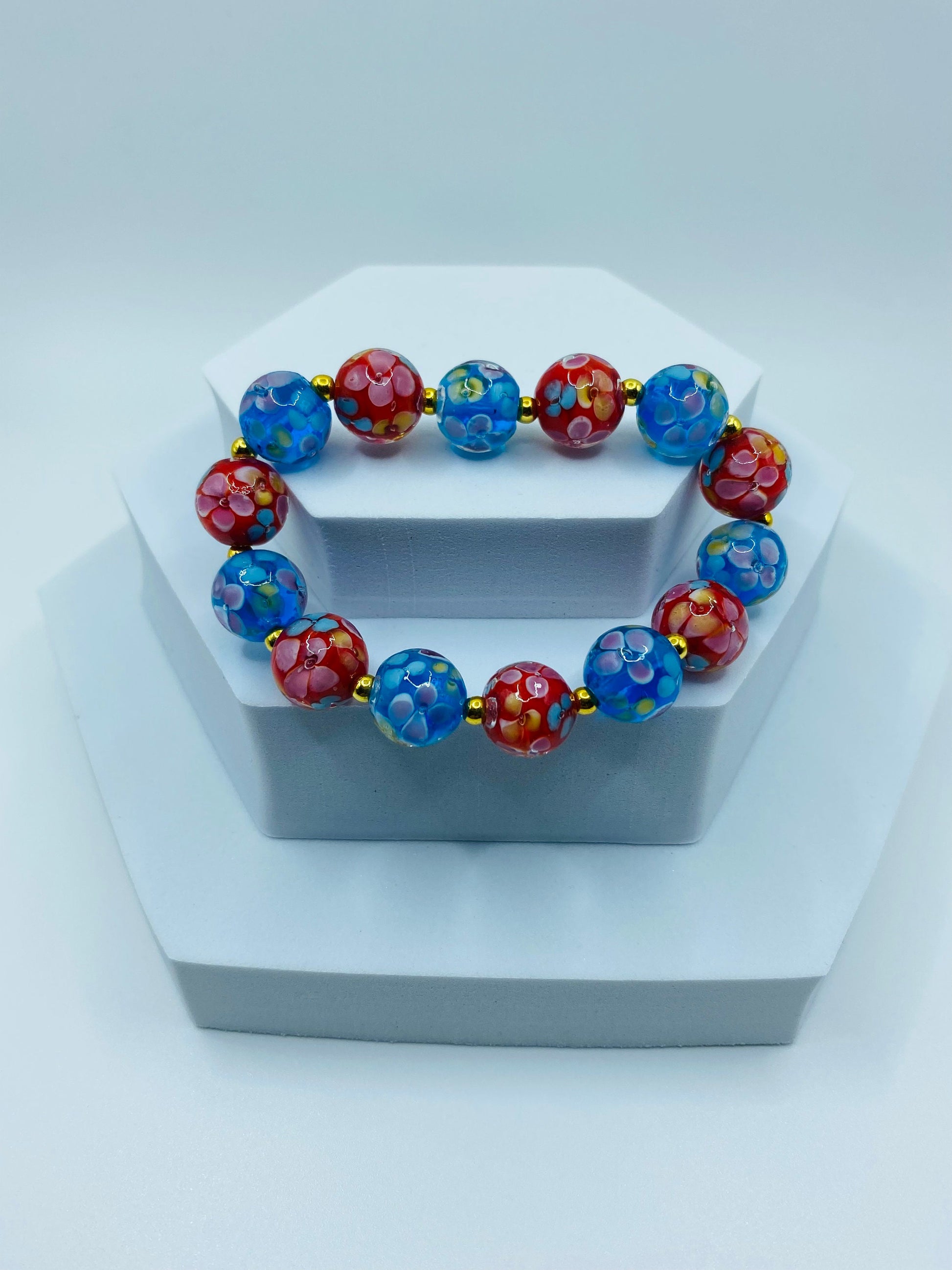 PRODUCT DETAILS - Red and Blue lampwork floral glass bracelet - 12mm red floral lampwork Murano glass beads - 12mm blue floral lampwork Murano glass beads - 3mm gold plated round spacer beads - Strong, stretchy cord - Handmade in a clean and safe environment