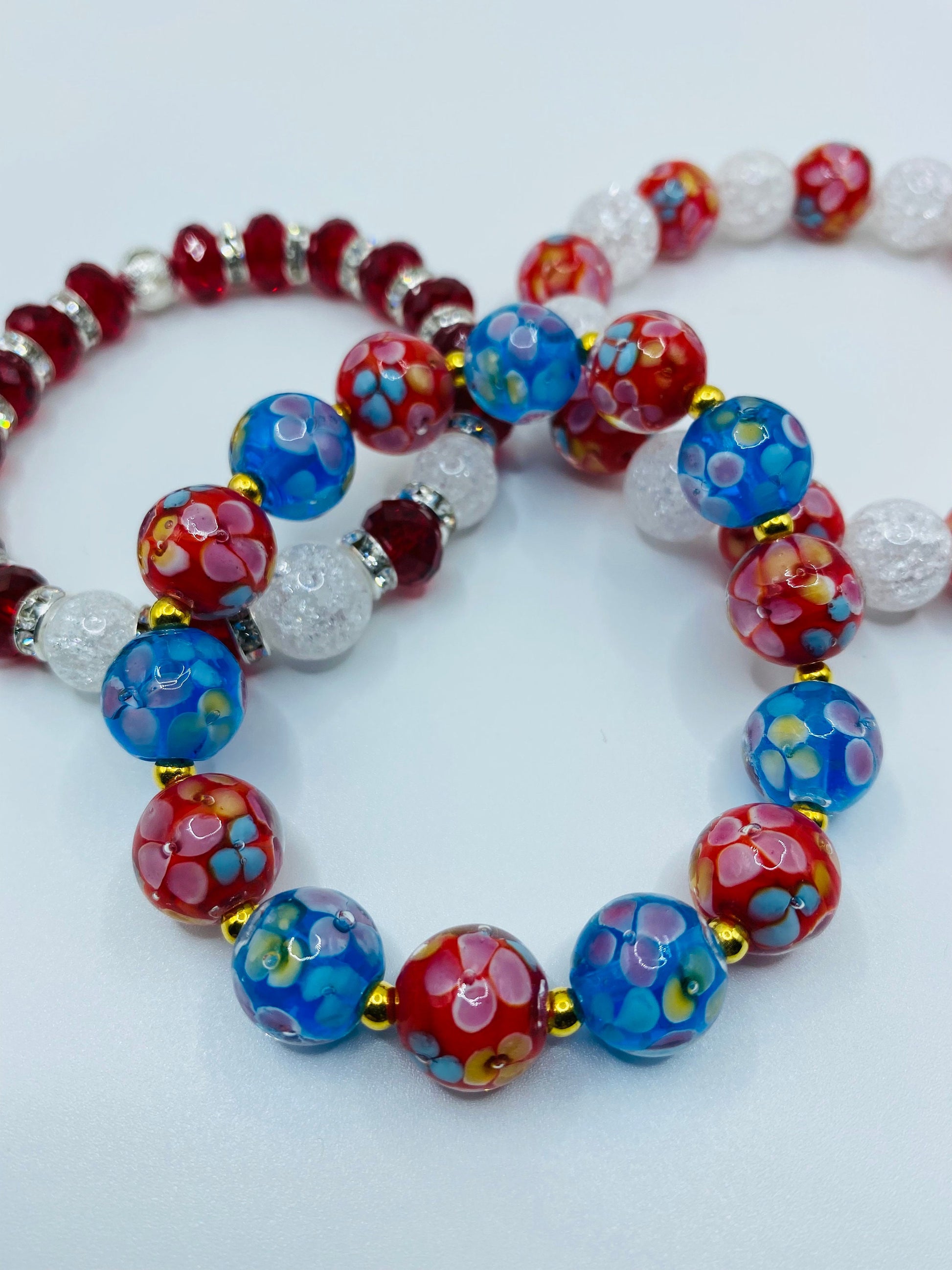 Floral Lampwork Glass Bead Bracelet: Red & Blue Murano Style