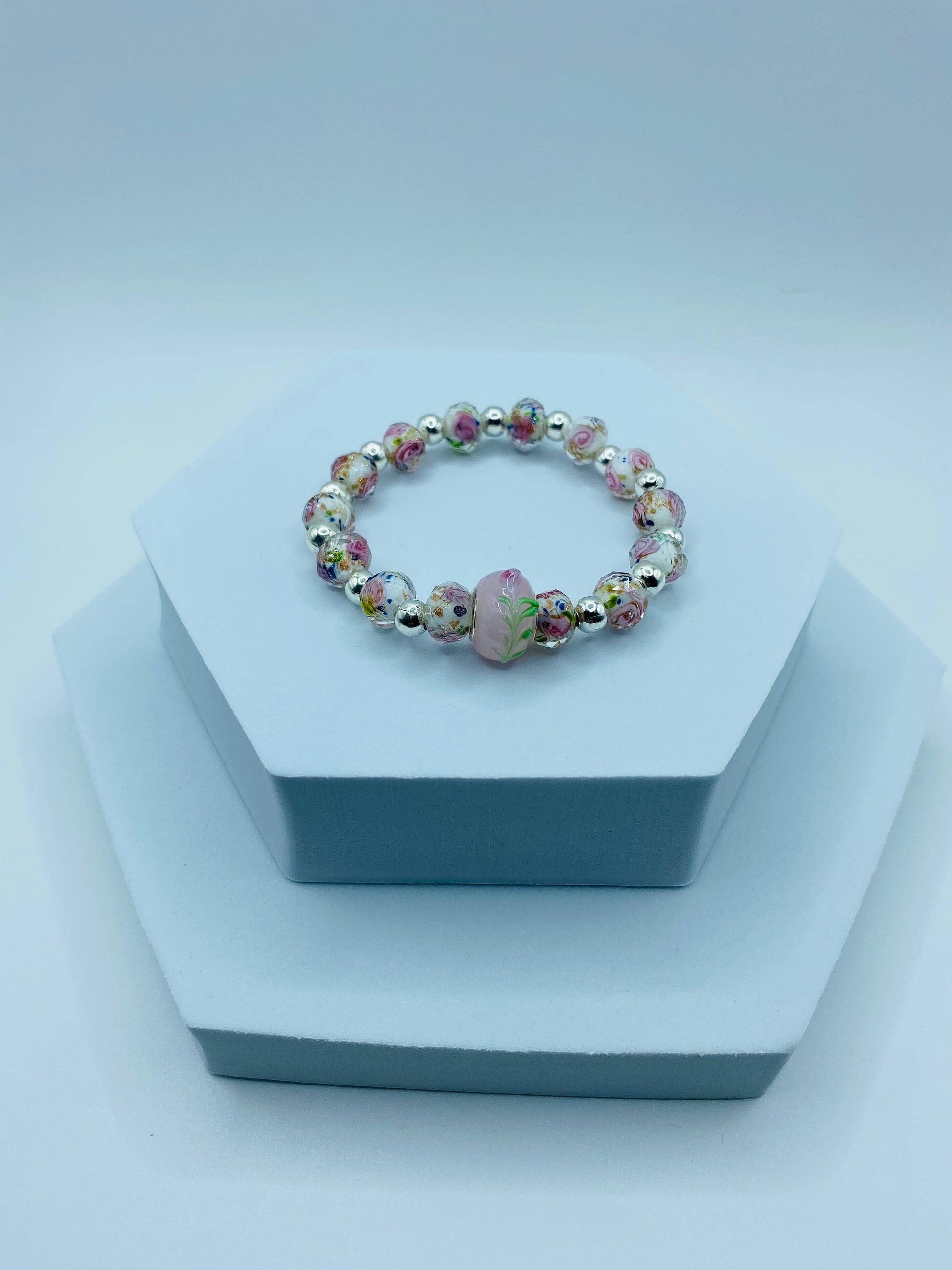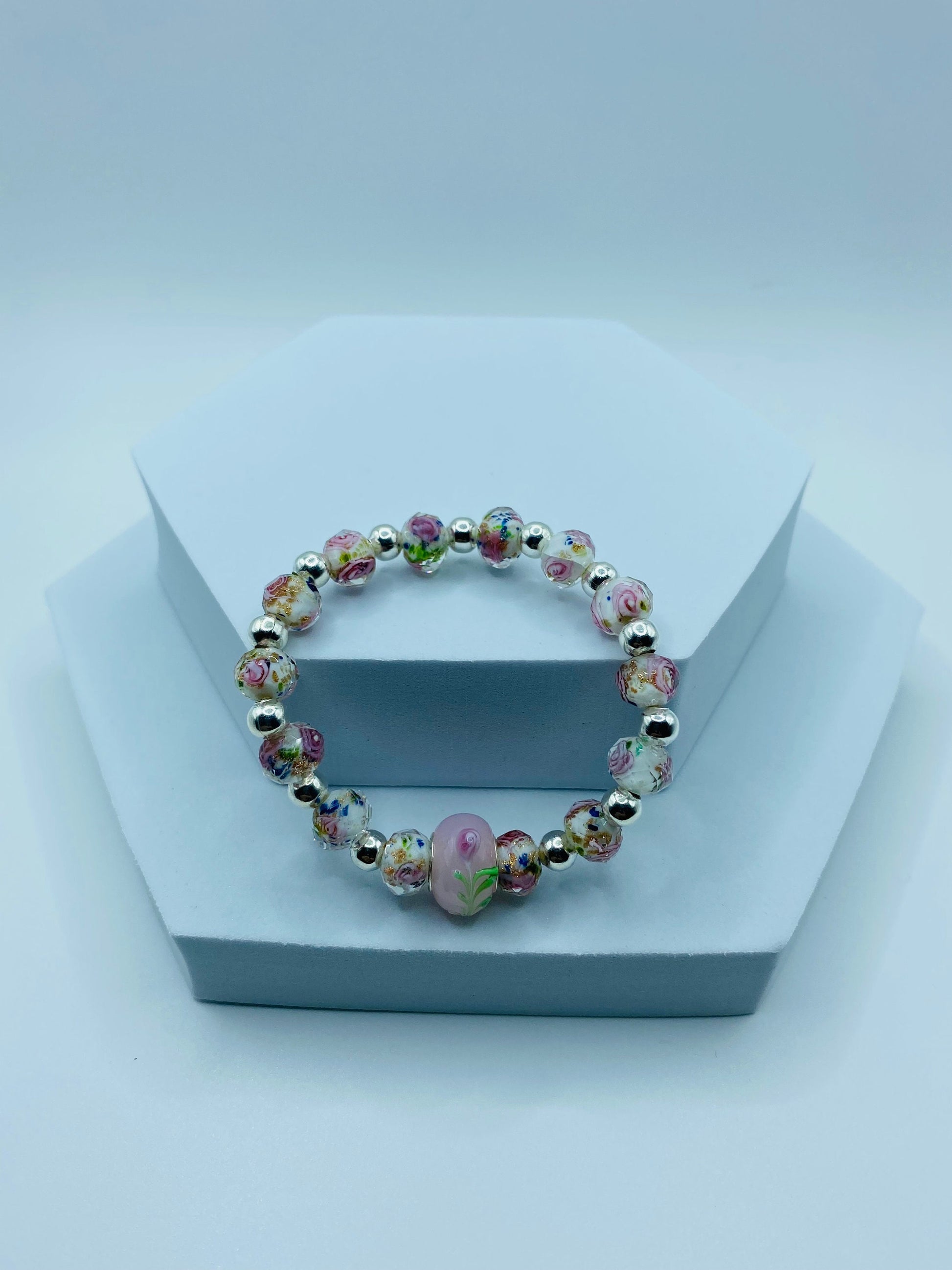 PRODUCT DETAILS - Pink lampwork glass floral bracelet - 10mm Murano lampwork gold sand floral glass beads - 14mm European large, silver-plated glass bumpy bead - 4mm silver plated hematite gemstone beads - Strong, stretchy cord - Handmade in a clean and safe environment