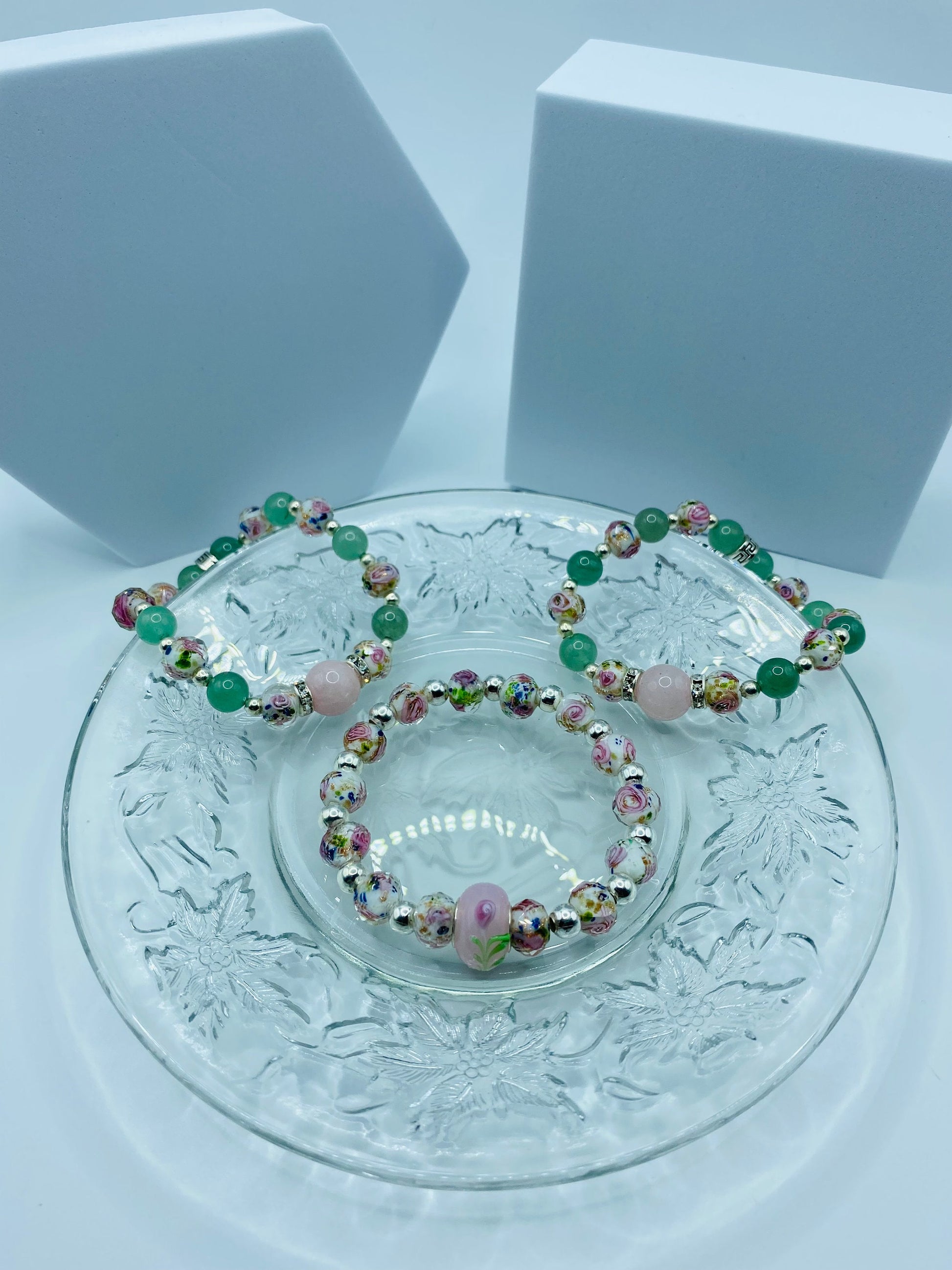 Floral Lampwork Glass Bead Bracelet: Silver Hematite Gemstone Accent