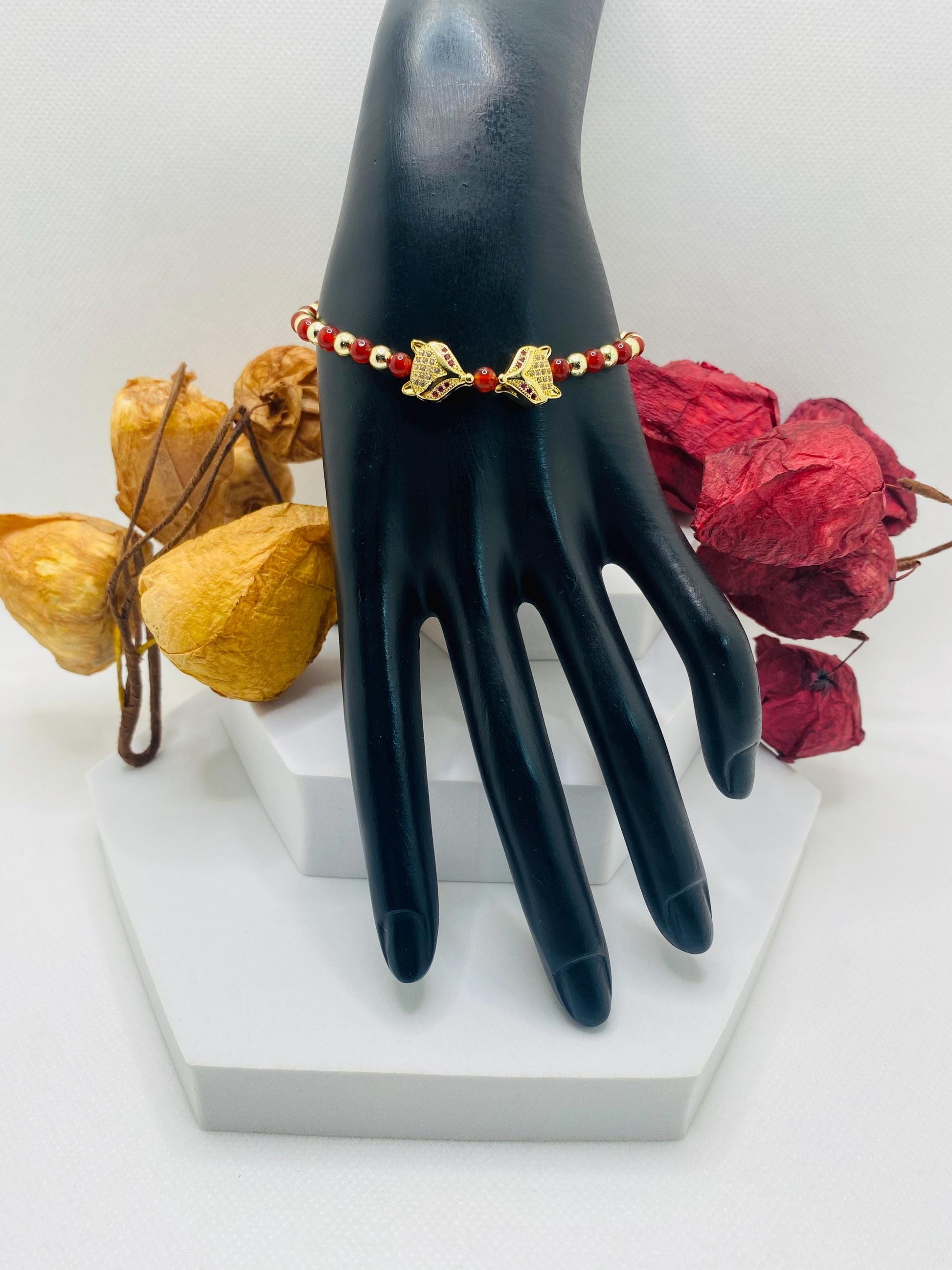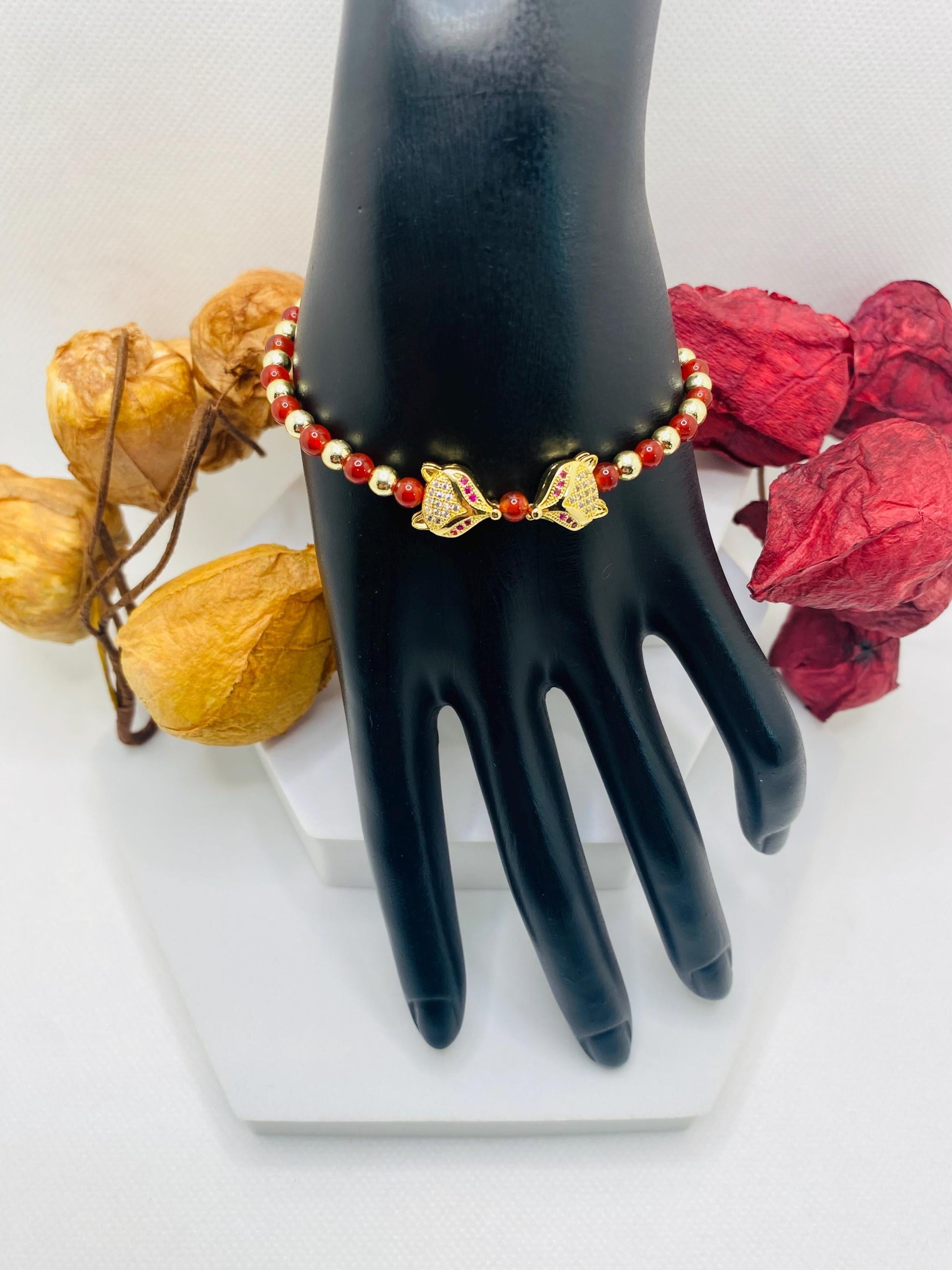 PRODUCT DETAILS - 4mm natural carnelian gemstone beads. - 4mm 18k gold plated hematite gemstone beads. - Gold electroplated fox charm beads with inlaid cubic zirconia and ruby red crystal eyes - Antique gold Tibetan Spacer - Strong, stretchy cord - Handmade in a clean and safe environment