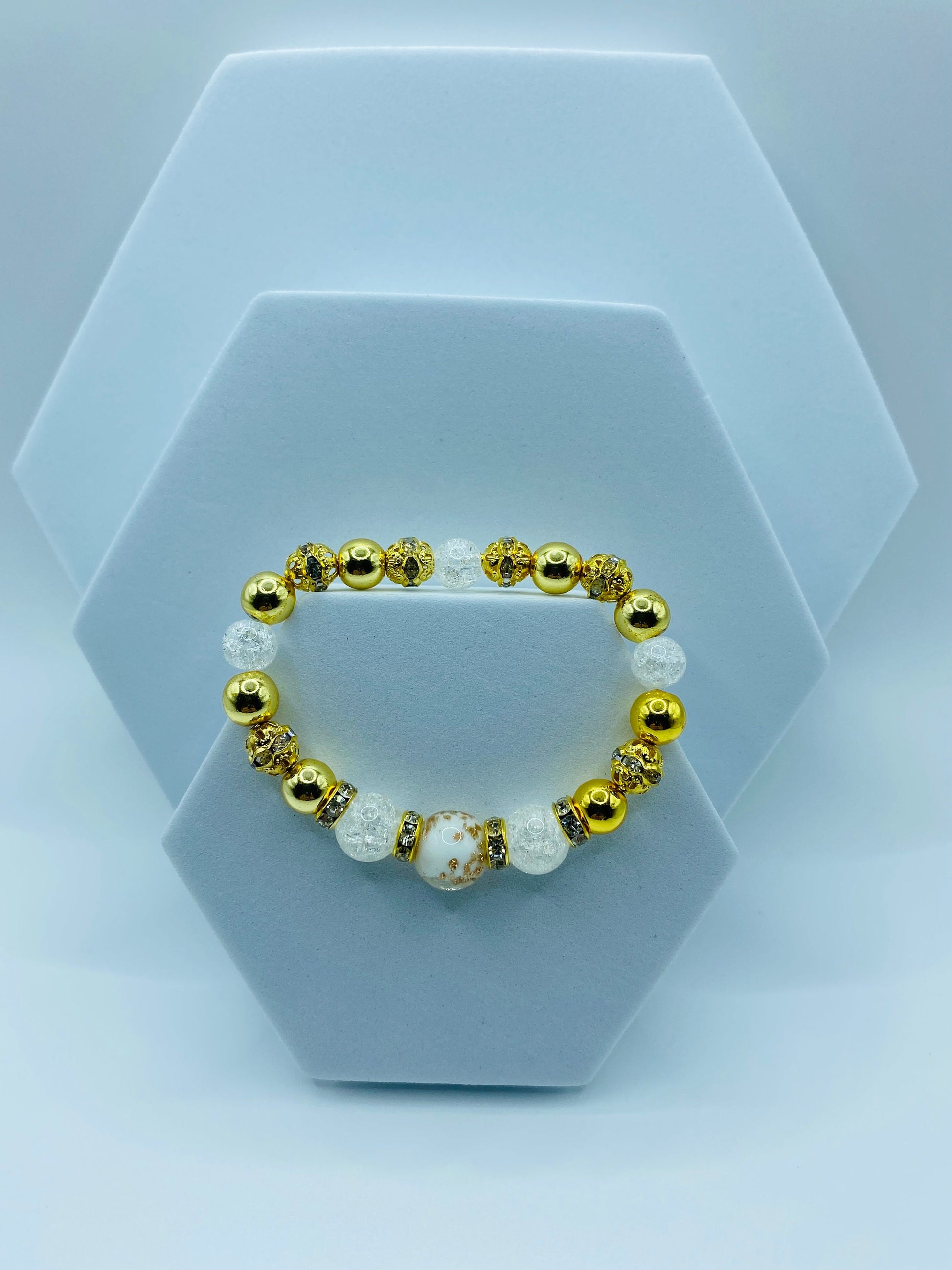 PRODUCT DETAILS - crystal quartz gold plated gemstone bracelet - 12mm white gold sand lampwork glass bead - 10mm crackle crystal quartz glass beads - 8mm crackle crystal quartz glass beads - 18k gold plated natural hematite gemstone beads - 8mm 18k gold filled hollow beads with sparkling rhinestones - Gold plated rondelles with sparkling rhinestones - Strong, stretchy cord - Handmade in a clean and safe environment