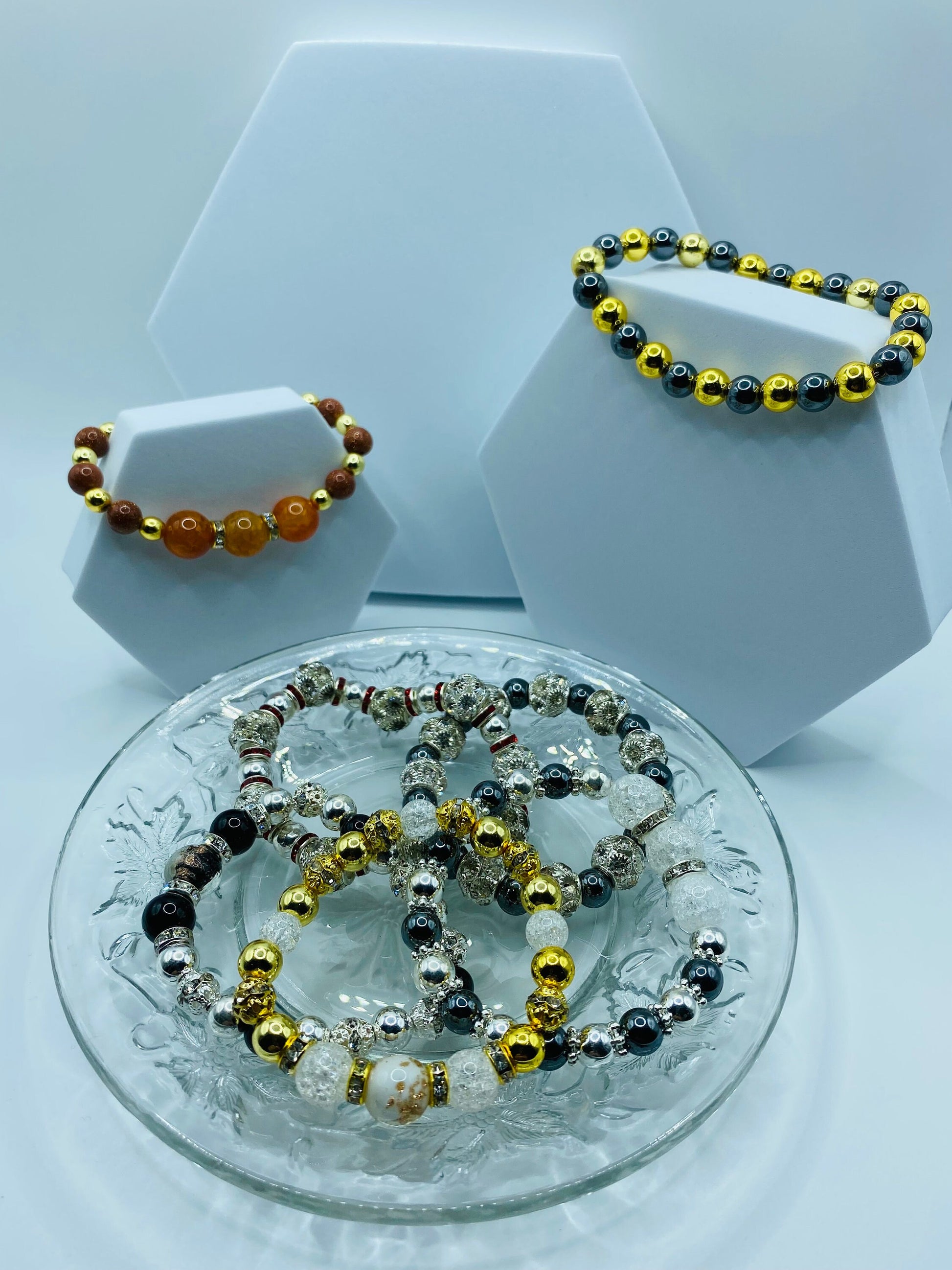 Add some sparkle to your wrist with this stunning 18k gold Hematite Bracelet. Adorned with beautiful Crackle Quartz Crystals, Lampwork Beads, and Rhinestone Spacer Beads, this piece is perfect for adding elegance and charm to any outfit. Handcrafted with attention to detail, this bracelet is a true statement piece that will surely catch the eyes and hearts of those around you. Radiate confidence and beauty with this captivating accessory.