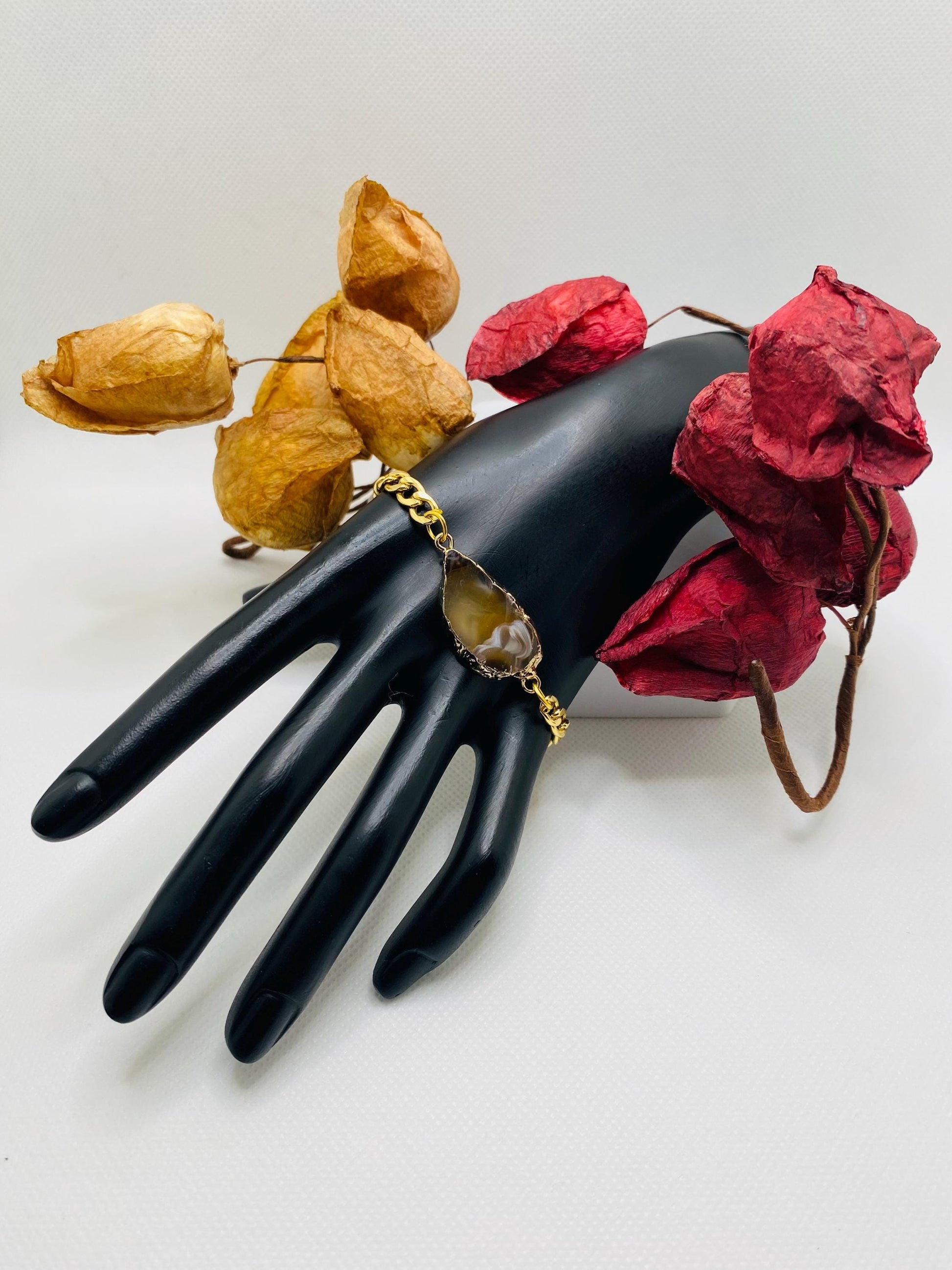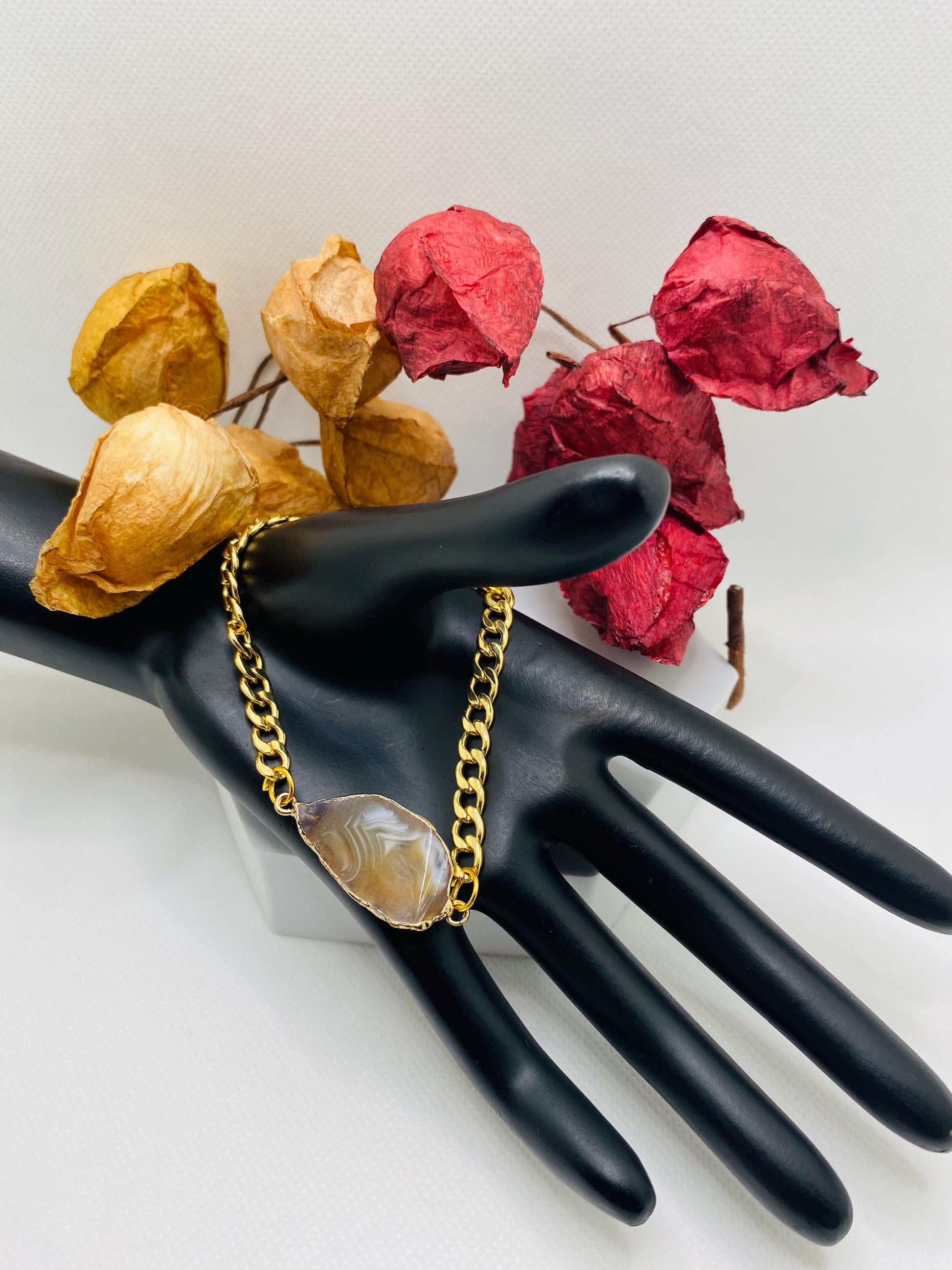 Elevate your wrist game with this unique 18k gold plated Cuban link chain bracelet featuring an irregular geode agate stone slice and Magnetic clasp. The juxtaposition of the luxurious gold plating and natural stone creates a strikingly beautiful piece that exudes elegance and individuality. Perfect for adding a touch of sophistication to any outfit. Handcrafted with care for a one-of-a-kind accessory that will surely make a statement. Perfect for everyday wear or special occasions. Truly a statement piece you'll love to show off! Own a truly unique accessory that is sure to turn heads wherever you go.