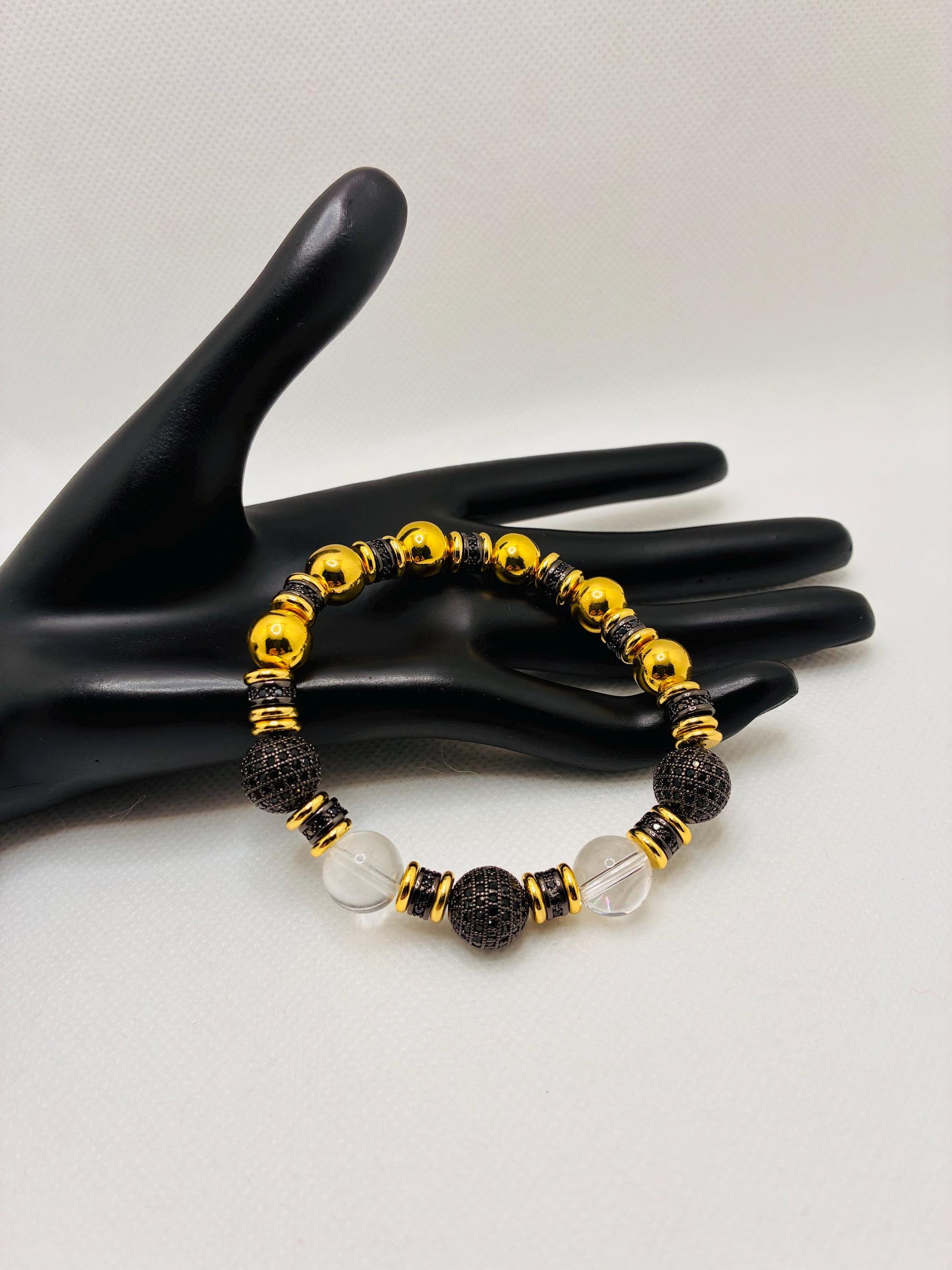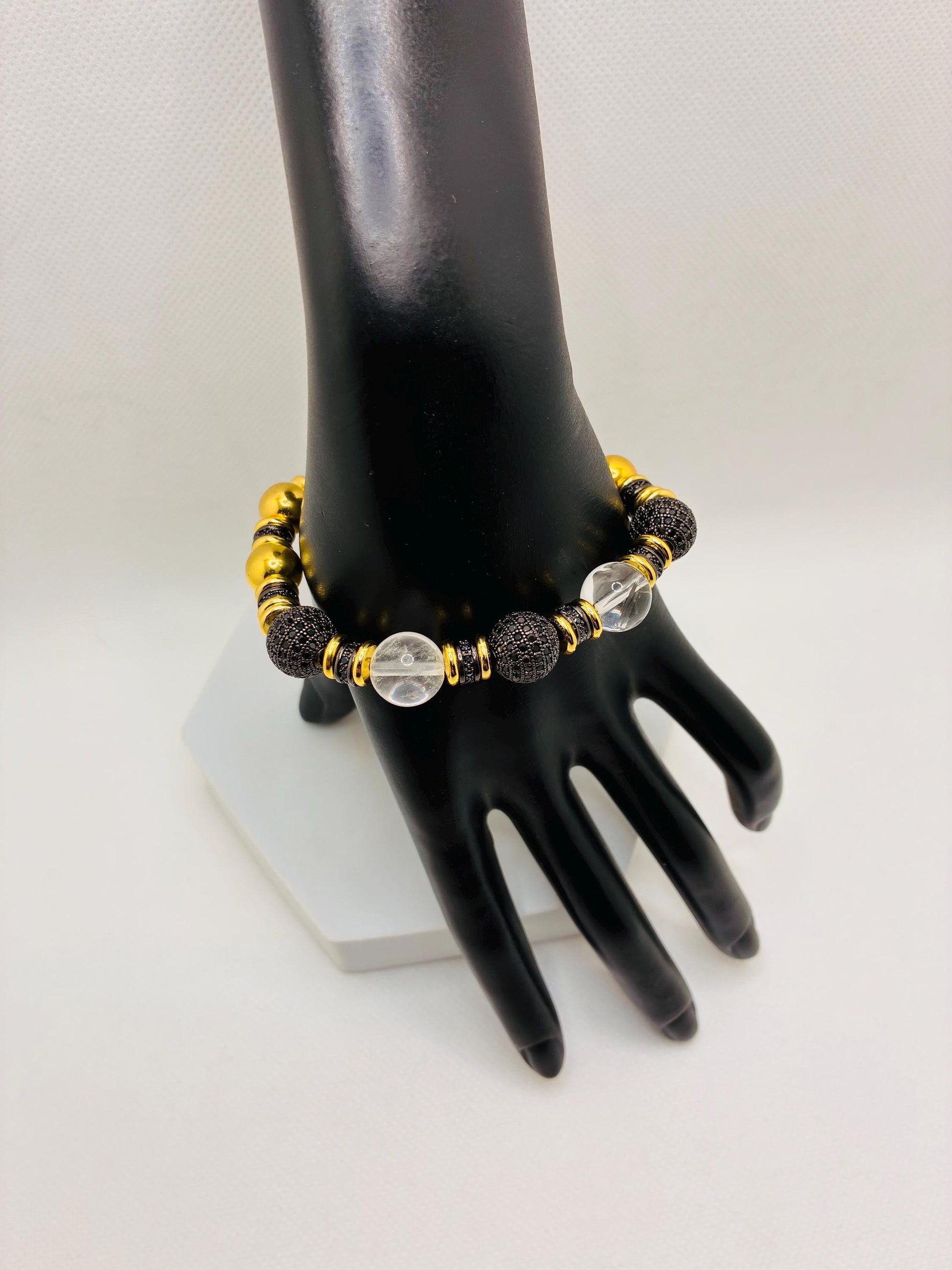 Product Info: 12mm black/black brass rhinestone & zirconia beads. 12mm clear quartz gemstone beads. 10mm Gold Plated Hematite gemstone beads. Gold Plated rondelle spacers with sparkling rhinestones. Black gun metal spacers with sparkling rhinestones. 0.8mm super strong stretchy cord 100 % handmade in a clean and safe environment.