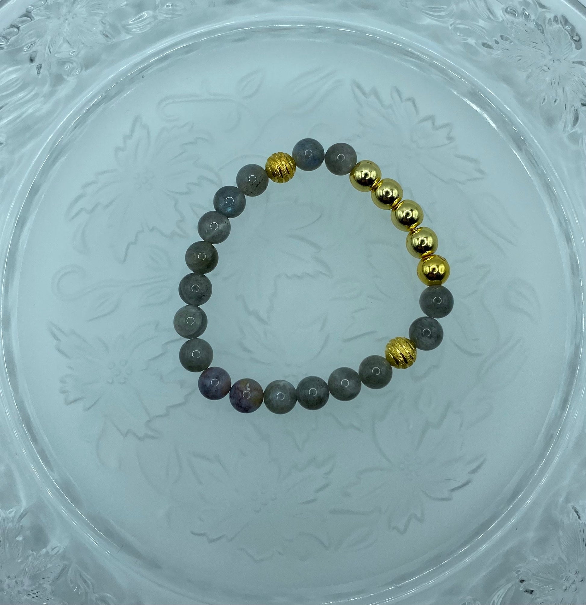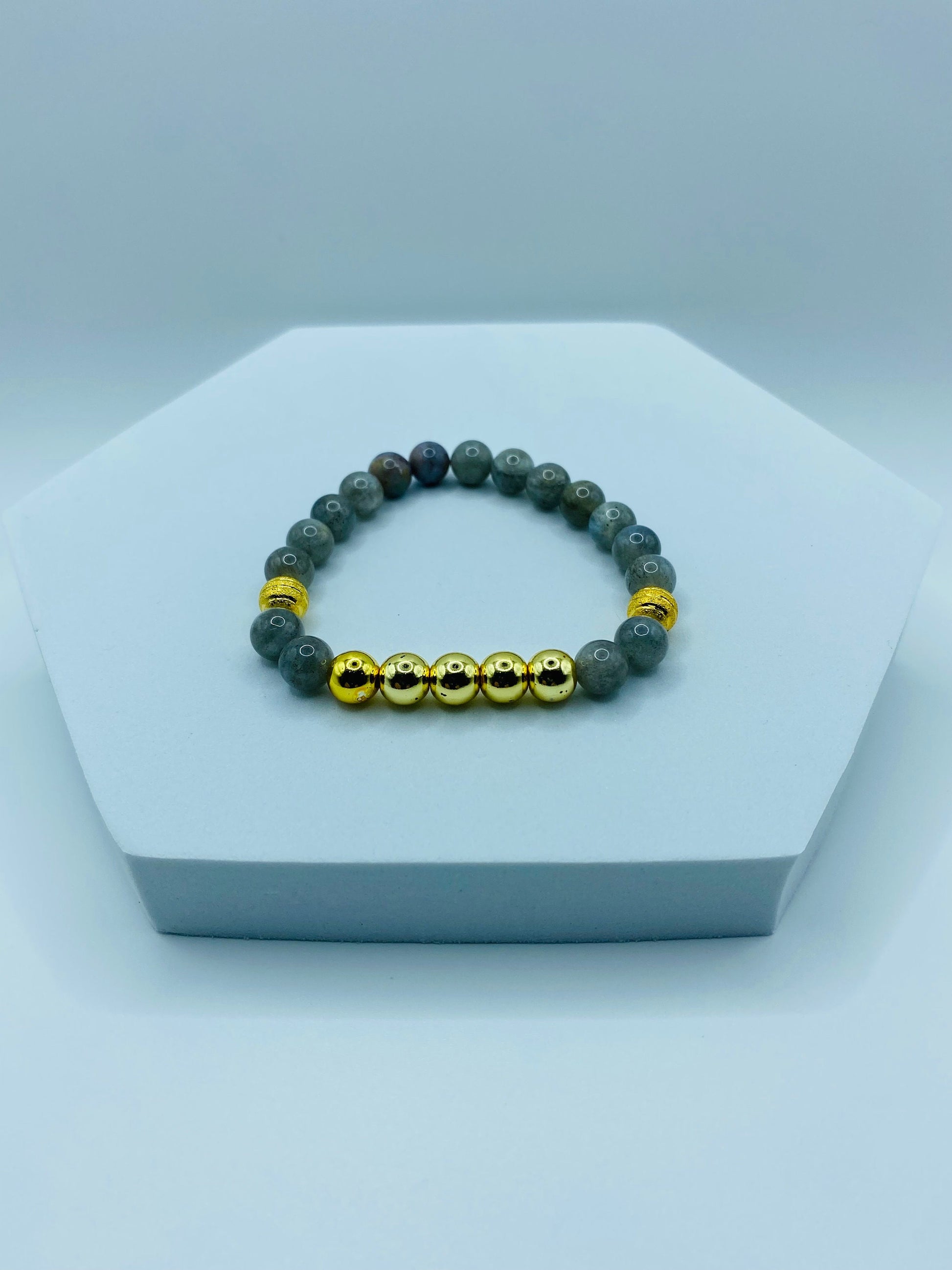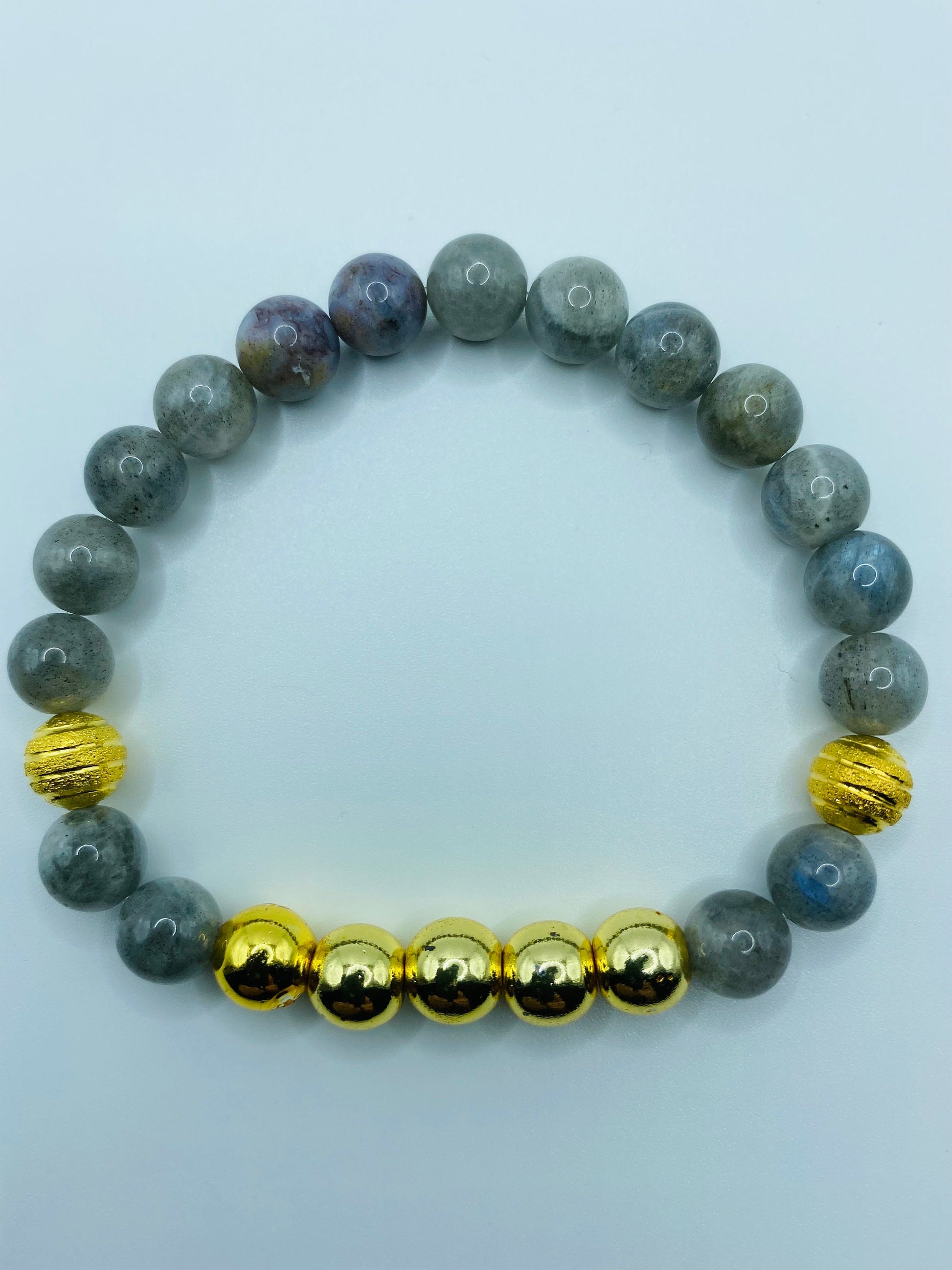 PRODUCT DETAILS - Labradorite, 18k gold plated hematite gemstone bracelet - 8mm AAA natural labradorite gemstone beads - 8mm 18k gold plated hematite gemstone beads - 8mm 18k gold plated hollow beads - Strong, stretchy cord - Handmade in a clean and safe environment