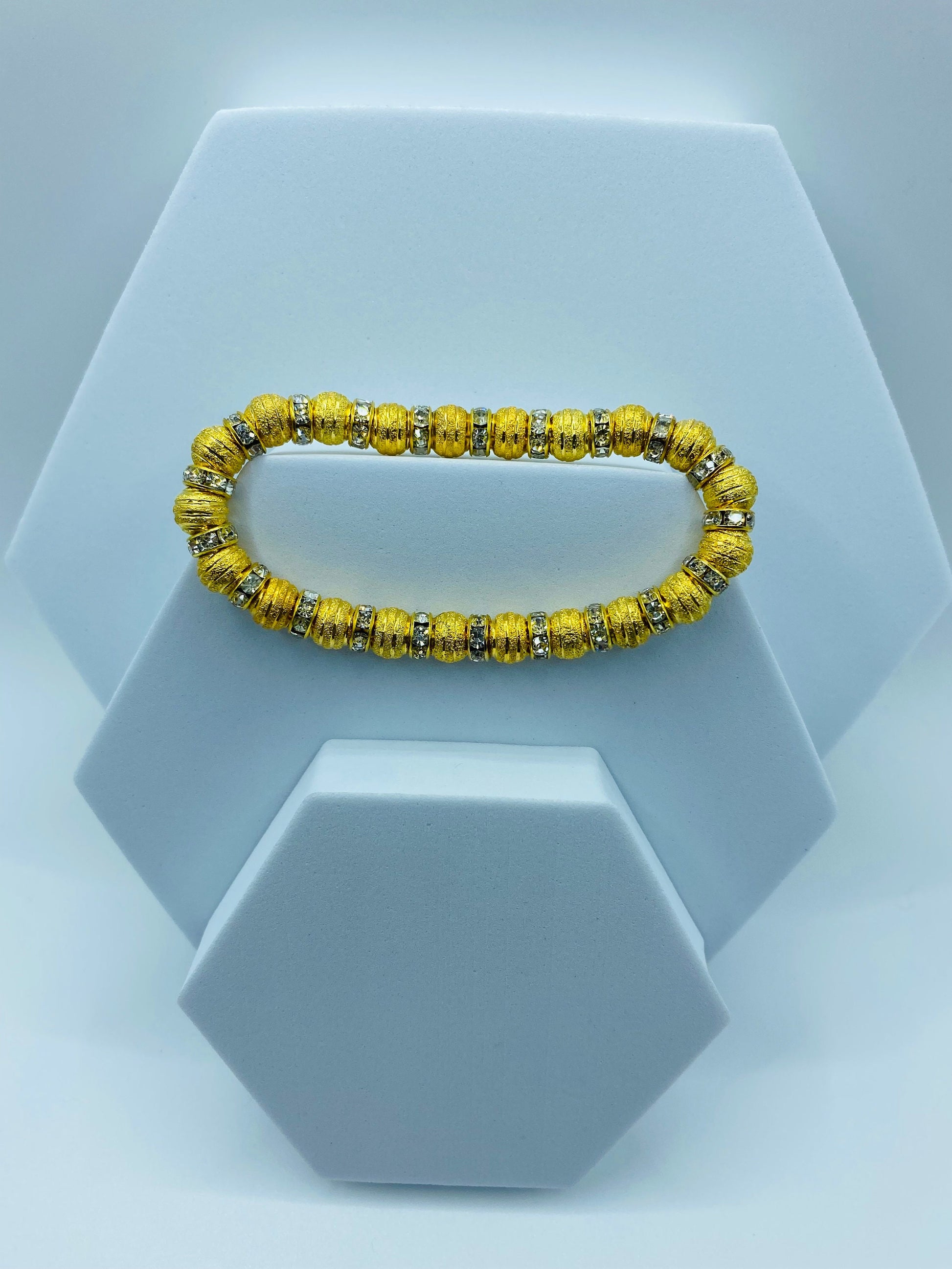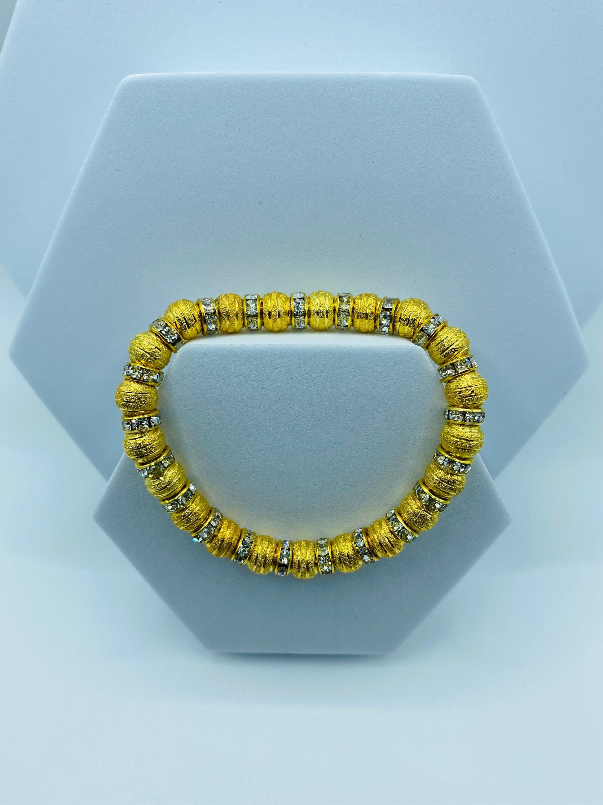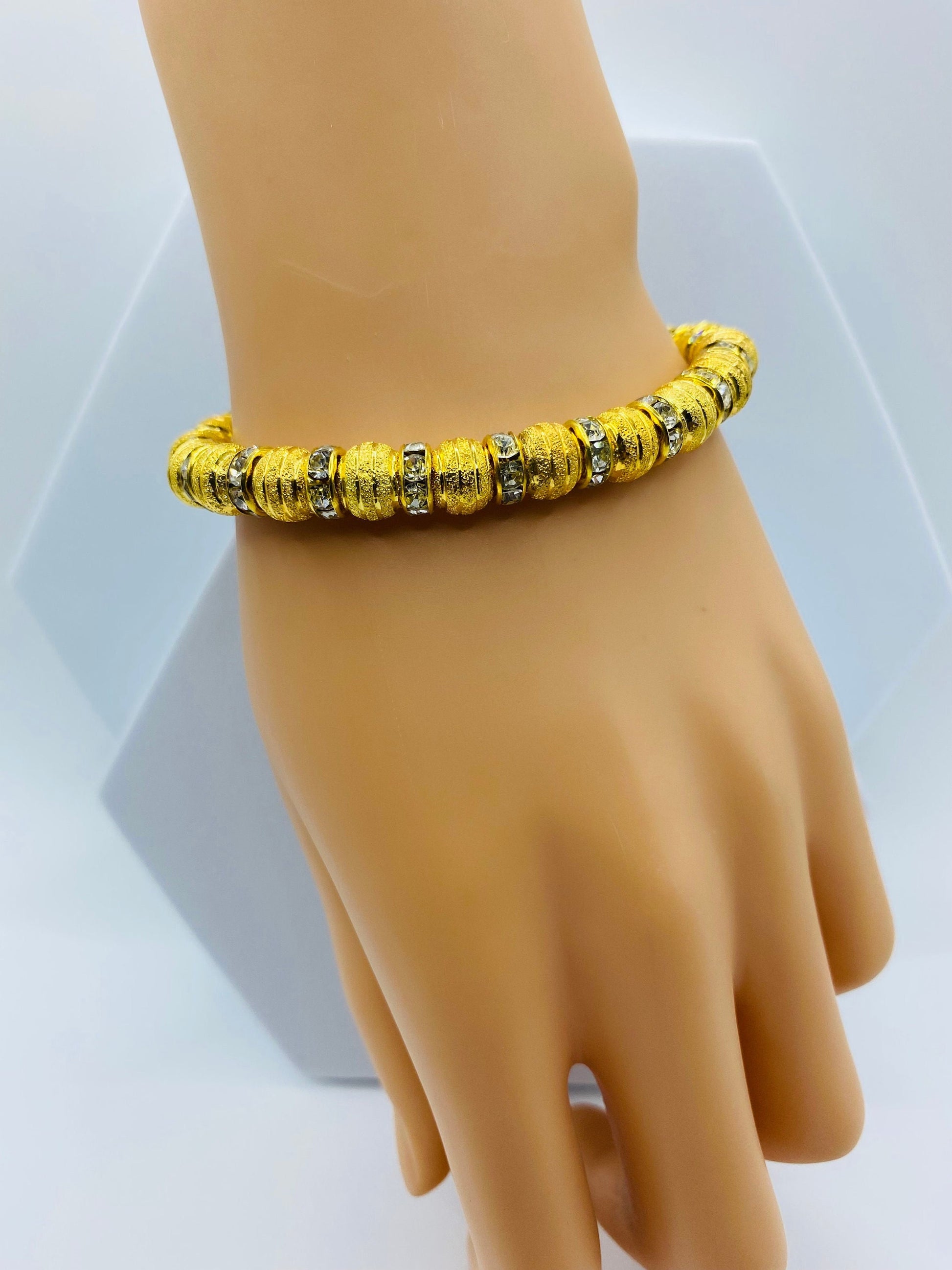 PRODUCT DETAILS - men and women 18k gold plated bracelet - 8mm 18k gold filled hollow beads - 8mm 18k gold plated rondelles with sparkling rhinestones - Strong, stretchy cord - Handmade in a clean and safe environment