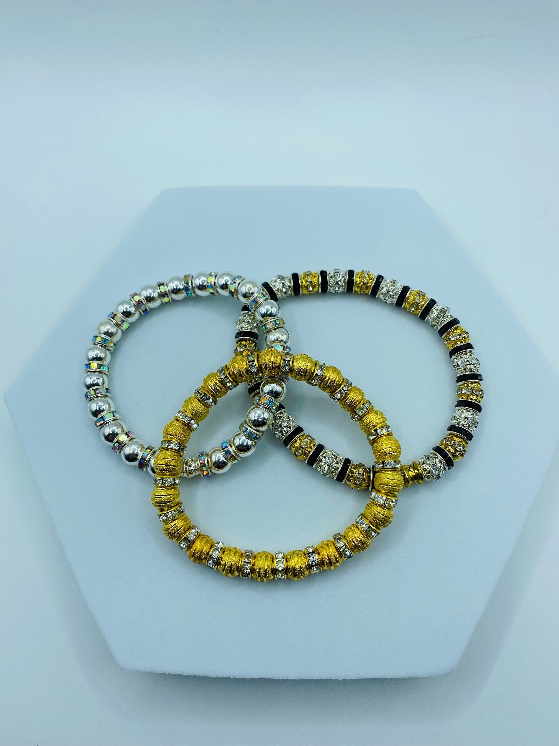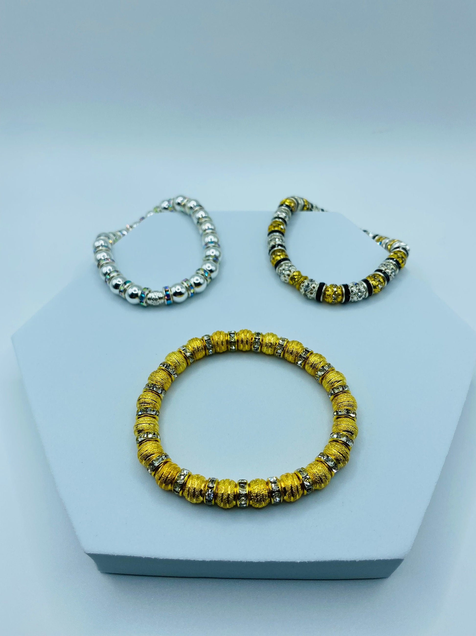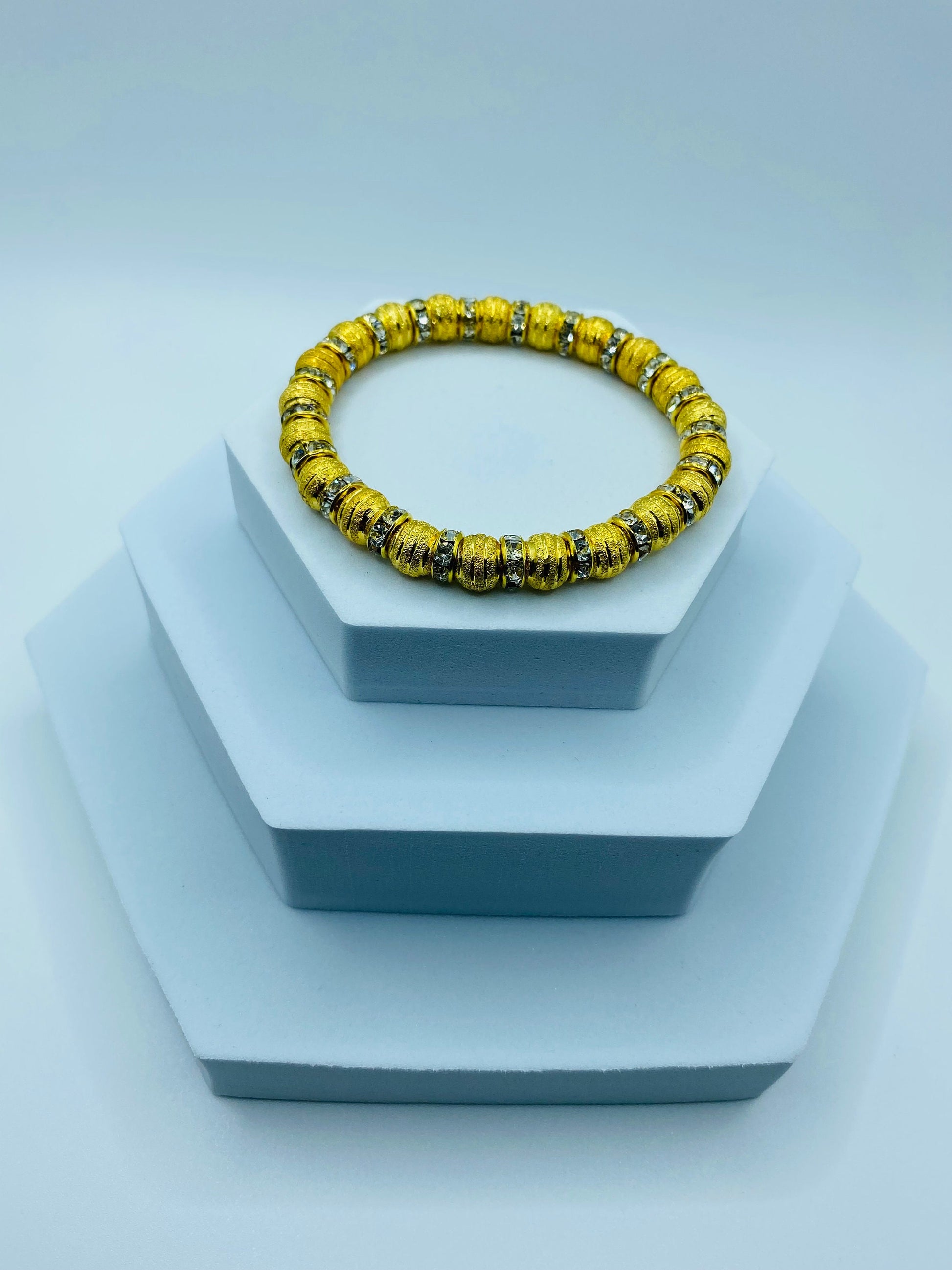 PRODUCT DETAILS - men and women 18k gold plated bracelet - 8mm 18k gold filled hollow beads - 8mm 18k gold plated rondelles with sparkling rhinestones - Strong, stretchy cord - Handmade in a clean and safe environment