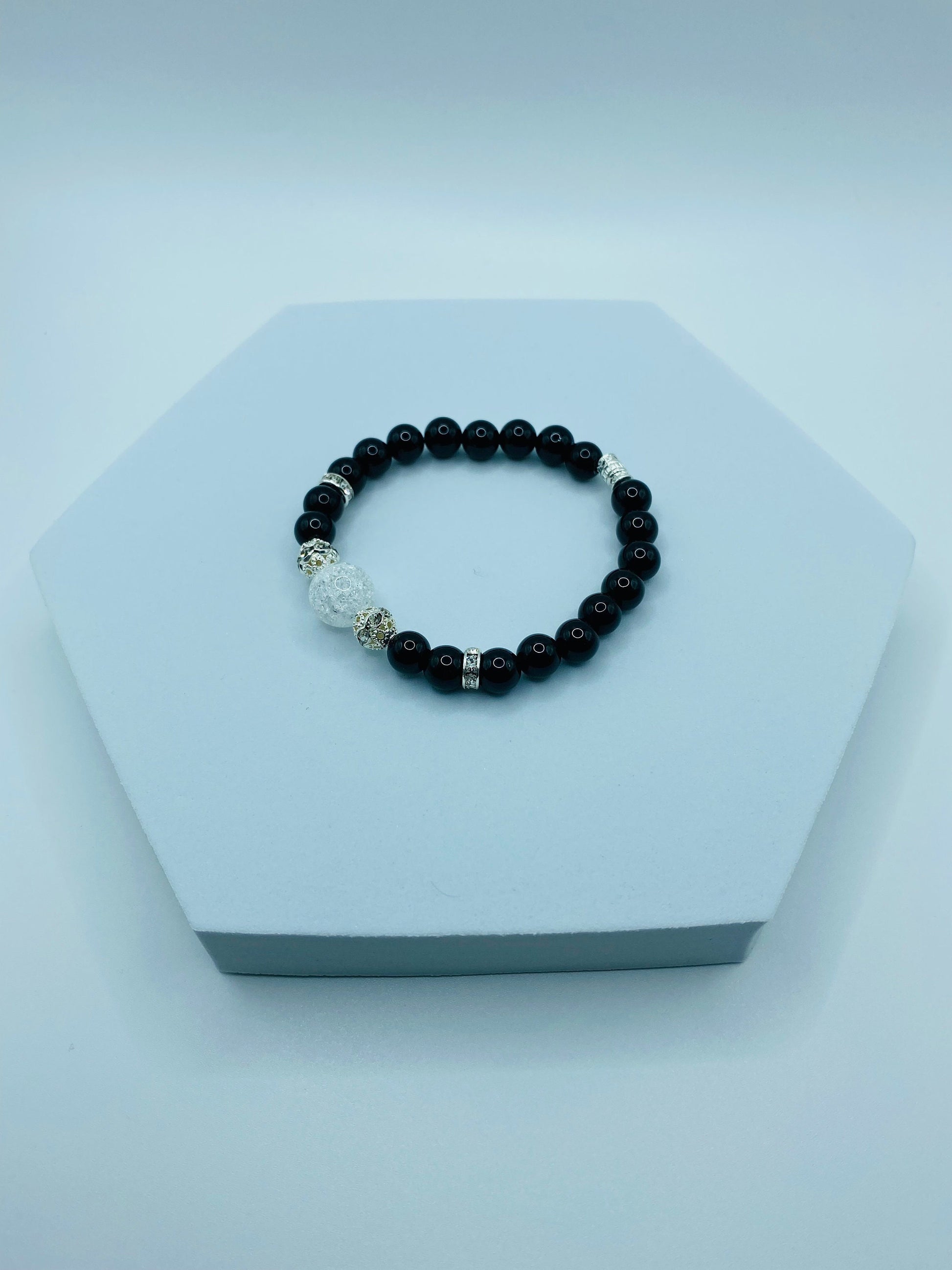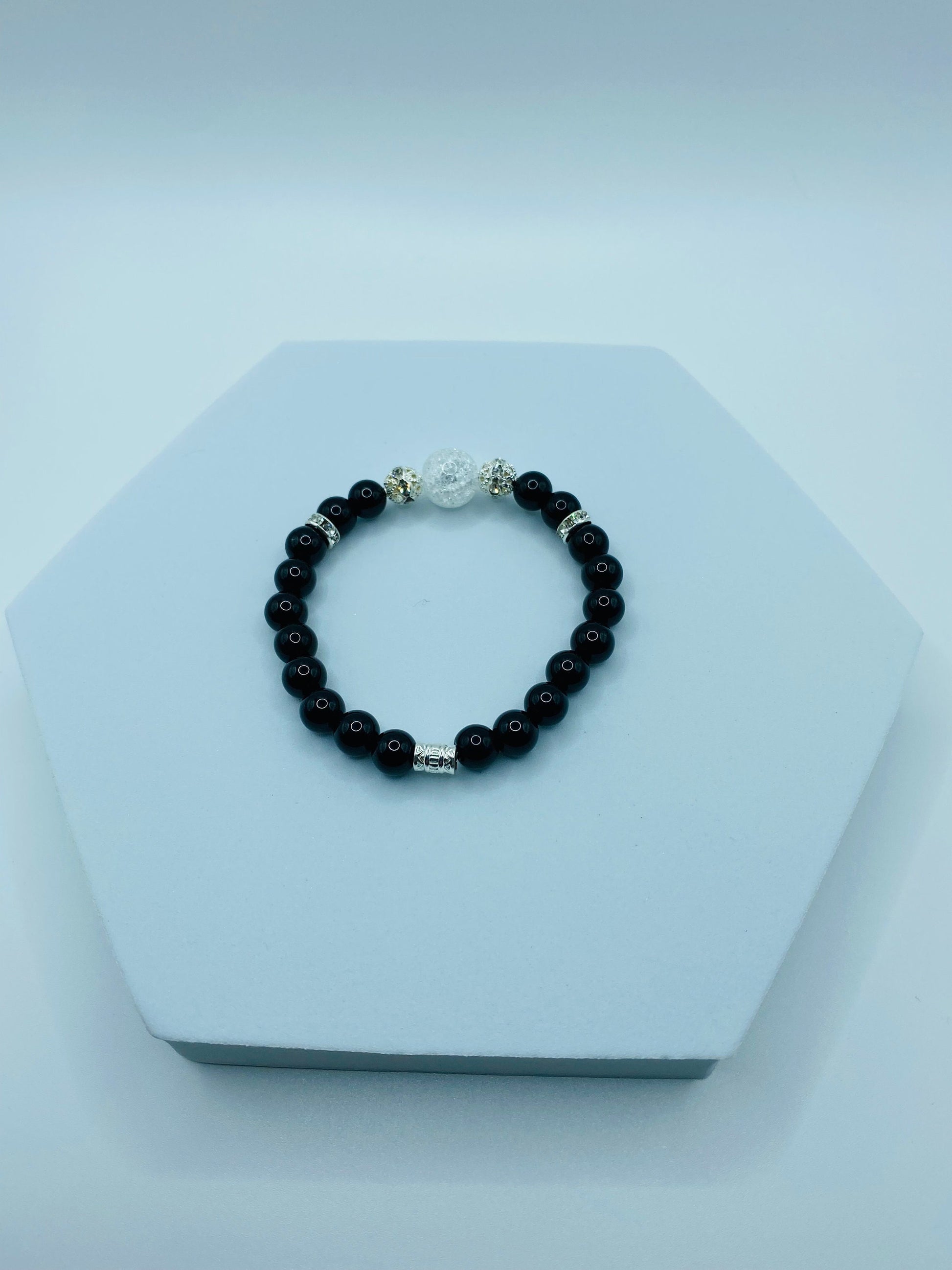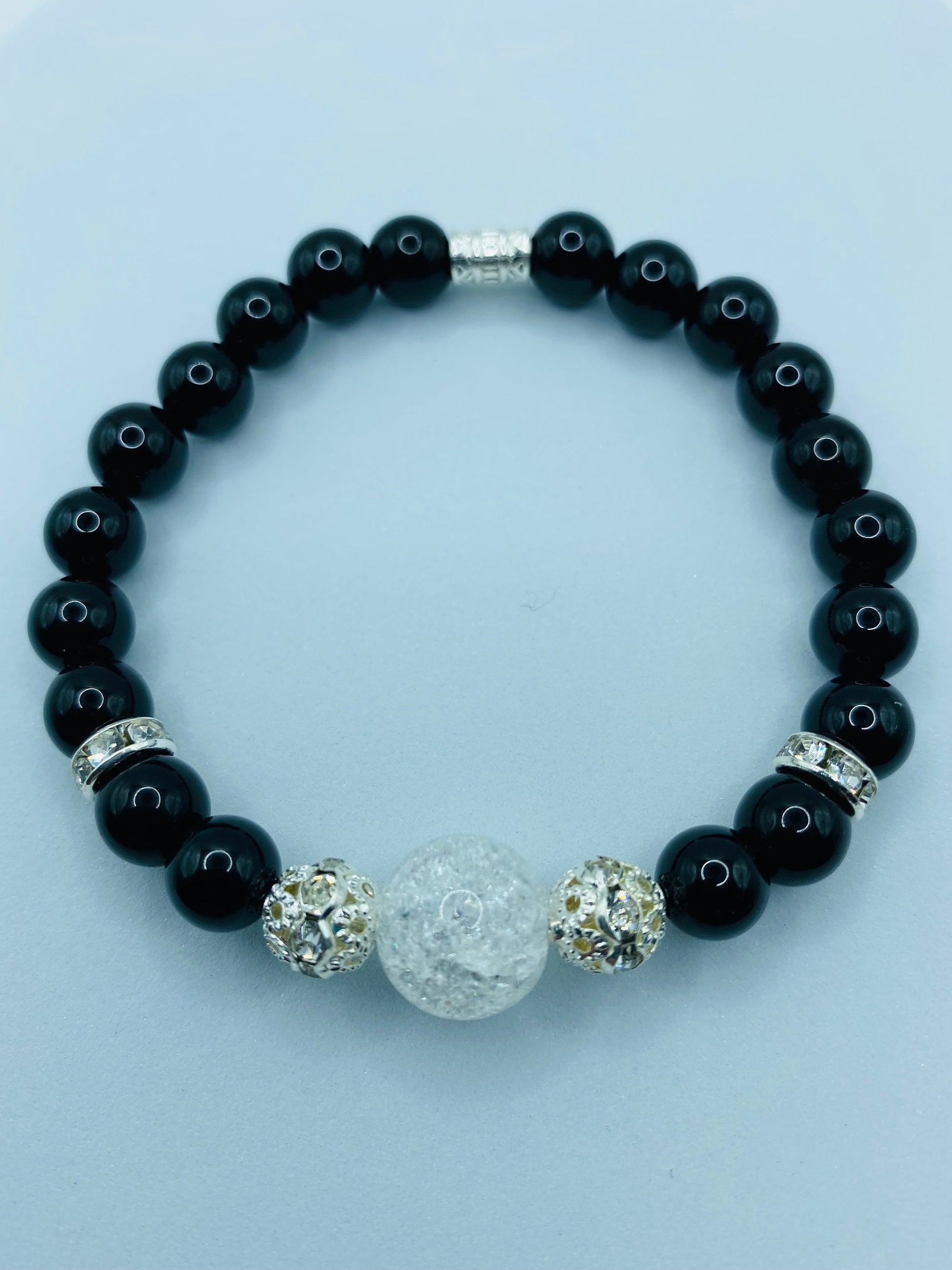 PRODUCT DETAILS - 8mm natural AAA black onyx gemstone beads - 12mm crackle crystal quartz gemstone bead - 8mm silver plated beads with inlaid cubic zirconia - 8mm silver plated rondelles with rhinestone crystals - Silver plated tube spacer - Strong, stretchy cord - Handmade in a clean and safe environment