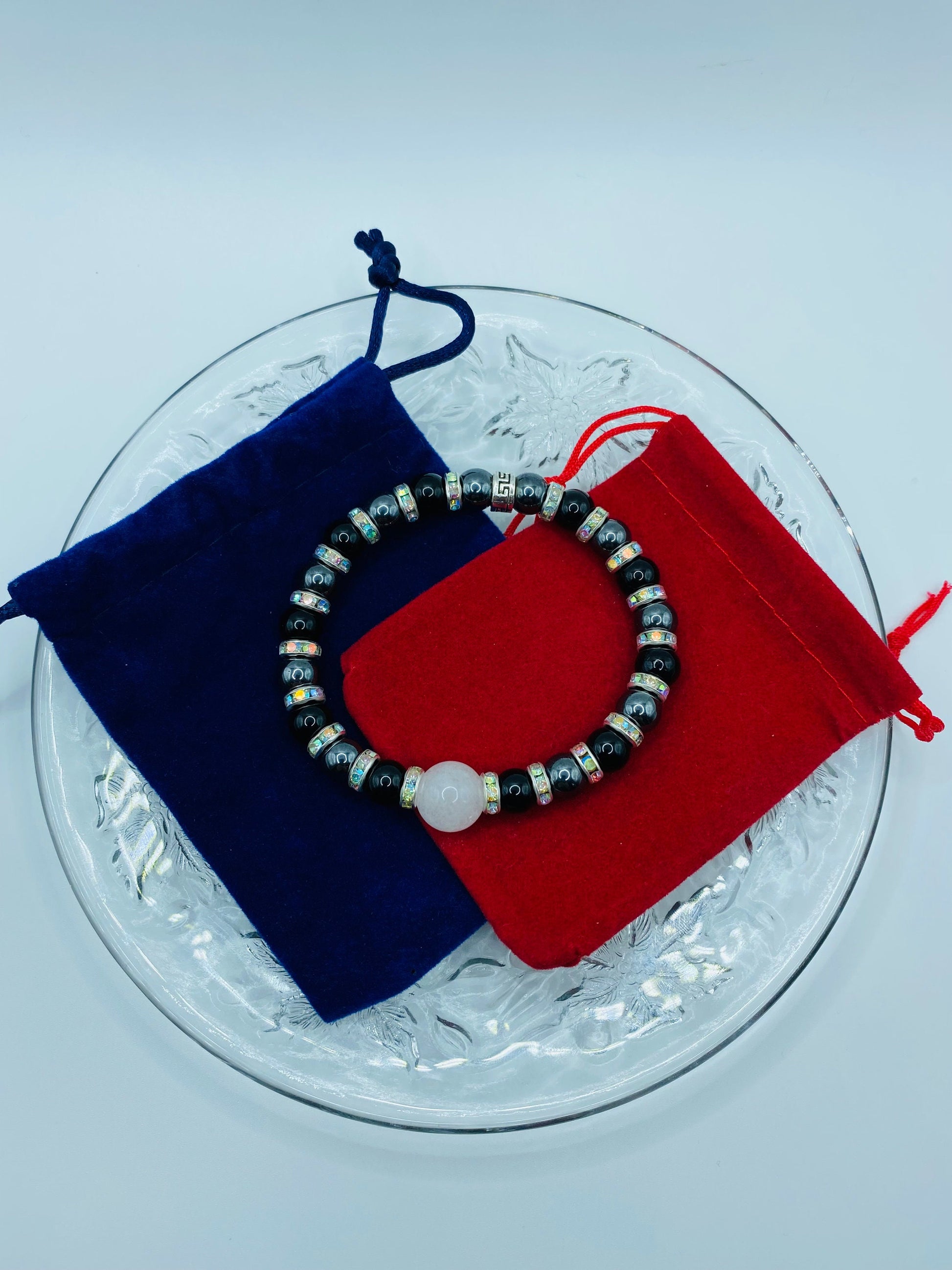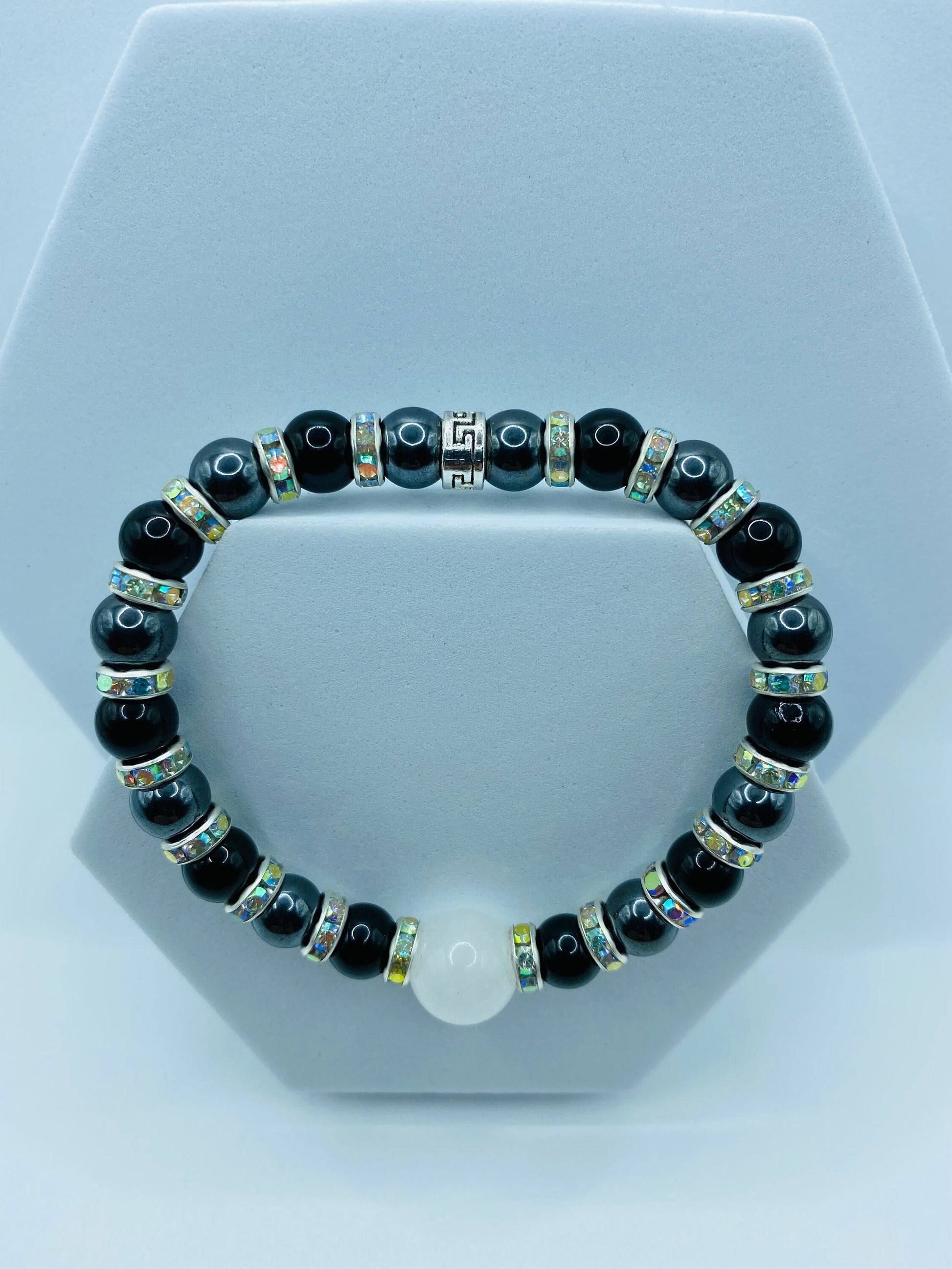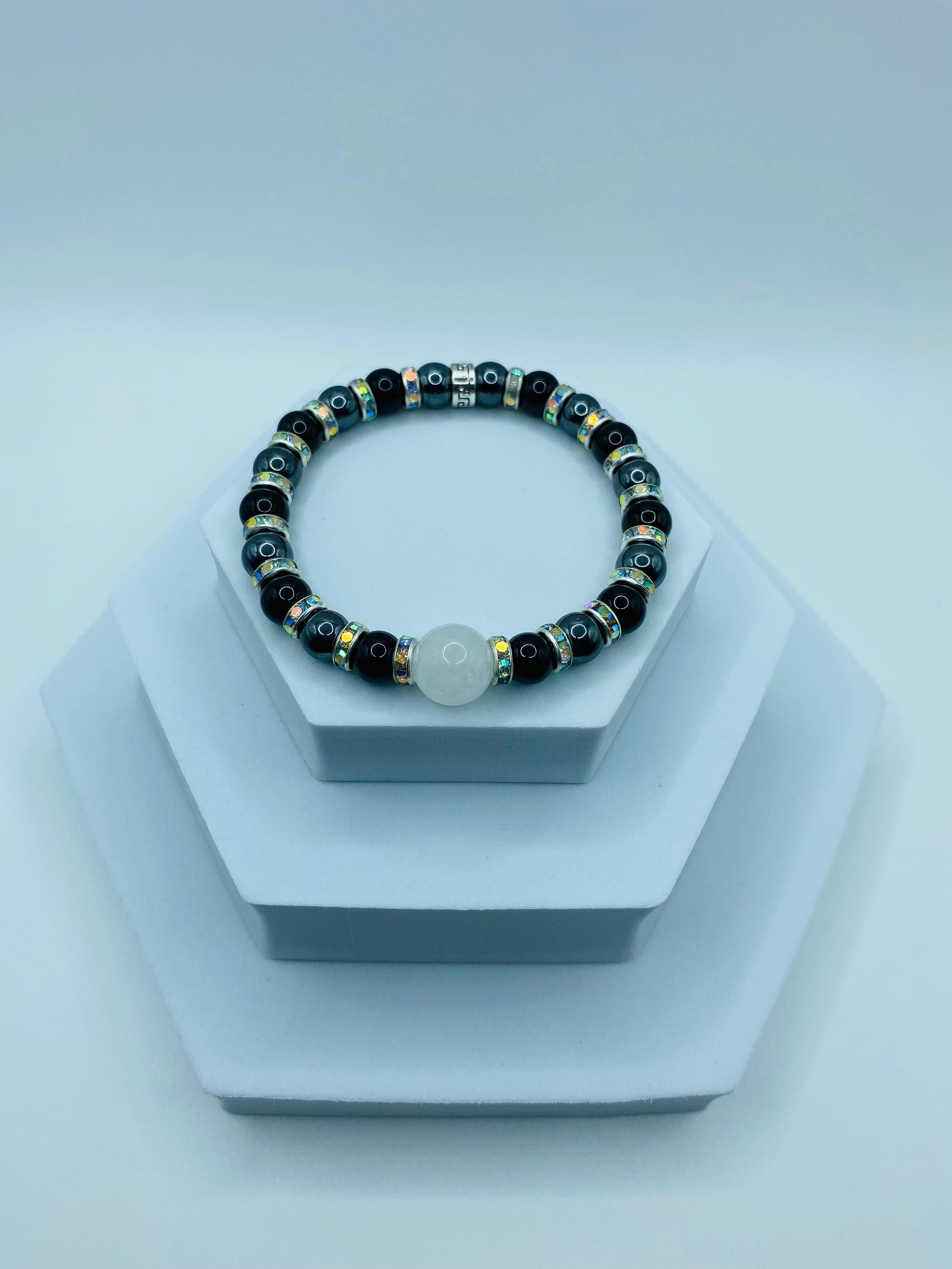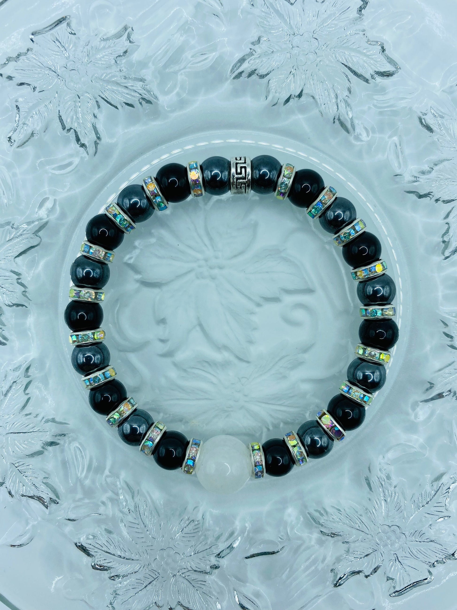 This exquisite bracelet features a stunning blend of natural onyx and hematite gemstones, complemented by a large white calcedony bead. The combination of these striking stones creates a captivating contrast, while the addition of sparkling rhinestones adds a touch of glamour. Perfect for adding a touch of sophistication to any outfit, this handcrafted piece is perfect for adding a touch of luxury to any outfit. Get ready to turn heads with this breathtaking accessory! Treat yourself or surprise a loved one with this one-of-a-kind jewelry piece each bead has been carefully selected and strung by hand.