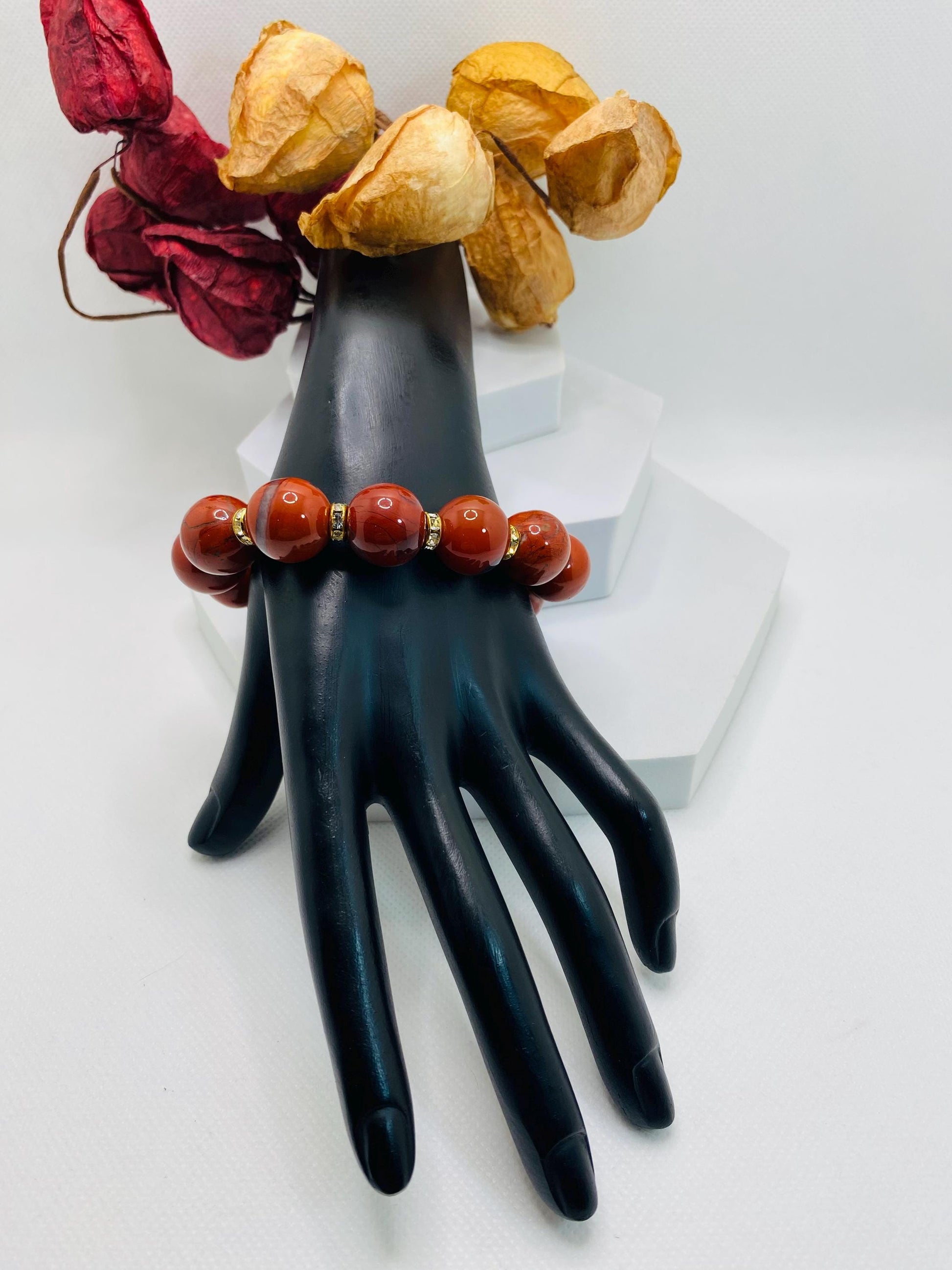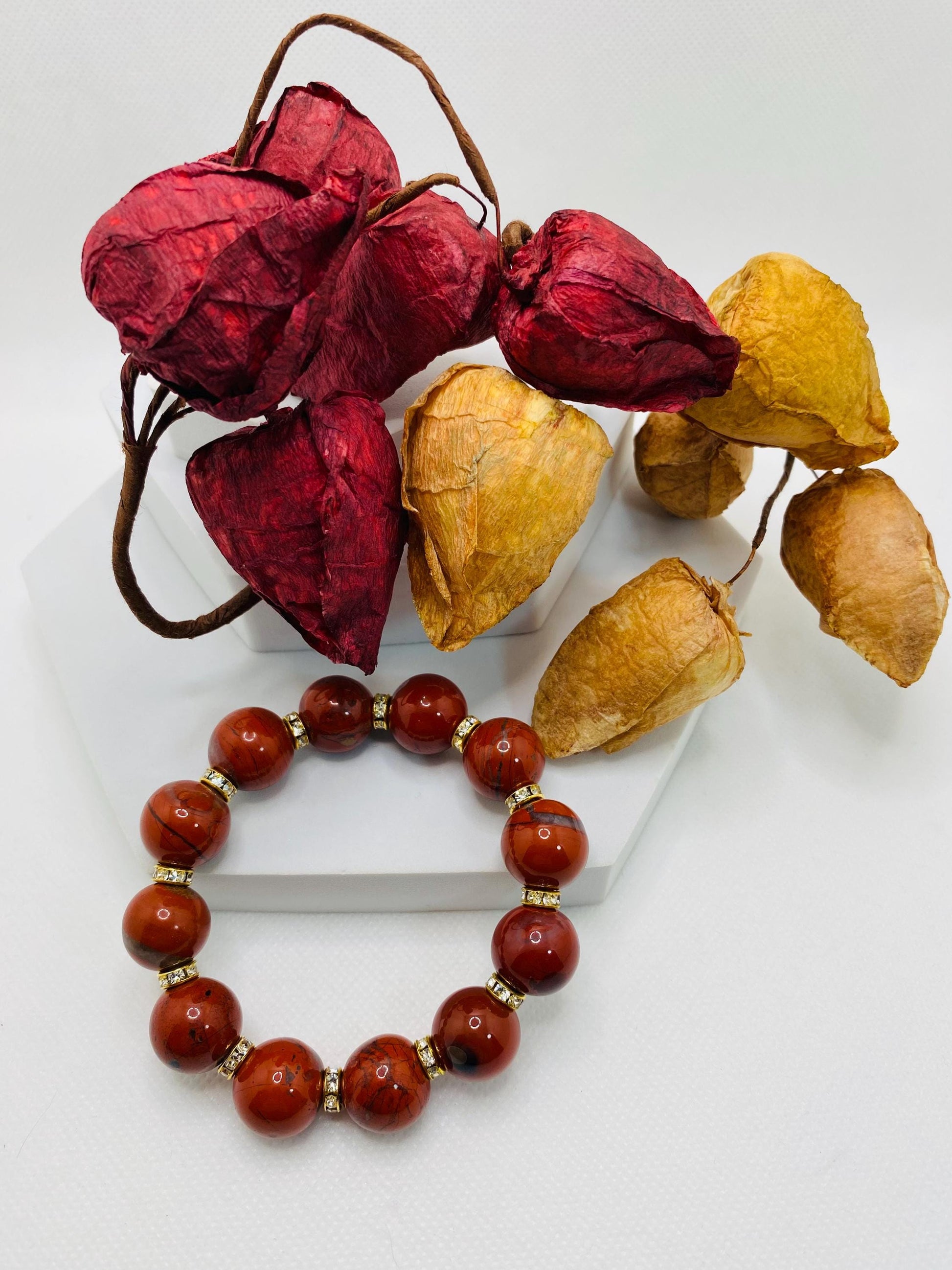 PRODUCT DETAILS: 16MM natural Red Jasper Gemstone Beads: 8mm sparkling rhinestone rondelle spacers: Strong Stretchy Elastic Cord: 100% Handmade in a Safe and Clean Environment