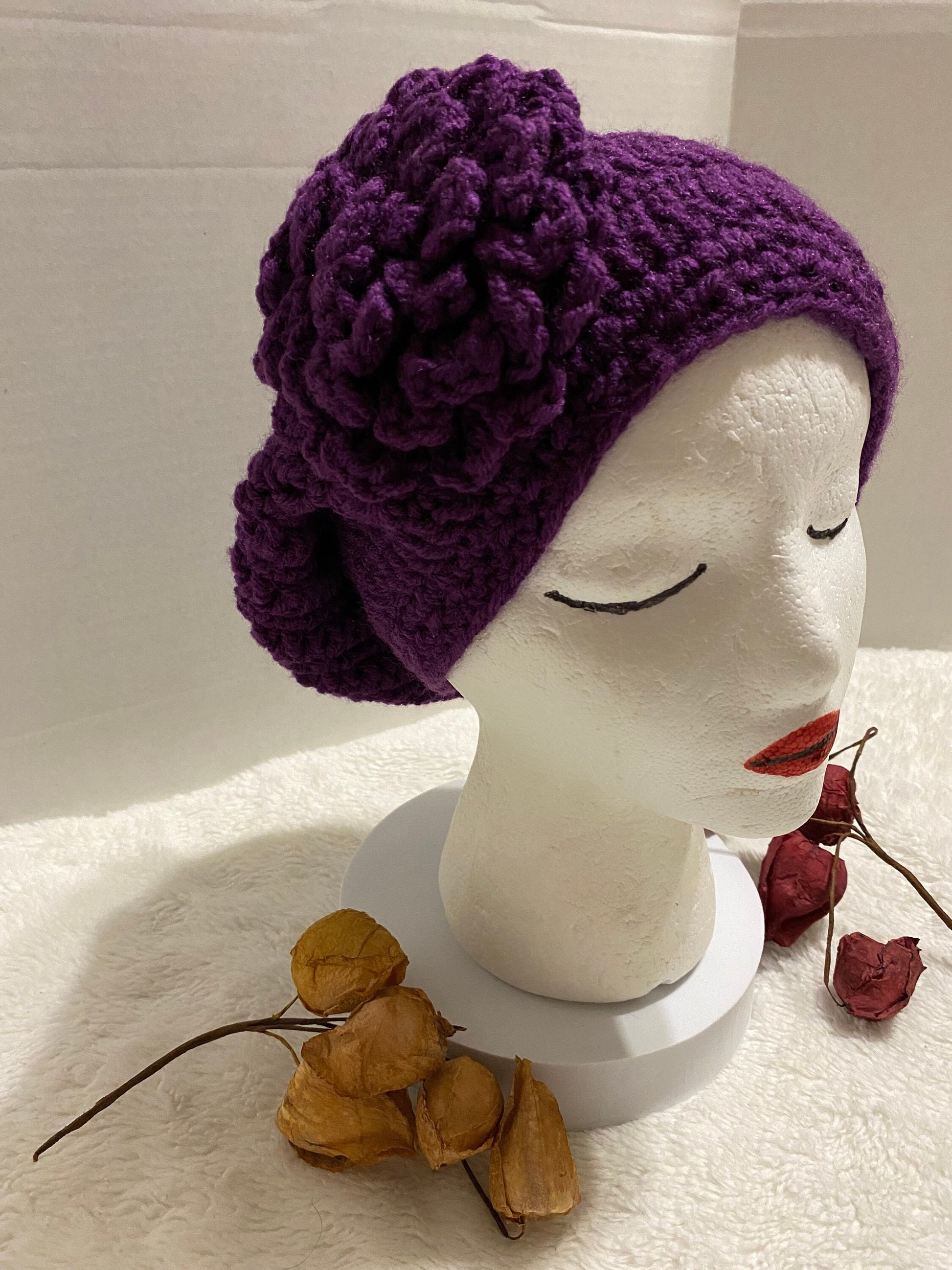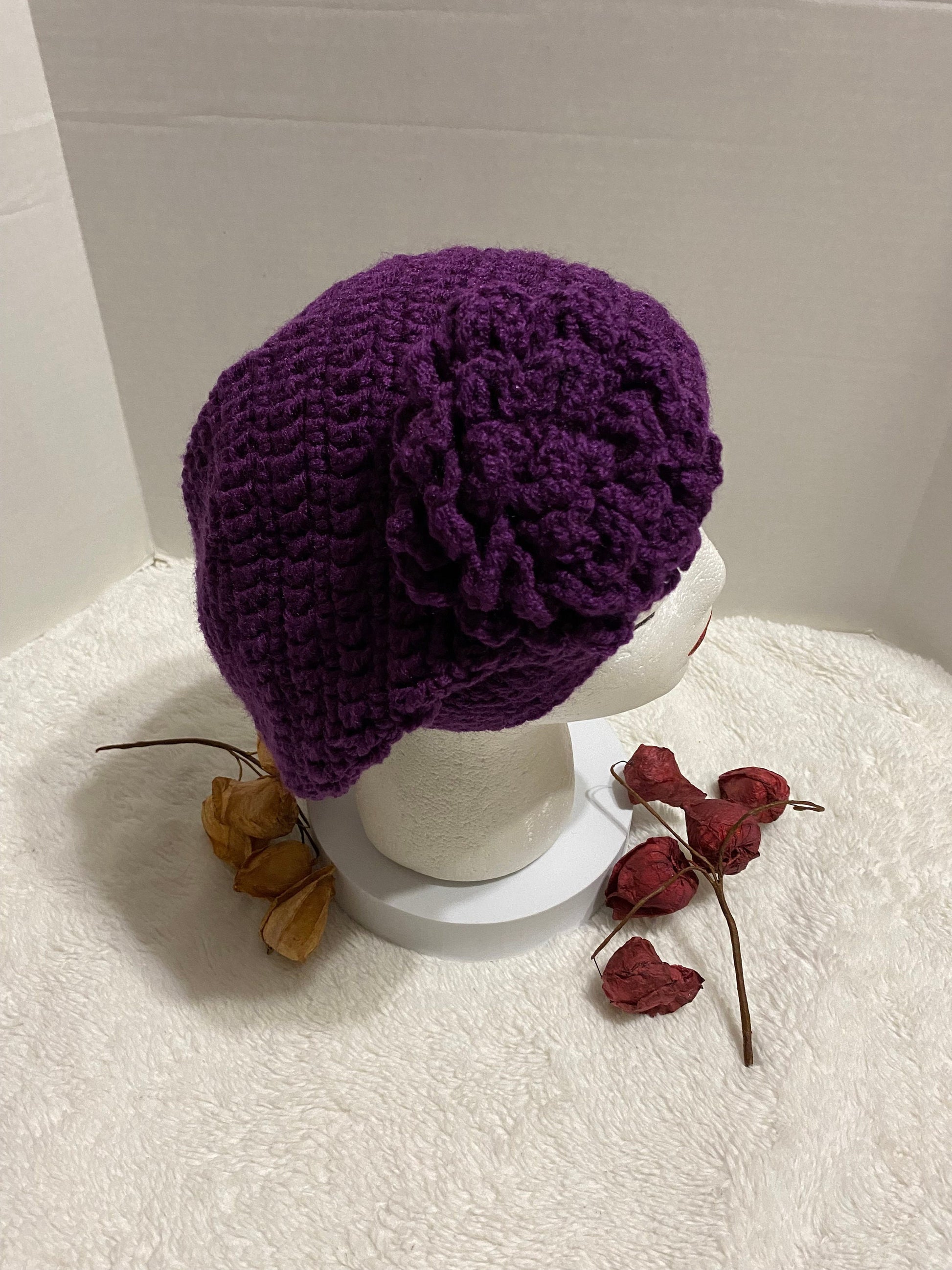 PRODUCT DETAIL - crochet hat purple - crochet flower purple - purple 100% acrylic yarn - Strong, stretchy yarn - Handmade in a clean and safe environment