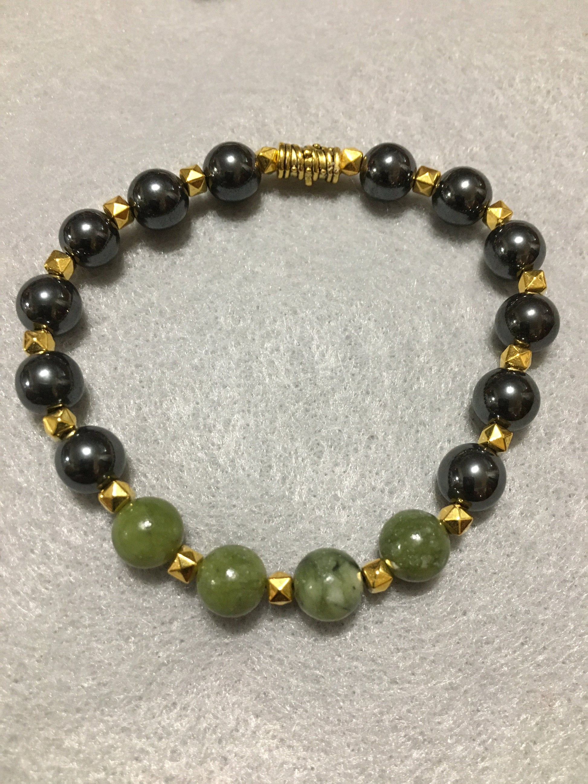 This stunning bracelet features a combination of green jade natural gemstones and natural hematite gemstones, accented with 18k gold plated Hematite Bead details. The vibrant green hues of the jade are beautifully complemented by the metallic shimmer of the hematite. With its eye-catching design and luxurious accents, this bracelet is a true gemstone treasure. Perfect for adding a touch of elegance and sophistication to any outfit, this piece will make a marvelous addition to your jewelry collection.