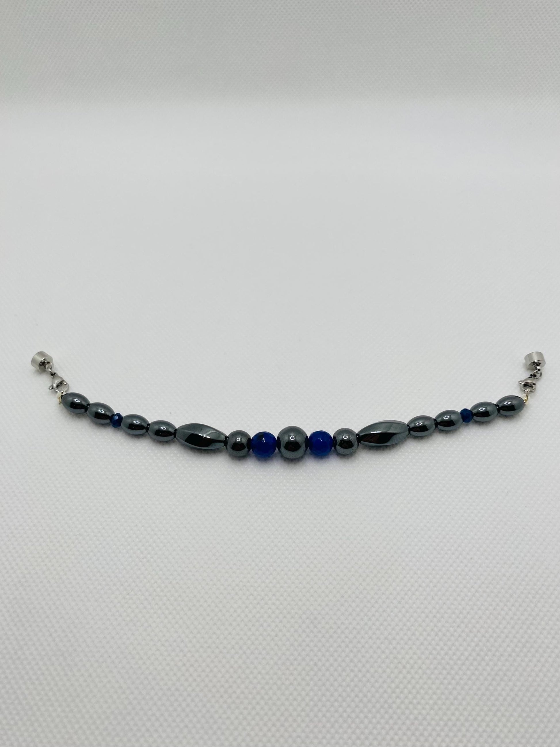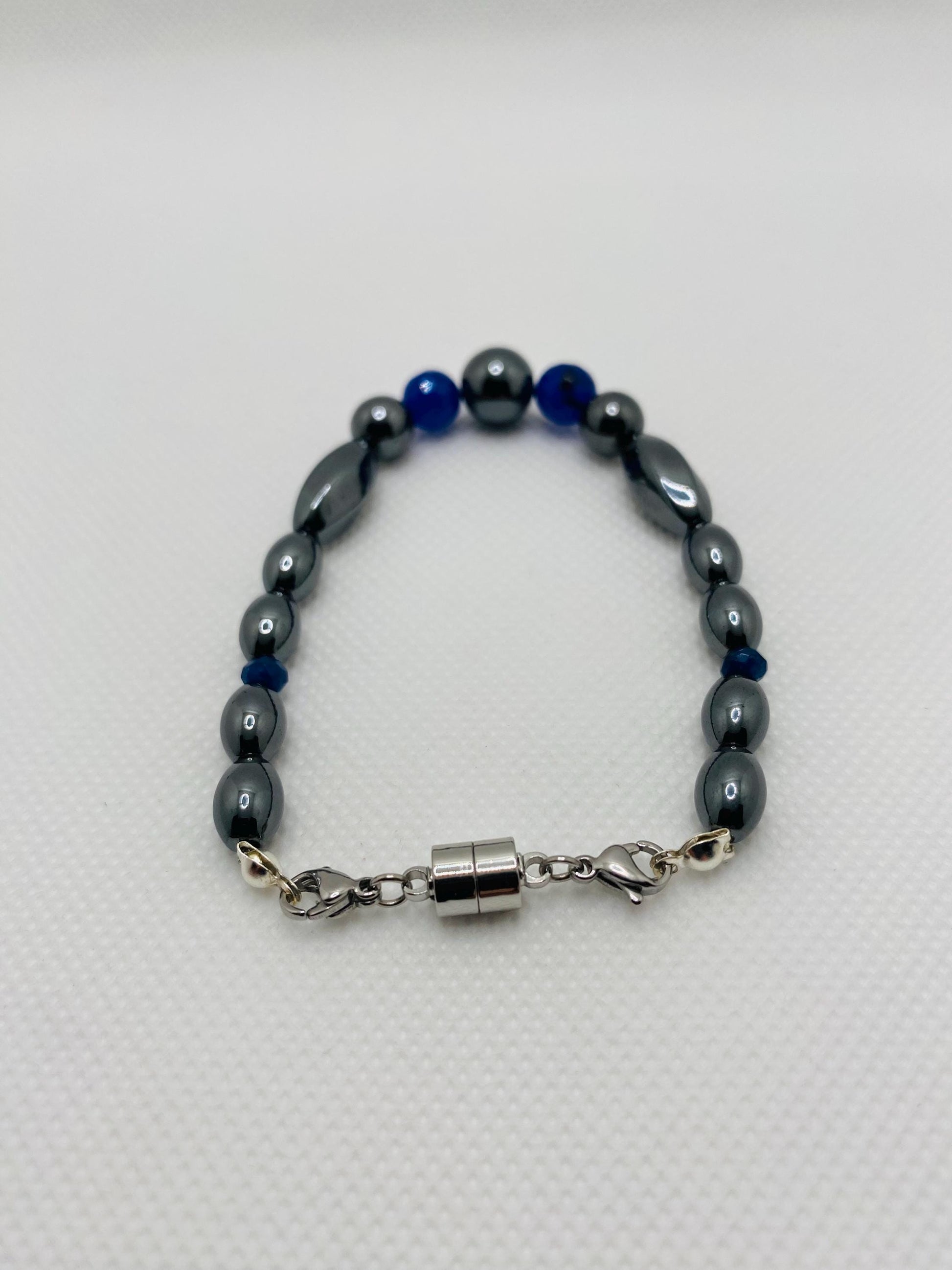 Product Details: 8mm Beautiful Black round Hematite Gemstone Beads. 10mm Beautiful Black round Hematite Gemstone Bead. 8x12mm Beautiful Swirl Black Hematite Gemstone Beads. 5x9mm Beautiful Oval Black Hematite Gemstone Beads. 8mm Natural Sapphire Blue Chalcedony Faceted Gemstone Beads. 4mm Natural Faceted Lapis Lazuli Gemstone Beads. Silver Plated Magnetic Clasp. .8mm Super Strong Stretchy Cord. 100% Handmade and Assembled in a Clean and Safe Environment.